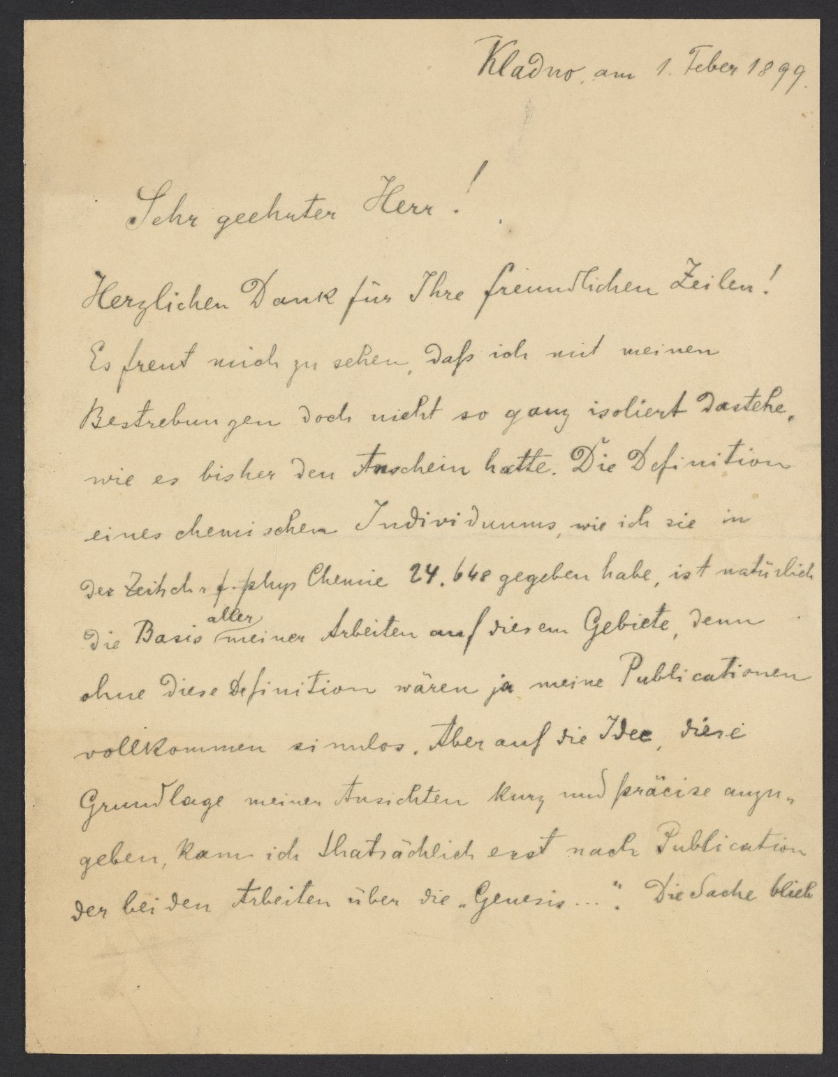 Herzlichen Dank für Ihre freundlichen Zeilen! Es freut mich zu sehen, dass ich und meinen Bestrebungen doch nicht so ganz isoliert dastehe, wie es bisher den Anschein hatte. Die Definition eines chemischen Individuums, wie ich sie in der Zeitschrift f. phys. Chemie 24.648 gegeben habe ist natuerlich die Basis aller meiner Arbeiten auf riesem Gebiete, denn ohne diese Definition waeren ja meine Publikationen vollkommen sinnlos. Aber auf die Idee diese Grundlage meiner Ansichten kurz und präcise anzugeben, kann ich thatsächlich erst nach der Publication der beiden Arbeiten über die „Genesis…“ Die Sache blieb