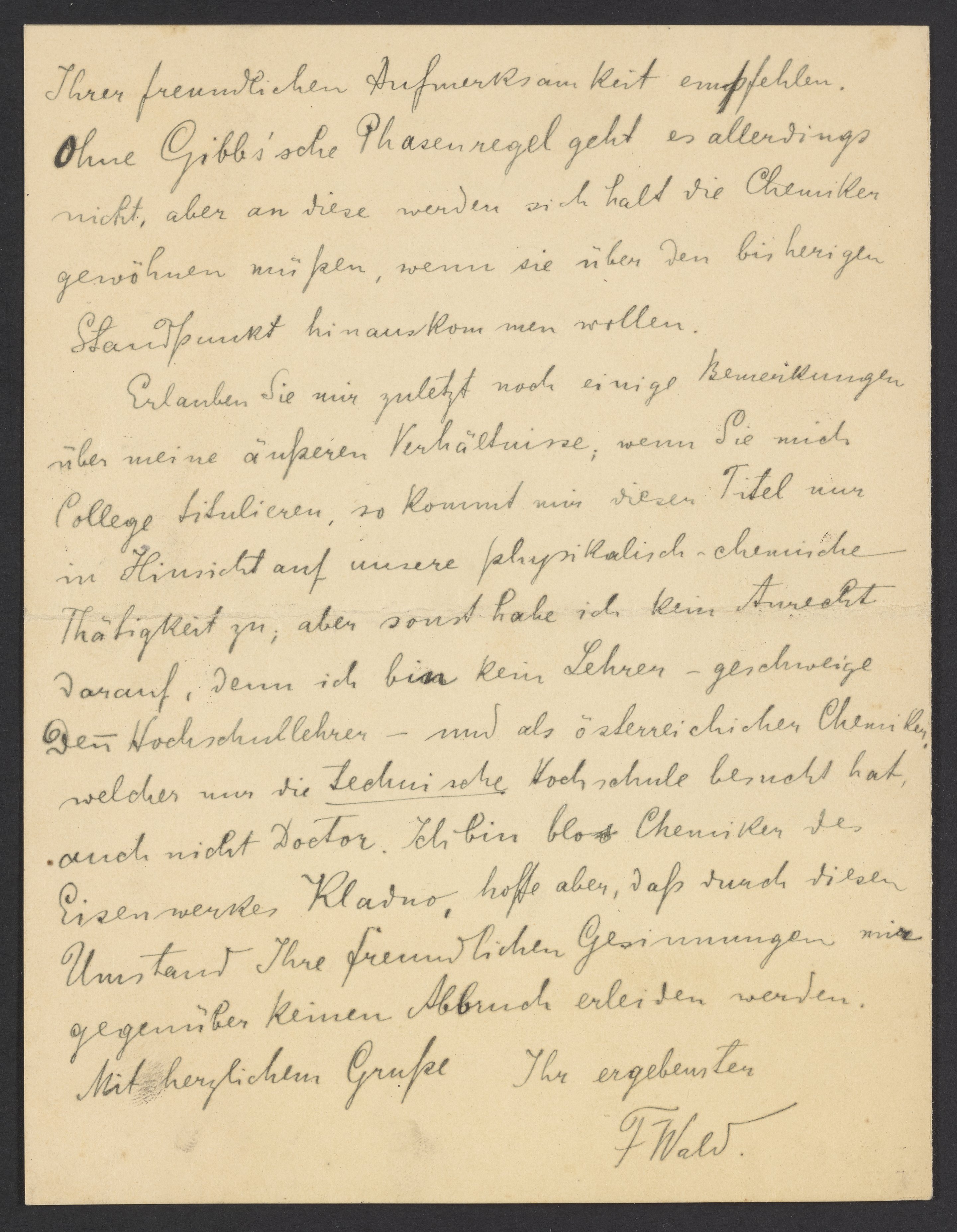 Erlauben Sie mir zuletzt noch einige Bemerkungen über meine äußeren Verhältnisse, wenn Sie mich College titulieren, so kommt mir diesen Titel nur in Hinsicht auf unsere physikalisch-chemische Thätigkeit zu; aber sonst habe ich kein Anrecht darauf, denn ich bin kein Lehrer – geschweige den Hochschullehrer – und als österreichischer Chemiker, welcher nur die technische Hochschule besucht hat, auch nicht Doctor. Ich bin blos Chemiker des Eisenwerkes Kladno, hoffe aber, daß durch diesen Umstand Ihre freundlichen Gesinnungen mir gegenüber keinen Abbruch erleiden werden.