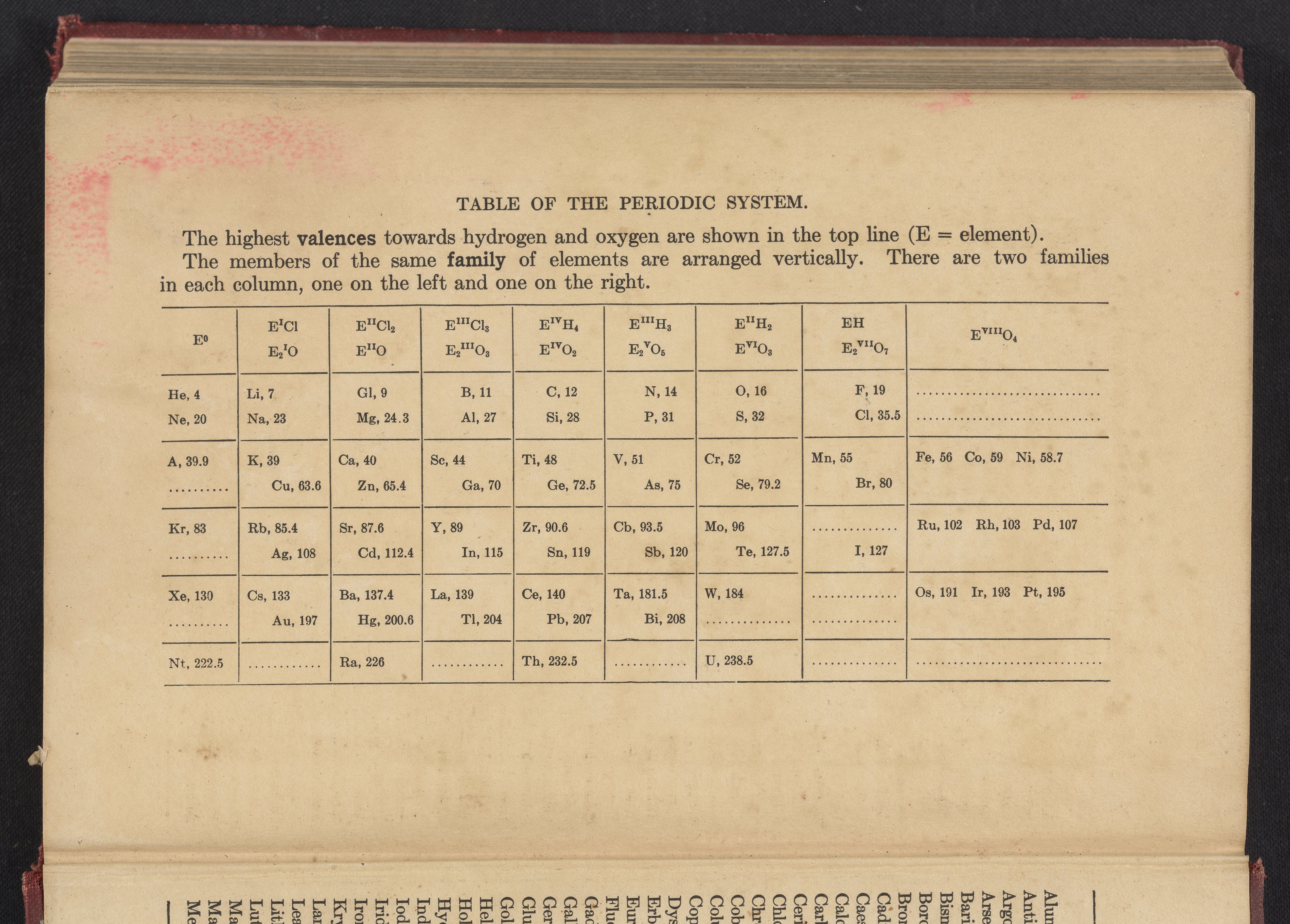 Small JPG1200 x 1810px — 296 KBLarge JPG2880 x 4343px — 2.1 MBFull-sized JPG3470 x 5233px — 3.0 MBOriginal fileTIFF — 3470 x 5233px — 52.0 MBPreface describes how this chemistry textbook contains an intermediate level of instruction, being more advanced than elementary chemistry but not as comprehensive as college chemistry. The modified periodic table of elements found within this work differs from Dmitry Ivanovich Mendeleyev's (1834-1907) version as explained in the text. Only the pages pertaining to the modified periodic table of elements and a selection of plates have been digitized from this work.