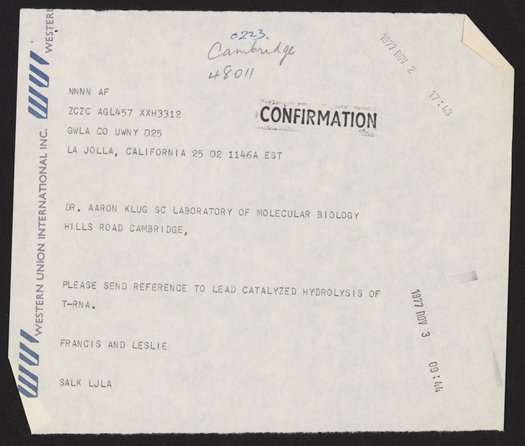 Klug, A. (Aaron), Sir. “Telegram from Aaron Klug to Francis and Leslie Crick, November 2, 1977,” November 2, 1977. History of Molecular Biology Collection, Box 20, Folder 1. Science History Institute. Philadelphia. https://digital.sciencehistory.org/works/sx6v5qt.