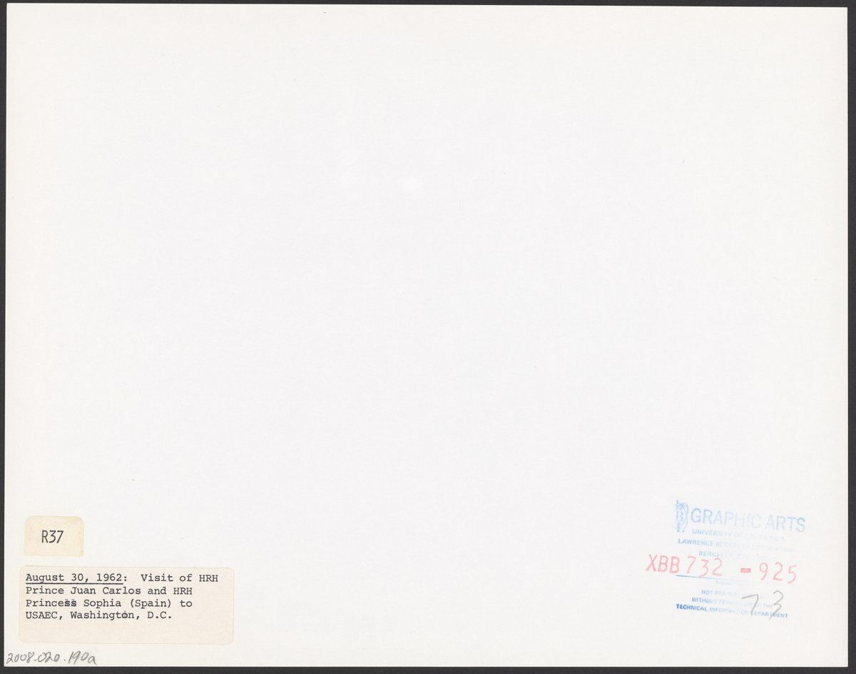 Lawrence Berkeley National Laboratory. Technical and Electronic Information Department. “Spanish Royalty Visit the U.S. Atomic Energy Commission,” August 30, 1962. Records of the Lawrence Berkeley National Laboratory - Nuclear Division, Box 6. Science History Institute. Philadelphia. https://digital.sciencehistory.org/works/szw6l5r.