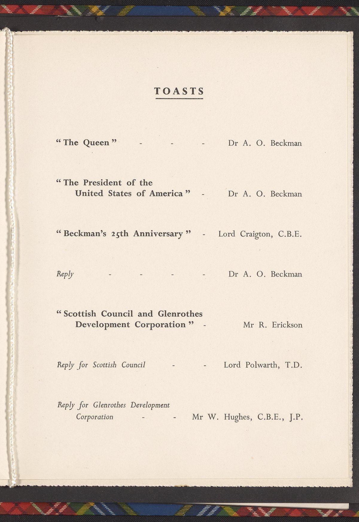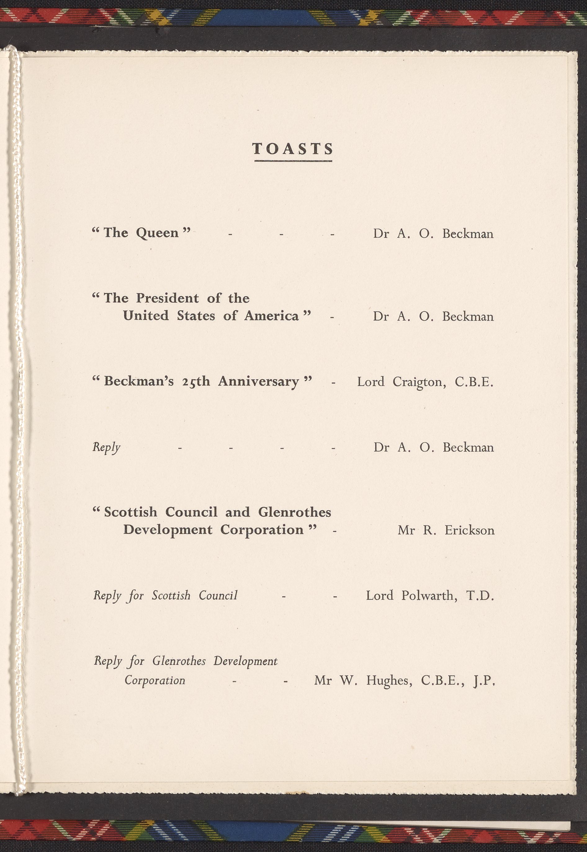 Small JPG1200 x 1017px — 139 KBLarge JPG2880 x 2442px — 760 KBFull-sized JPG3350 x 2840px — 991 KBOriginal fileTIFF — 3350 x 2840px — 27.3 MBAn invitation to an anniversary dinner held on September 20, 1960 at the Caledonian Hotel in Edinburgh. In addition to a menu (featuring such delicacies as Tortue Verte Boulevard Pasadena and Soufflé Surprise à la Beckman) and list of toasts, the invitation includes a list of the Corporate Board of Directors of Beckman Instruments, Inc., the British Board of Directors of Beckman Instruments, Ltd., and a guest list.