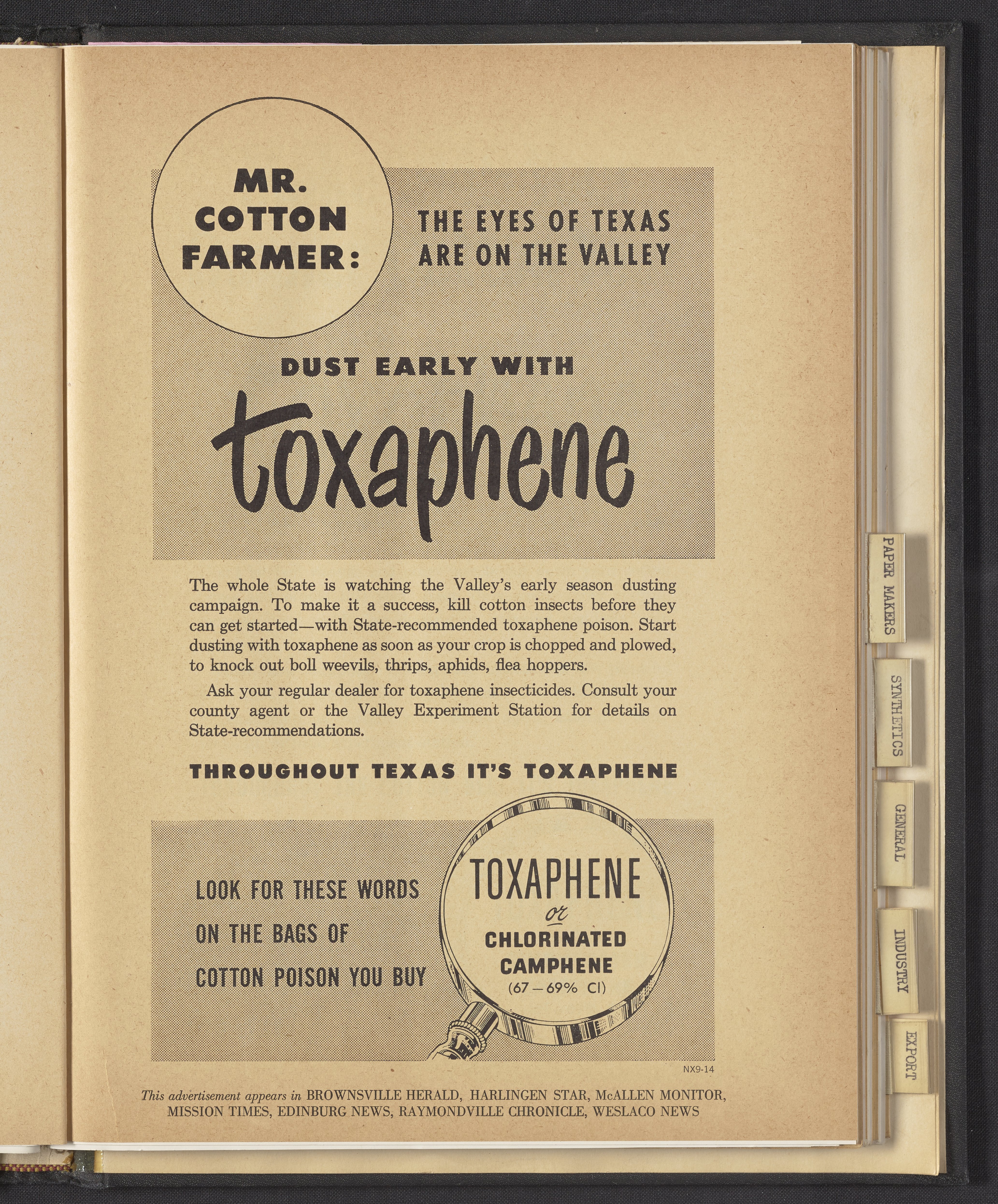 Hercules Incorporated. “Mr. Cotton Farmer: The Eyes of Texas Are on the Valley.” 1949 Hercules Advertisements, 1949. Records of Hercules Incorporated, Volume 1949. Science History Institute. Philadelphia. https://digital.sciencehistory.org/works/t148fh916.