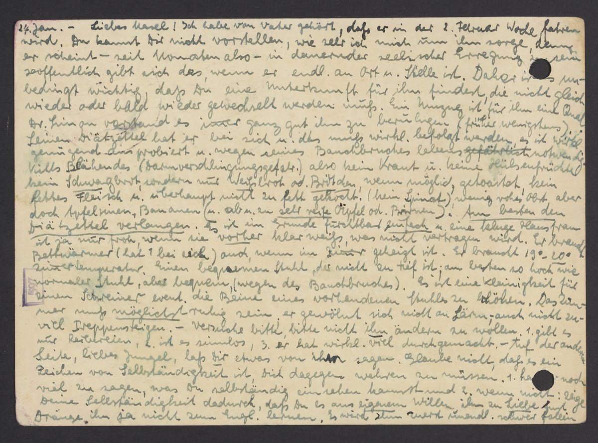 Liebes Maxel! Ich habe von Vater gehört, dass er in der 2. Februar Woche fahren wird. Du kannst Dir nicht vorstellen wie sehr ich mich um ihn sorge, denn er scheint – seit Wochen also – in dauernder seelischer Erregung zu sein. Hoffentlich gibt sich das, wenn er endlich am Ort u. Stelle ist. Daher ist es unbedingt wichtig, daß Du eine Unterkunft für ihn findest, die nicht gleich wieder oder bald wieder gewechselt werden muß. Ein Umzug ist für ihn eine Qual. Dr. Simon verstand es immer ganz gut ihn zu beruhigen (früher wenigstens). Seinen Diätzettel hat er bei sich u. das muß wirklich befolgt werden, es ist wirklich genügend ausprobiert u. wegen seines Bauchbruches lebensnotwendig.. Nichts Blähendes (Darmverschlingungsgefaehr) also kein Kraut u. keine Hülsenfrüchte, kein Schwarzbrot, sondern nur Weißbrot oder Brötchen, wenn möglich, getoastet, kein fettes Fleisch u. ueberhaupt nicht zu fett gekocht! Kein Spinat, wenig rohes Obst aber doch Apfelsinen, Bananen (u. ab u. zu sehr reife Äpfel od. Birnen). Am besten den Diätzettel verlangen. Es ist im Grunde furchtbar einfach u. eine kluge Hausfrau ist ja nur froh, wenn sie vorher klar weiß, was nicht vertragen wird. Er braucht Bettwärmer (hat 1 bei sich) auch, wenn ein Zimmer geheizt ist. Er braucht 19-20 Grad Zimmertemperatur, einen bequemen Stuhl, der nicht zu tief ist; am best so hoch wie normaler Stuhl, aber bequem (wegen des Bauchbruches). Es ist eine Kleinigkeit fuer einen Schreiner event. die Beine eines vorhandenen Stuhles zu behöhen. Das Zimmer muss möglichst ruhig sein. Er gewöhnt sich nicht an Lärm, auch nicht zu viel Treppensteigen. – Versuche bitte, bitte nicht ihm ändern zu wollen. 1. gibt es nur Reibereien, 2. ist es sinnlos, 3. er hat wirklich viel durchgemacht. Auf der anderen Seite, liebes Jungen, laß Dir etwas von ihm sagen. Glaube nicht, daß es ein Zeichen von Selbständigkeit ist, Dich dagegen wehren zu müssen. Ich habe noch viel zu sagen, was Du selbstständig einsehen kannst und 2. wenn nicht: zeige Deine Selbstfähigkeit dadurch, daß es auch eigenem Willen ihm zu Liebe tust. Dränge ihn ja nicht zum Englisch lernen. Es wird ihm schon zuerst unendlich schwer fallen