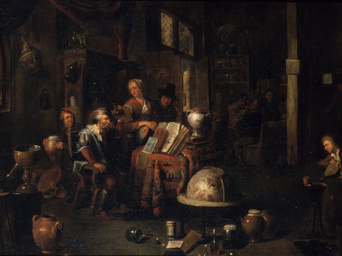 This lively and richly decorated chamber presents an alchemist's workshop which is busy, productive, and filled with customers and assistants. At center, the alchemist himself--dressed in a fine satin coat with slash sleeves--sits examining a flask of urine for a young female customer and her older chaperone. A table covered with a luxurious carpet and many books sits before him, as well as a celestial globe and numerous earthenware vessels. At left and right, young assistants carry jars and tend small braziers with bellows. The shop is decorated with a paper print pinned to a beam, a taxidermied reptile specimen hung from above, and shelves of glassware. To the back of the scene, a small crowd surrounds a dentist and his patient to watch a tooth being pulled.