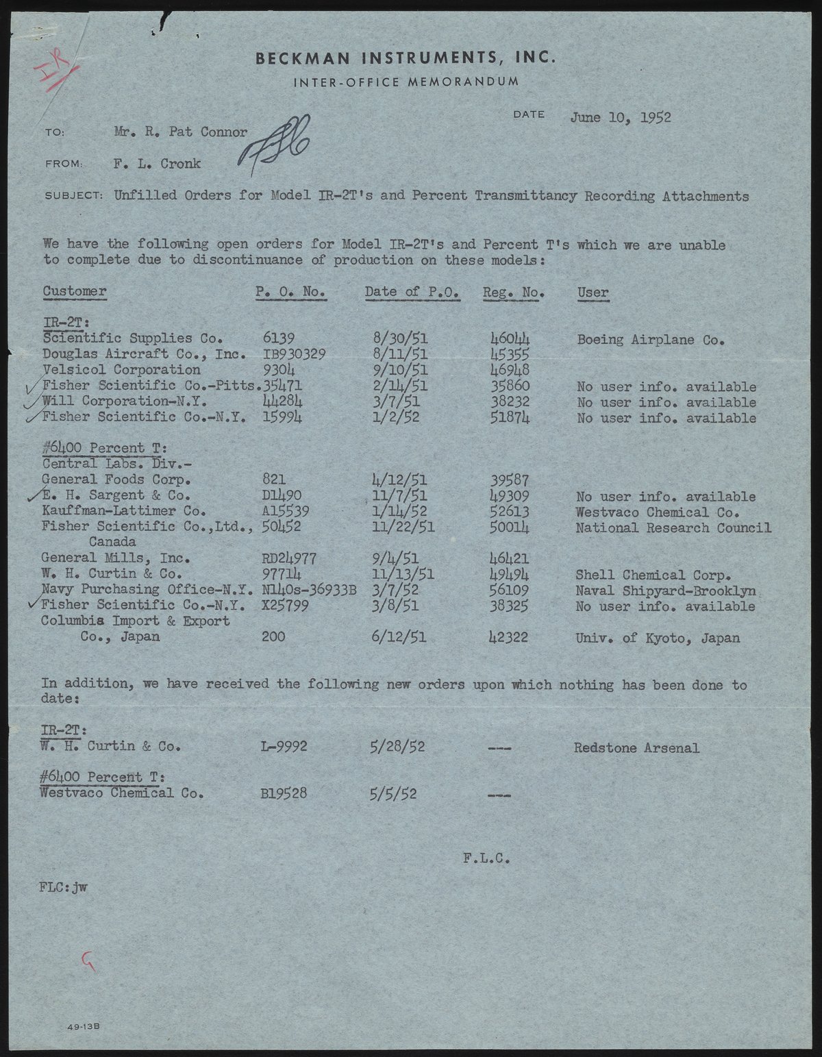 This internal memo contains a list of open orders for Beckman Instruments IR-2T Spectrophotometers in June of 1952. The IR-2T was discontinued due to problems that became apparent after the product was already on the market, so Beckman Instruments had to decide how to proceed with the existing open, but unfilled, orders.