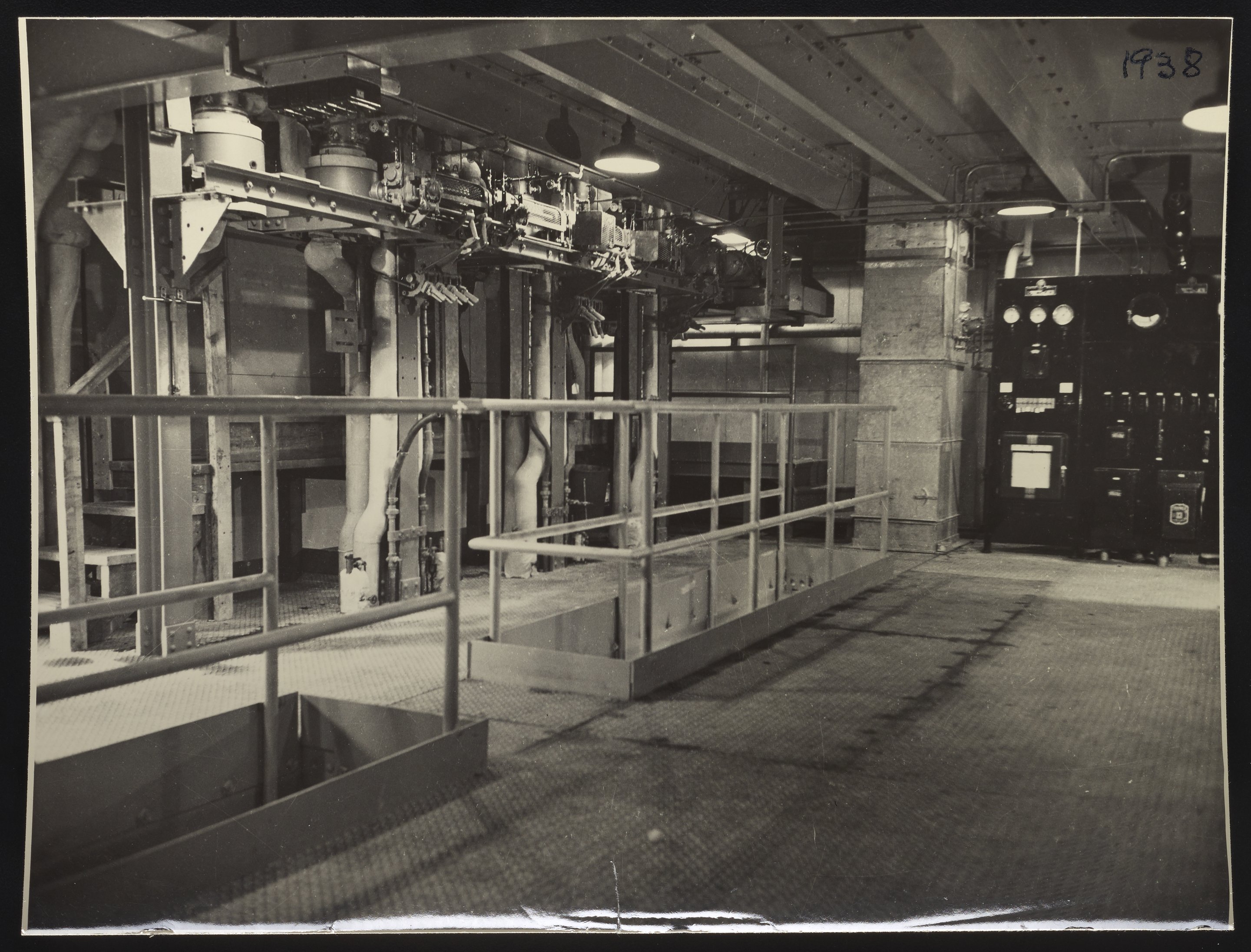 General view of the second floor of the Spinning Room during the early stages of nylon production and research at the DuPont pilot plant in Wilmington, Delaware. Visible on the left-hand side of the photograph are steam pipes that were used to expose the newly-spun nylon yarn to moisture, which stabilized the fiber and allowed it be wound onto a bobbin.