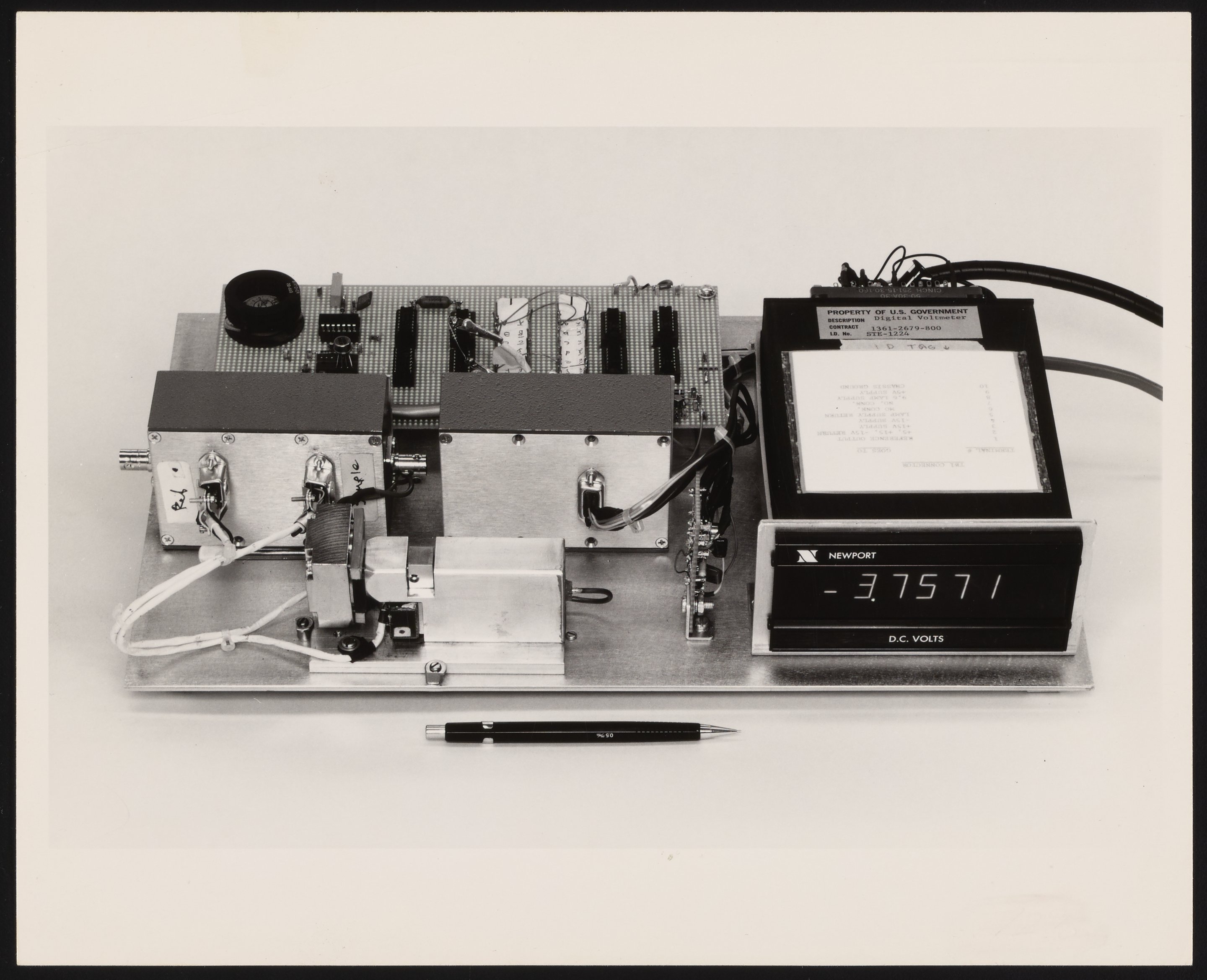 This prototype was designed by Beckman Instruments' Advanced Technology Operations (ATO) for NASA in 1974 for measuring the carbon dioxide inside space suit helmets. It was intended for use in manned spaceflight missions involving an Advanced Extravehicular Mobility Unit and an infrared carbon dioxide monitoring device. As of 1976 this device was scheduled to be deemed "flight qualified" pending a reduction in volume and weight.