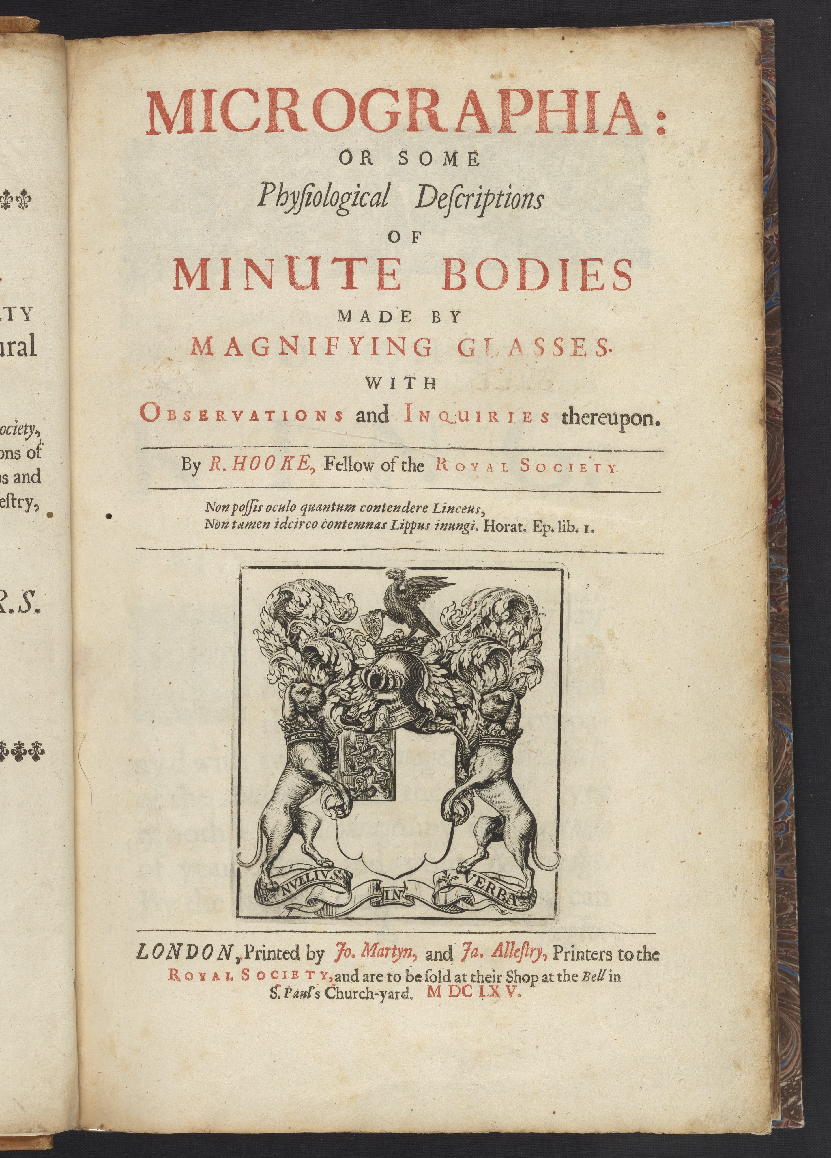 Hooke, Robert. “Title Page from Robert Hooke's Micrographia.” In Micrographia : or, Some Physiological Descriptions of Minute Bodies Made by Magnifying Glasses. With Observations and Inquiries Thereupon. London, England: J. Allestry, 1665. https://digital.sciencehistory.org/works/t722h981f.