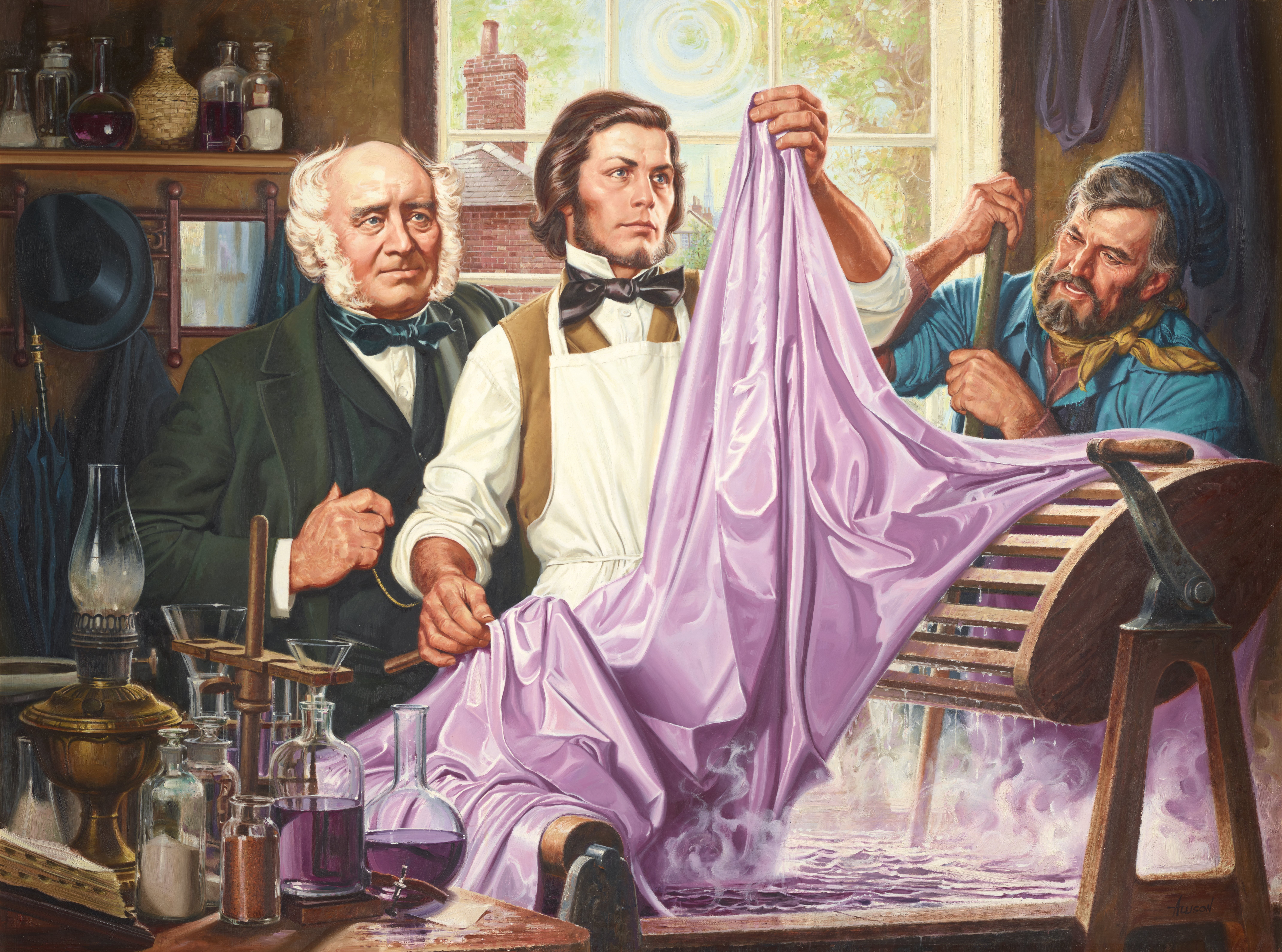 William Henry Perkin depicted in his laboratory. Perkin, center, examines test dyeing of silk taffeta with mauve aniline dye. Left, his father, the backer of the plant, stands behind Perkin and admires the fabric. In the foreground, on the table is a small bottle of bronze crystals, which produce mauve dye when dissolved in very hot water. Also on the table, dye jigs used at the time for dyeing small amounts of fabric.