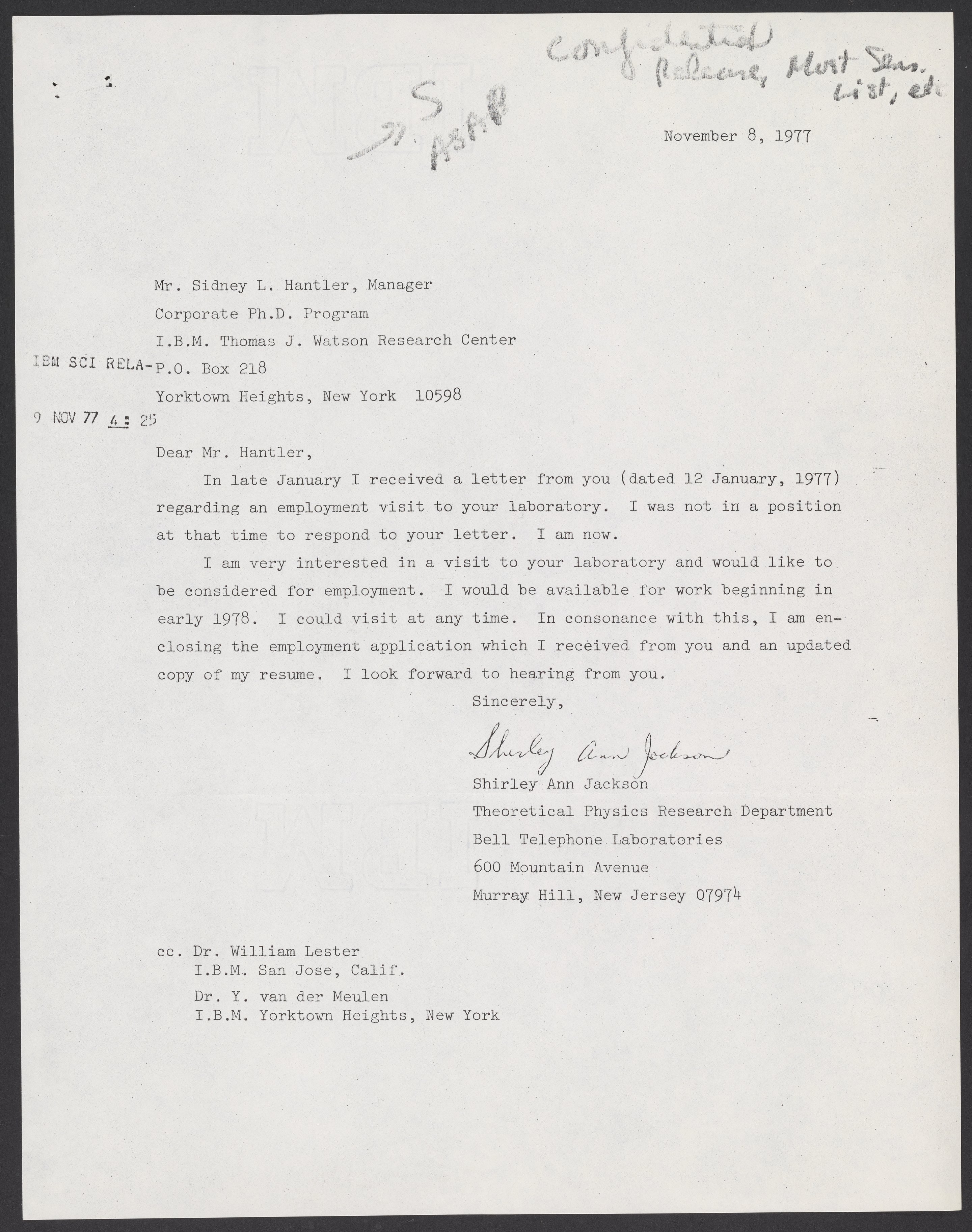 Shirley Ann Jackson (1946-) writes to Sidney L. Hantler, informing him that she would like to be considered for employment at the IBM Thomas J. Watson Research Center.