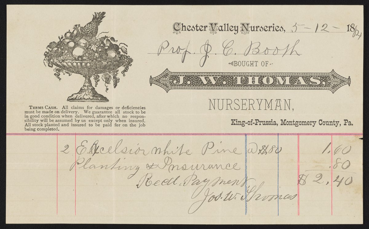 Thomas, Joseph W. “Receipt from J.W. Thomas of Chester Vallery Nurseries,” May 12, 1884. Papers of James Curtis Booth, Box 2, Folder 10. Science History Institute. Philadelphia. https://digital.sciencehistory.org/works/ta13yu2.