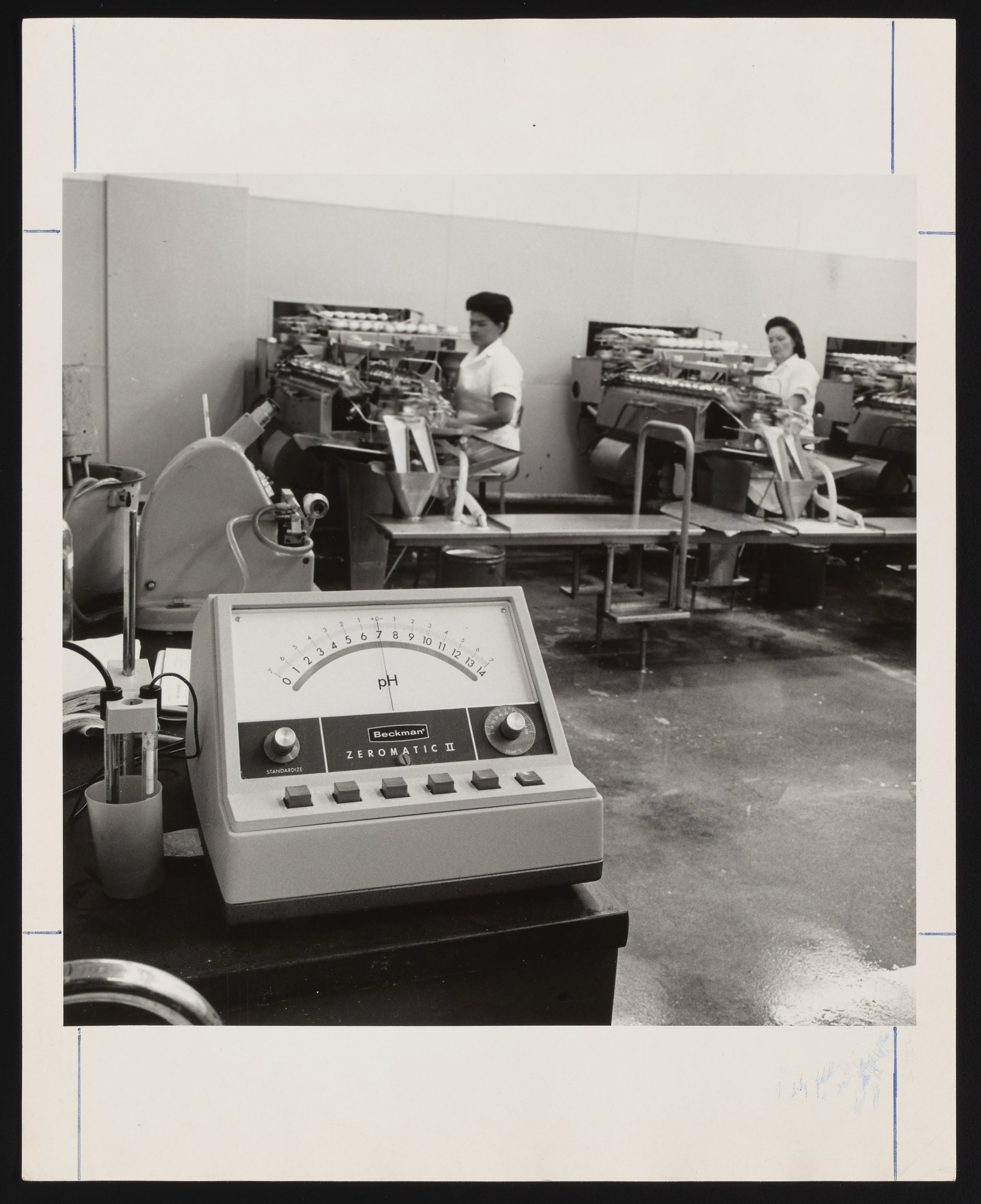 Beckman Zeromatic II pH meter, with two workers at benches in the background