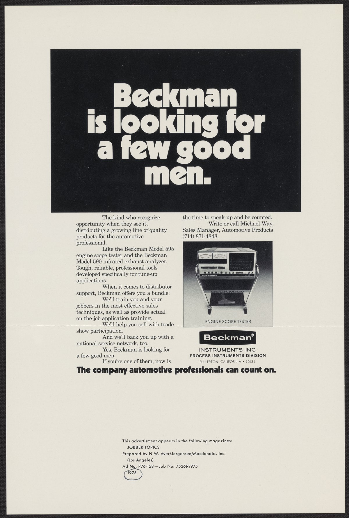 N.W. Ayer & Son, and Inc. Beckman Instruments. “Beckman Is Looking for a Few Good Men.,” 1975. Beckman Historical Collection, Box 49, Folder 35. Science History Institute. Philadelphia. https://digital.sciencehistory.org/works/td96k256m.