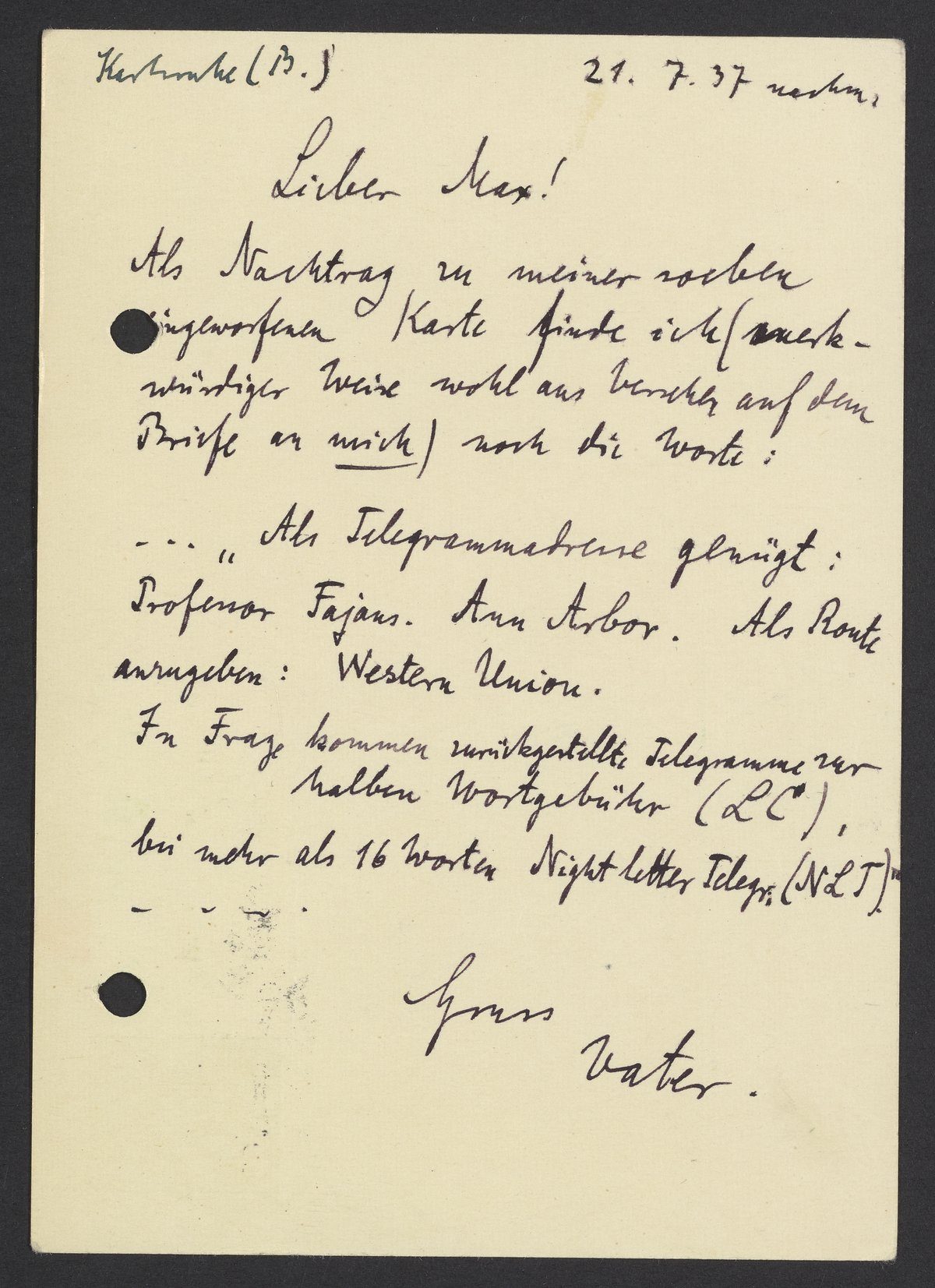 … „ Als Telegrammadresse genügt: Professor Fajans. Ann Arbor. Als Route anzugeben: Western Union. In Frage kommen zurückgestellte Telegramme zur halben Wortgebühr (LC) bei mehr als 16 Worten Night Letter Telegr. (NLT).“ …