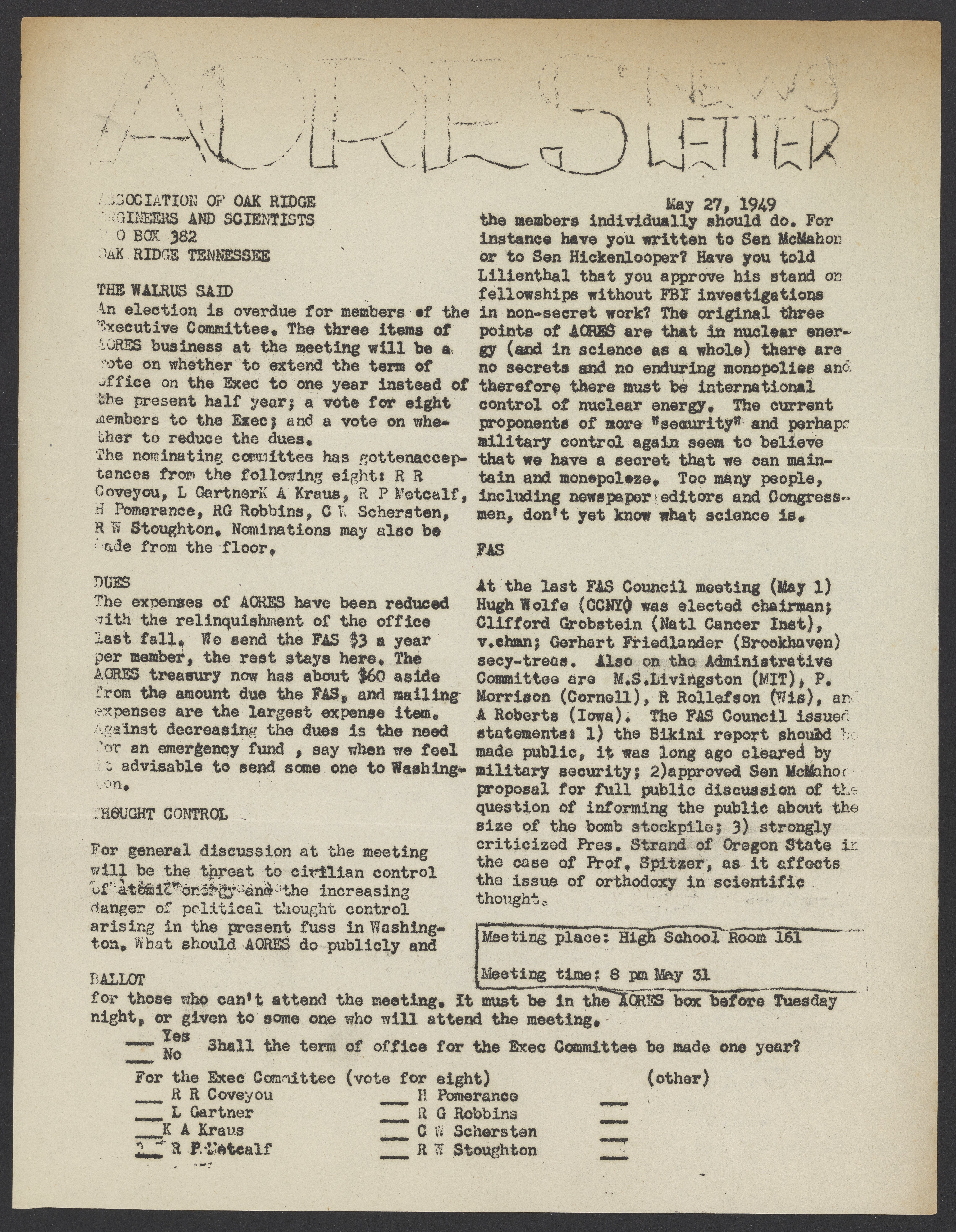 Association of Oak Ridge Engineers and Scientists. “Newsletter for the Association of Oak Ridge Engineers and Scientists (AORES), May 27, 1949,” May 27, 1949. Papers of Georg and Max Bredig, Box 10, Folder 4. Science History Institute. Philadelphia. https://digital.sciencehistory.org/works/tgh9com.