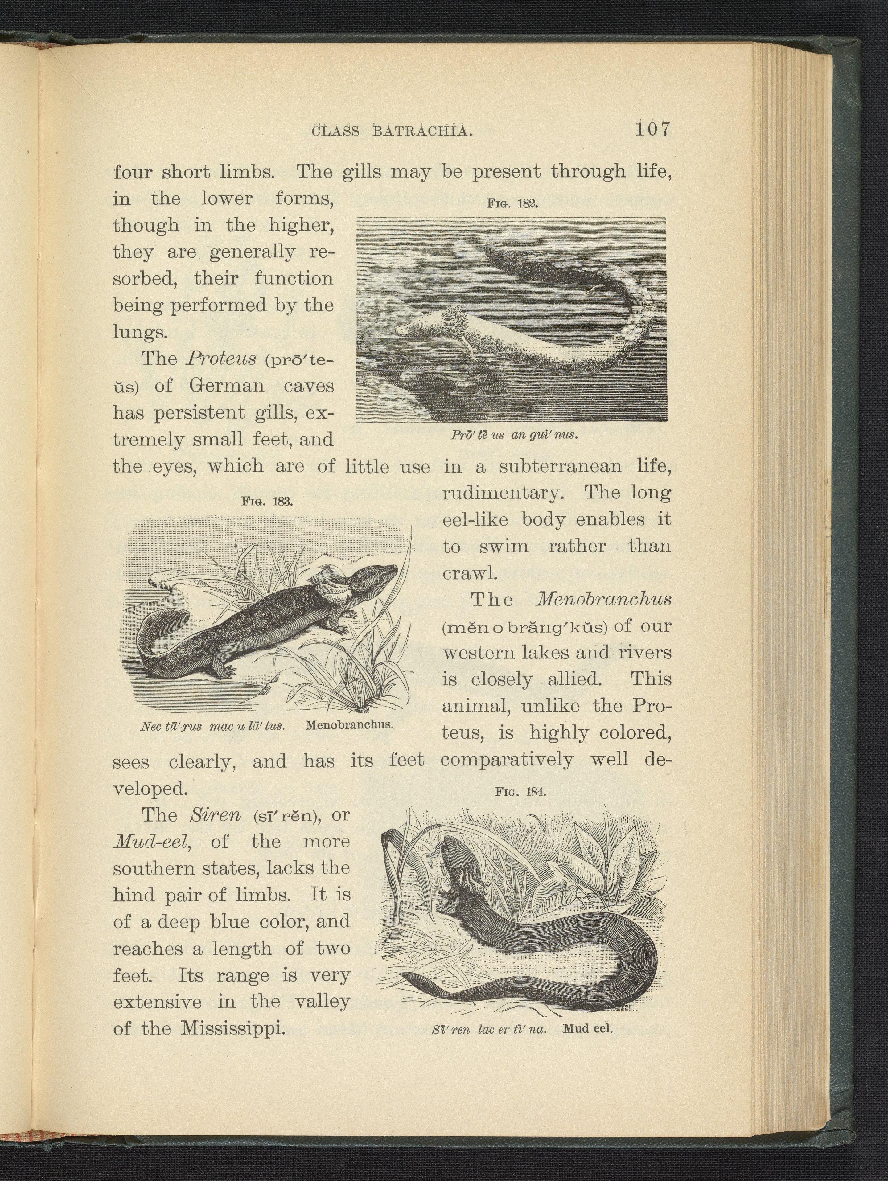 Steele, Joel Dorman, and Jenks, J. W. P. (John Whipple Potter). “Figure 182. Proteus. Figure 183. Menobranchus. Figure 184. Mud Eel.” Popular Zoology. New York, New York: Chautauqua Press, 1887. https://digital.sciencehistory.org/works/th738o7.