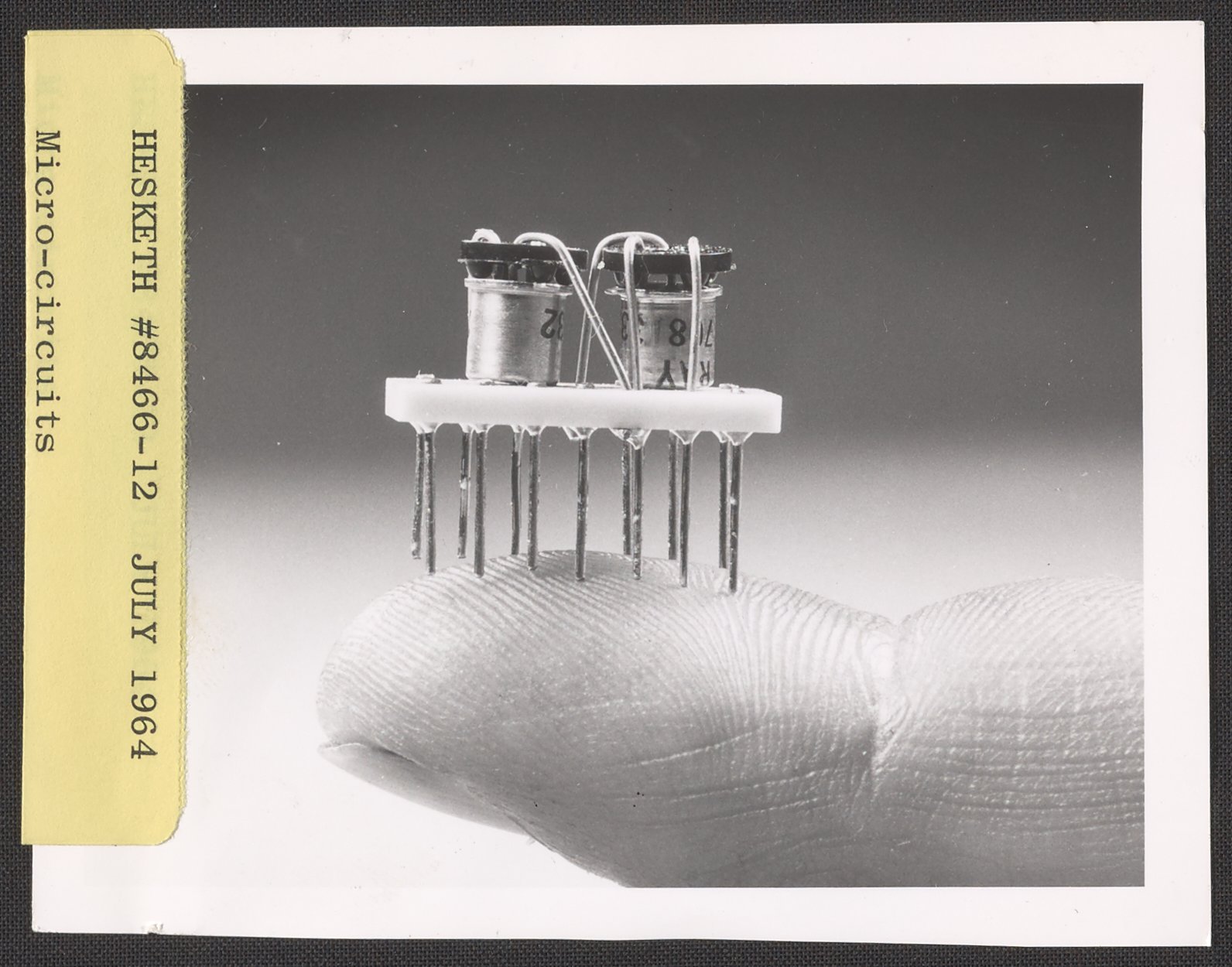 Hesketh, Dean D. “Helipot Custom Microcircuit Balancing on a Fingertip,” July 1964. Beckman Historical Collection, Box 85. Science History Institute. Philadelphia. https://digital.sciencehistory.org/works/th83kz74m.