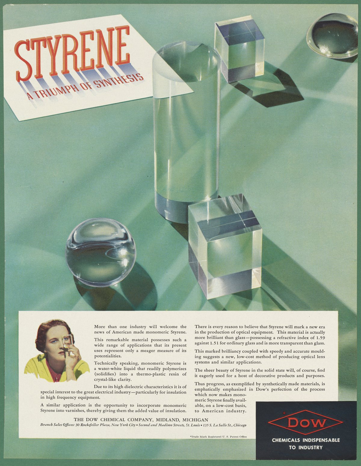 Dow Chemical Company. “Styrene: A Triumph of Synthesis,” 1937. Advertisements from the Dow Chemical Historical Collection, Box 1. Science History Institute. Philadelphia. https://digital.sciencehistory.org/works/th83m054h.