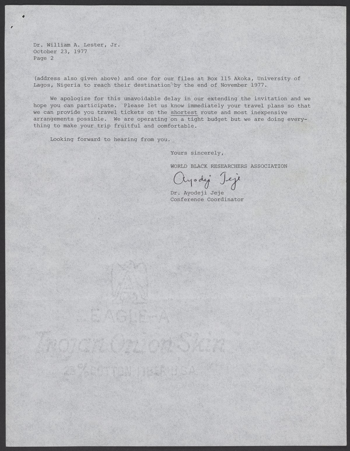 Letter from Ayodeji Jeje to William A. Lester, Jr. (1937-) inviting him to a conference in Lagos, Nigeria sponsored by the World Black Researchers Association (WBRA). Themed "Survival," the conference was about the widening gap between "developed" and "undeveloped" nations.