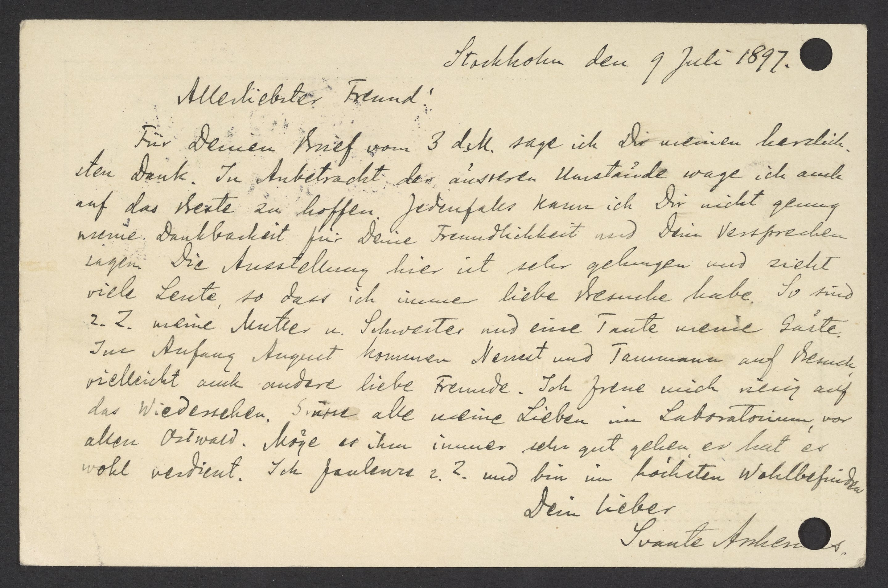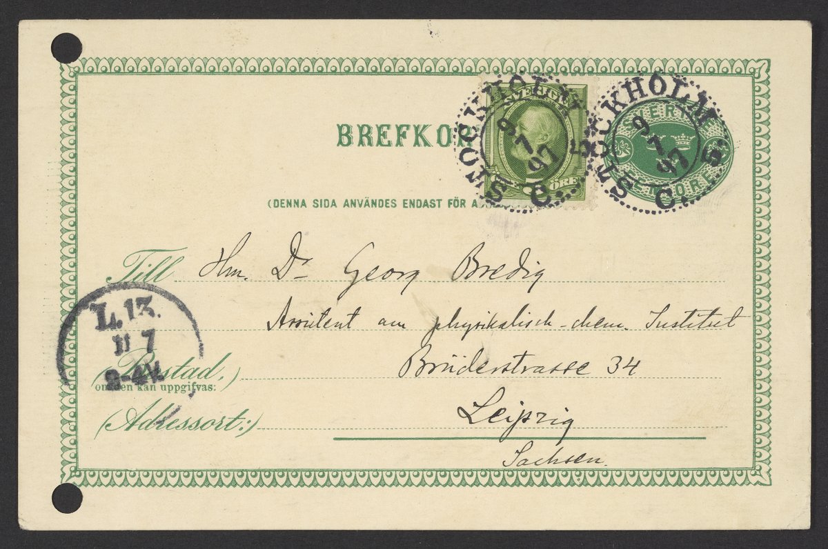 Postcard from Svante Arrhenius to Georg Bredig, July 1897