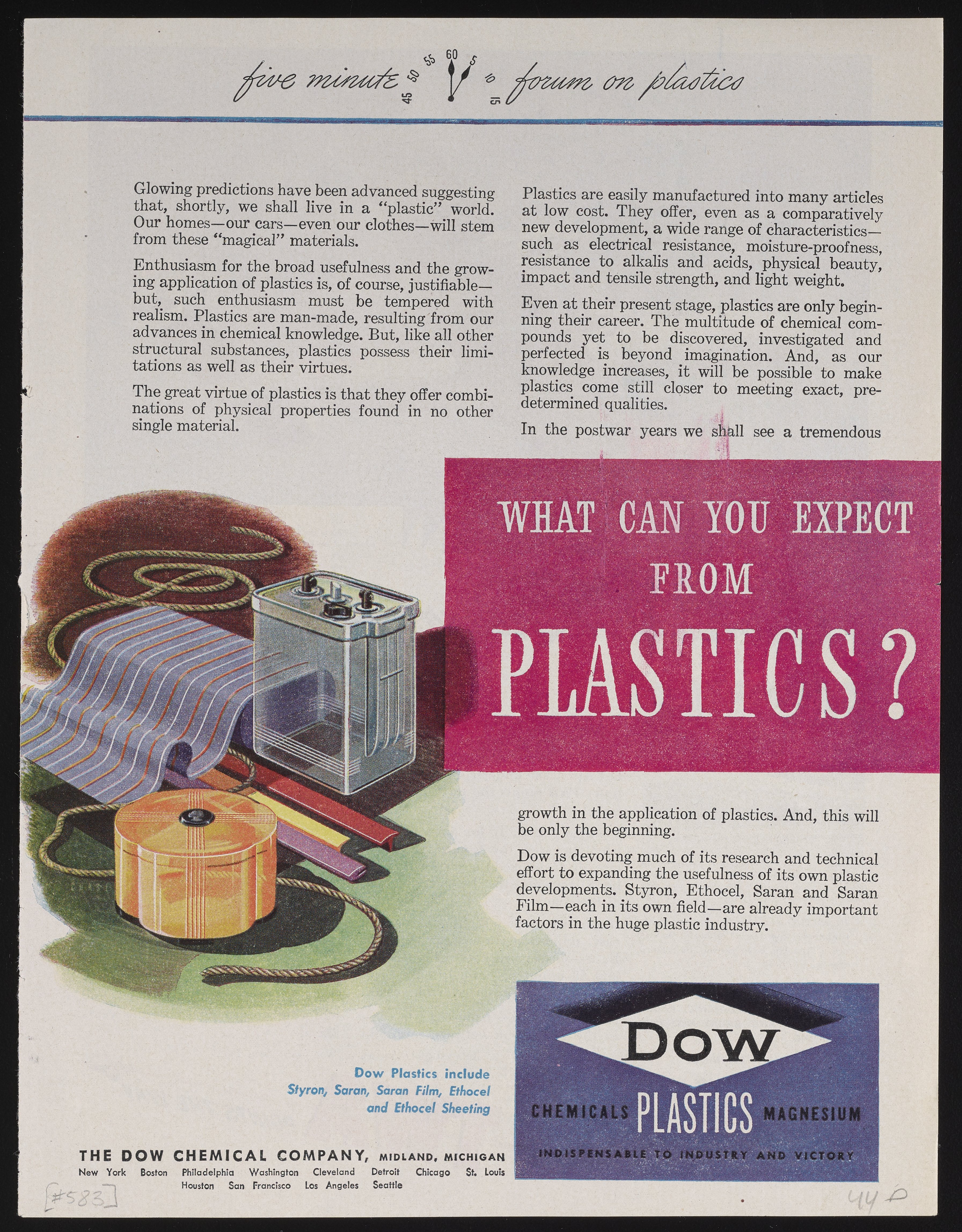 Color print advertisement for Dow Plastics. The advertisment features a color illustration of various plastic containers and packaging. The accompanying text describes advancements in the field of plastics, including three Dow Chemical products: Saran and Saran Film; Ethocel, the brand name for Dow Ethylcellulose; and Styron, the trade name for Dow Styrenic plastics.