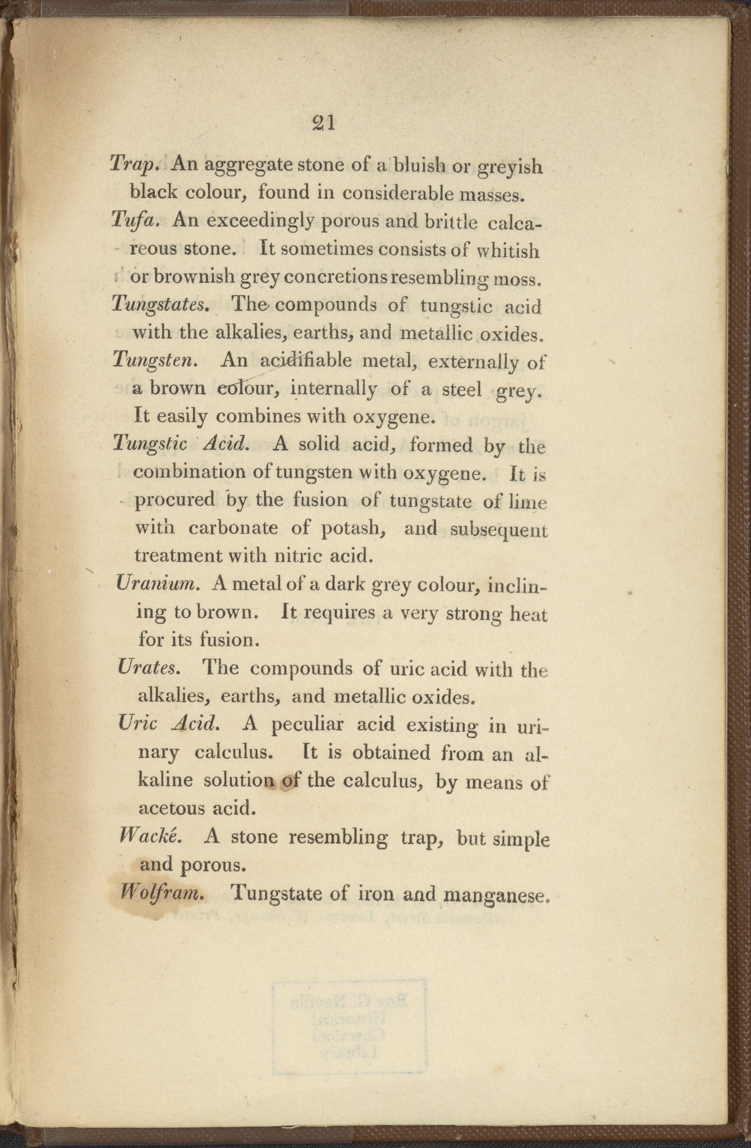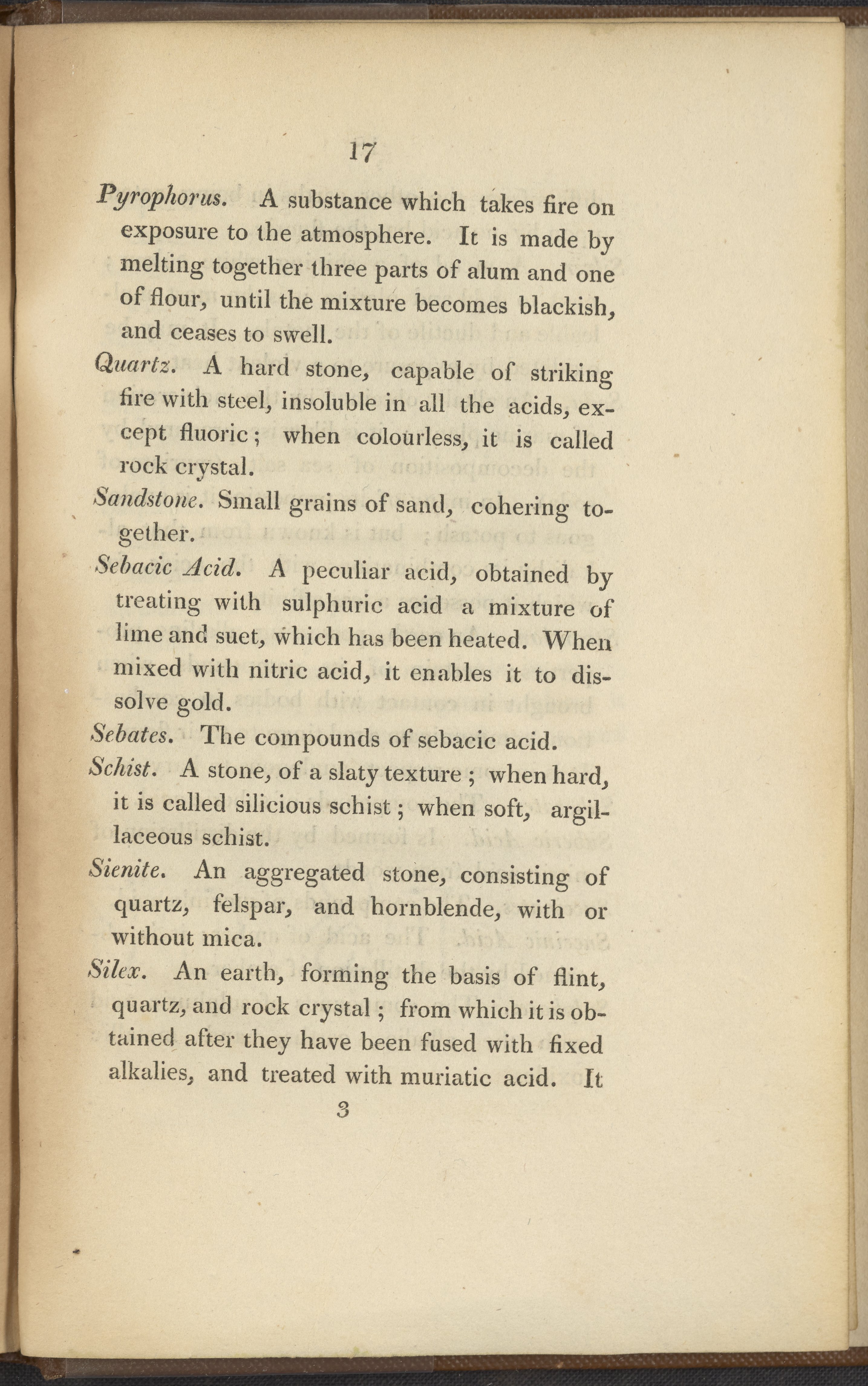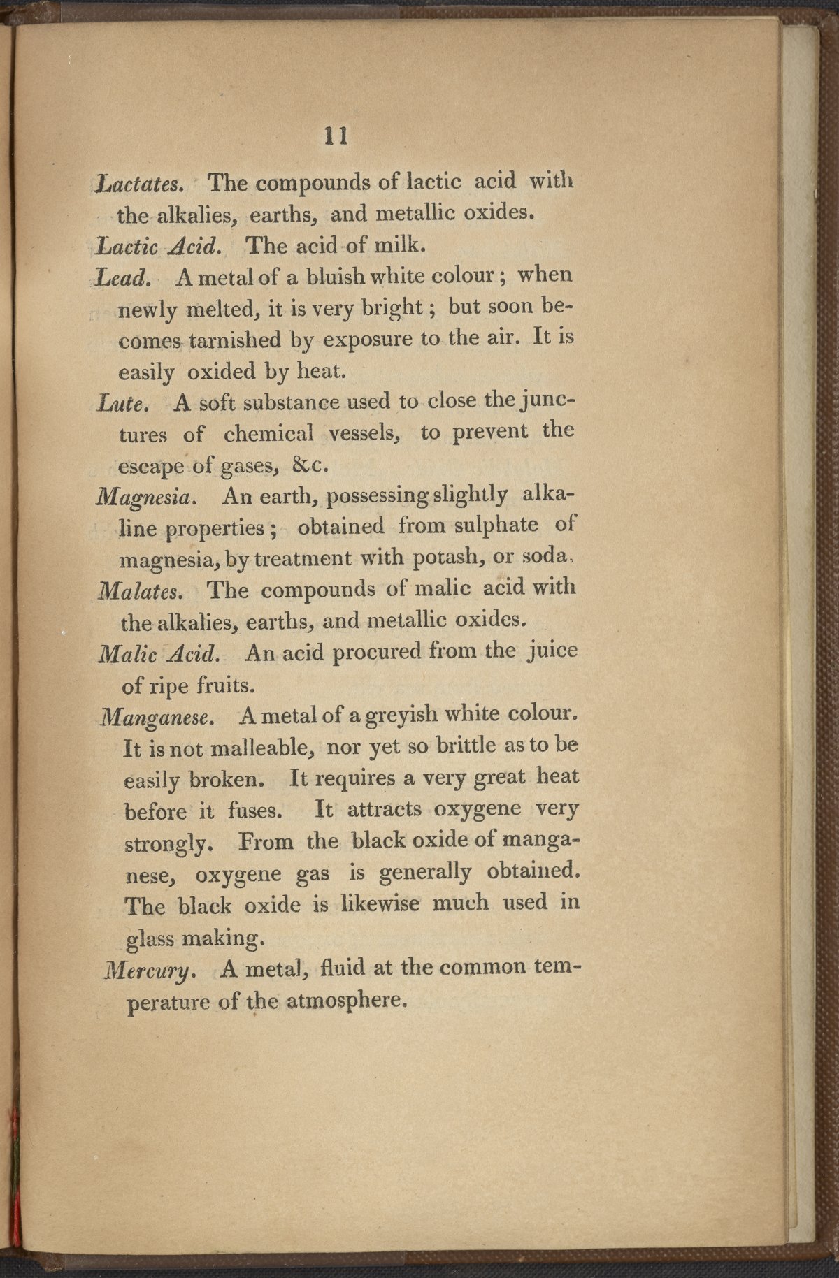 Small JPG1200 x 1918px — 272 KBFull-sized JPG2846 x 4550px — 1.5 MBOriginal fileTIFF — 2846 x 4550px — 37.1 MBJohn Sadler (1779-1838) was a British chemist and metallurgist. Sadler worked as a chemical assistant at the Royal Institution, London, assisting chemist Humphry Davy (1778-1829) until 1804, when he published An Explanation of Terms Used in Chemistry. The publication, written in dictionary format, contains 178 entries of chemical terminology beginning with Acetic Acid and ending with Zoonic Acid. This item is bound with the work Outlines of a Course of Lectures on Chemical Philosophy by Humphry Davy, also published in 1804. The booklet was designed to be issued with Davy’s Course of Lectures, but it was also sold separately as an independent work. It is digitized in its entirety.