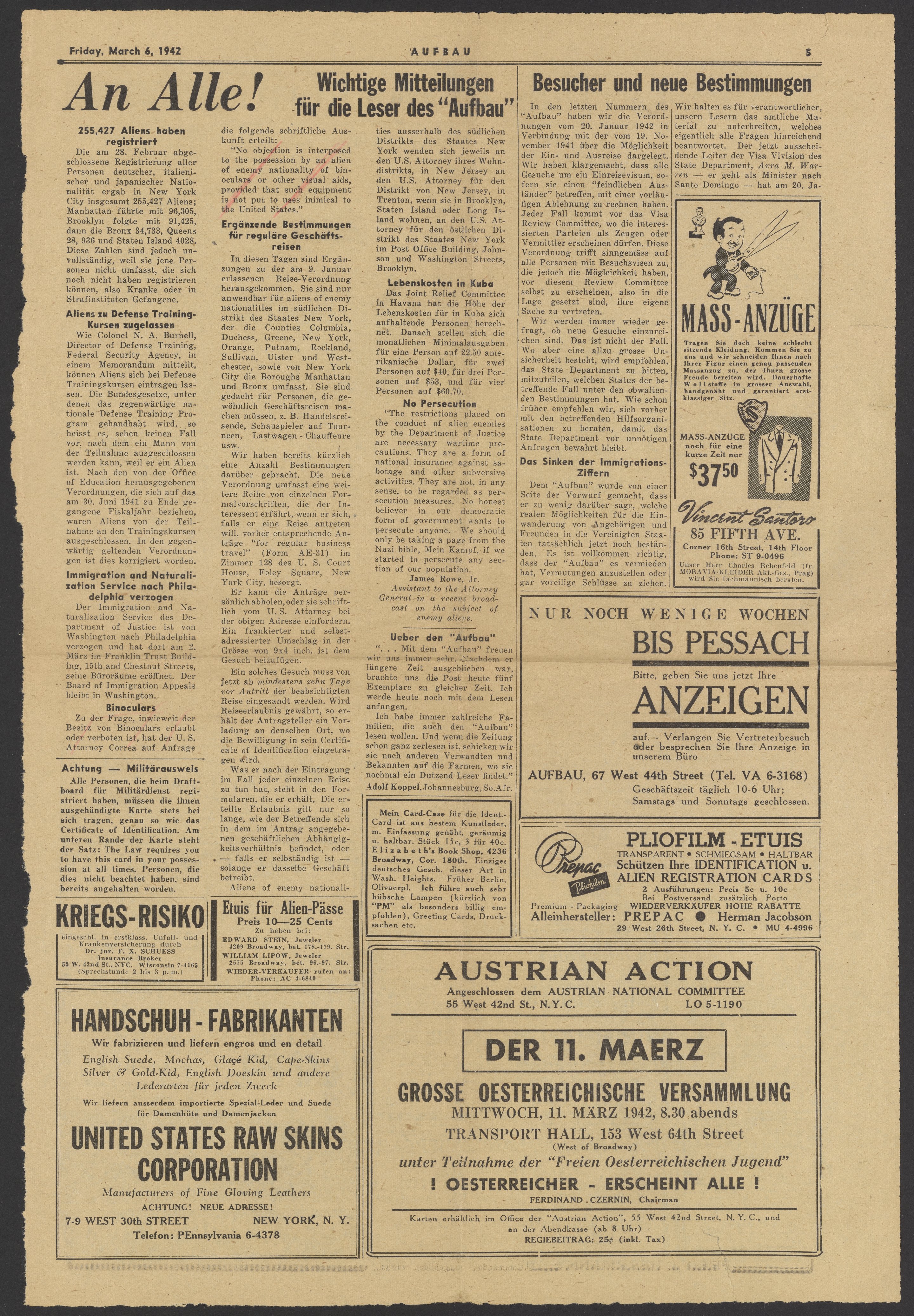 “Achtung: Viermal Angabe Von Adressänderung Bei Wohnungswechsel.” Aufbau (New York, N.Y.), September 4, 1942. Papers of Georg and Max Bredig, Box 10, Folder 26. Science History Institute. Philadelphia. https://digital.sciencehistory.org/works/tlaensx.