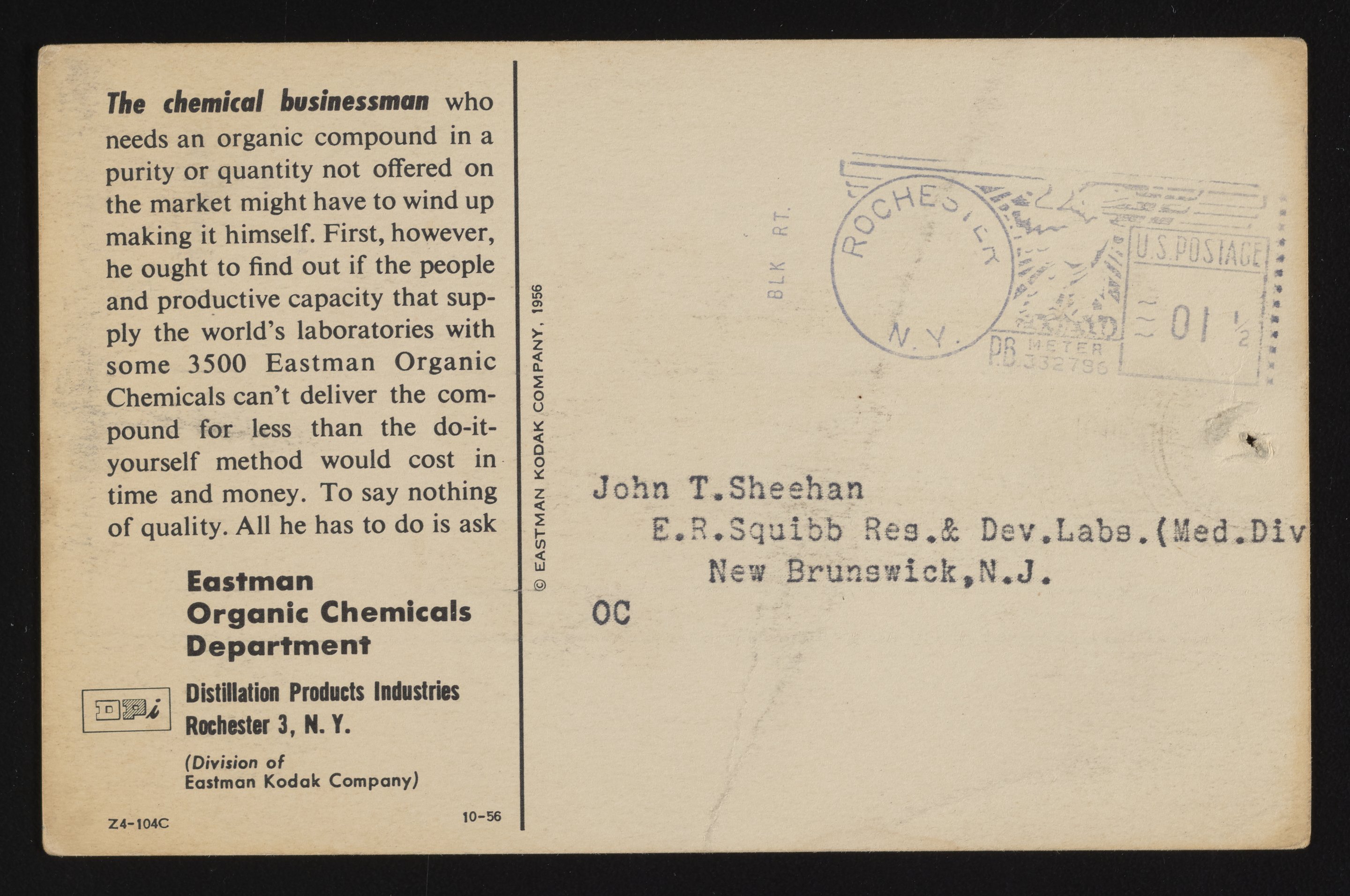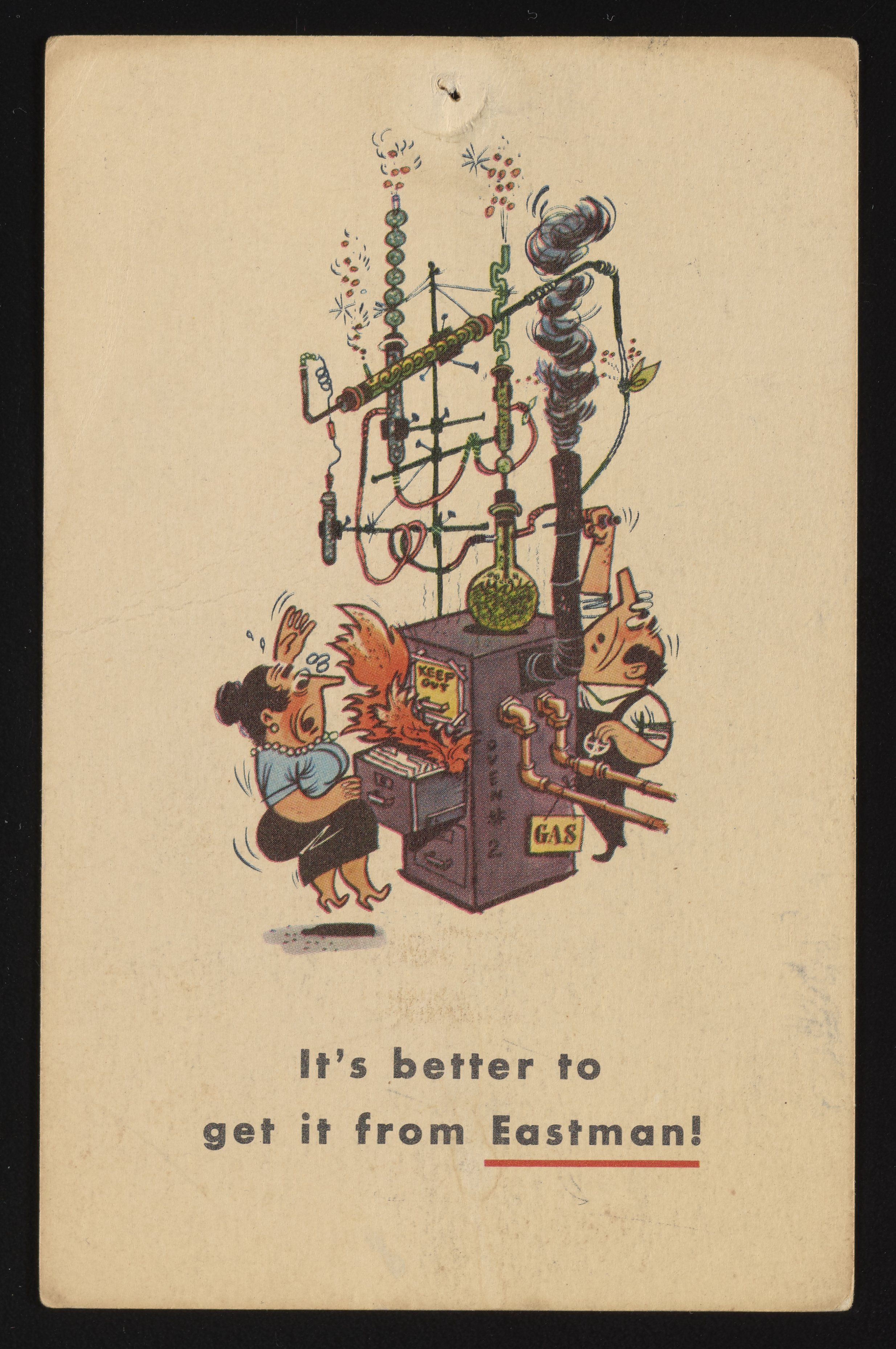 Front and back of an illustrated color postcard advertising the products and services of the Eastman Organic Chemicals Department (Division of the Eastman Kodak Company). The postcard features a humorous depiction of a harried-looking man and woman struggling to control a complicated scientific apparatus while brewing their own chemicals. Postmarked from Rochester, New York, the postcard also includes a brief summary of Eastman’s available stock of chemical compounds as they pertain to the “chemical businessman.”