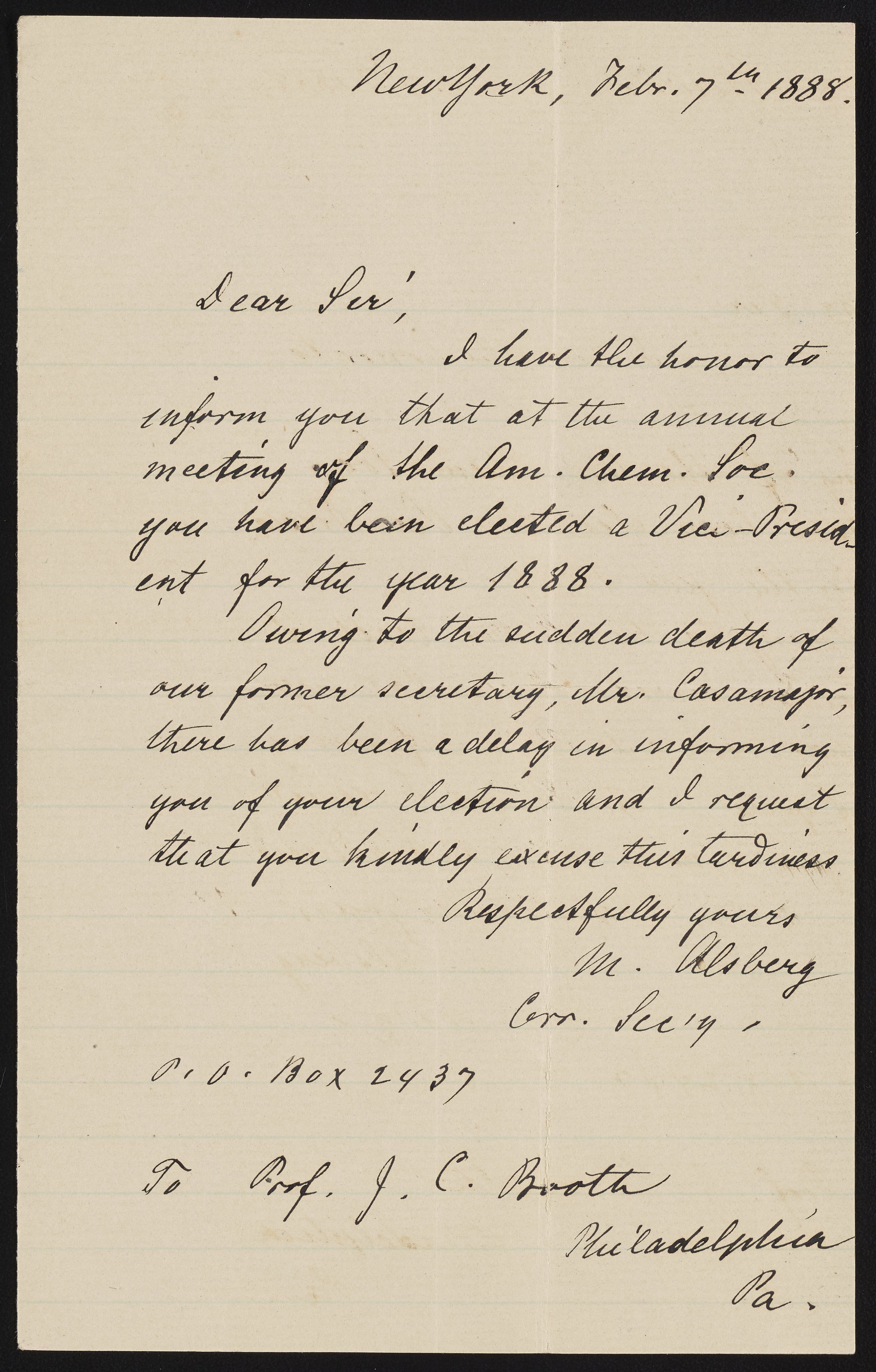 M. Alsberg, Corresponding Secretary of the American Chemical Society (ACS) informs James Curtis Booth (1810-1888) that he has been elected Vice President of ACS for the year 1888.