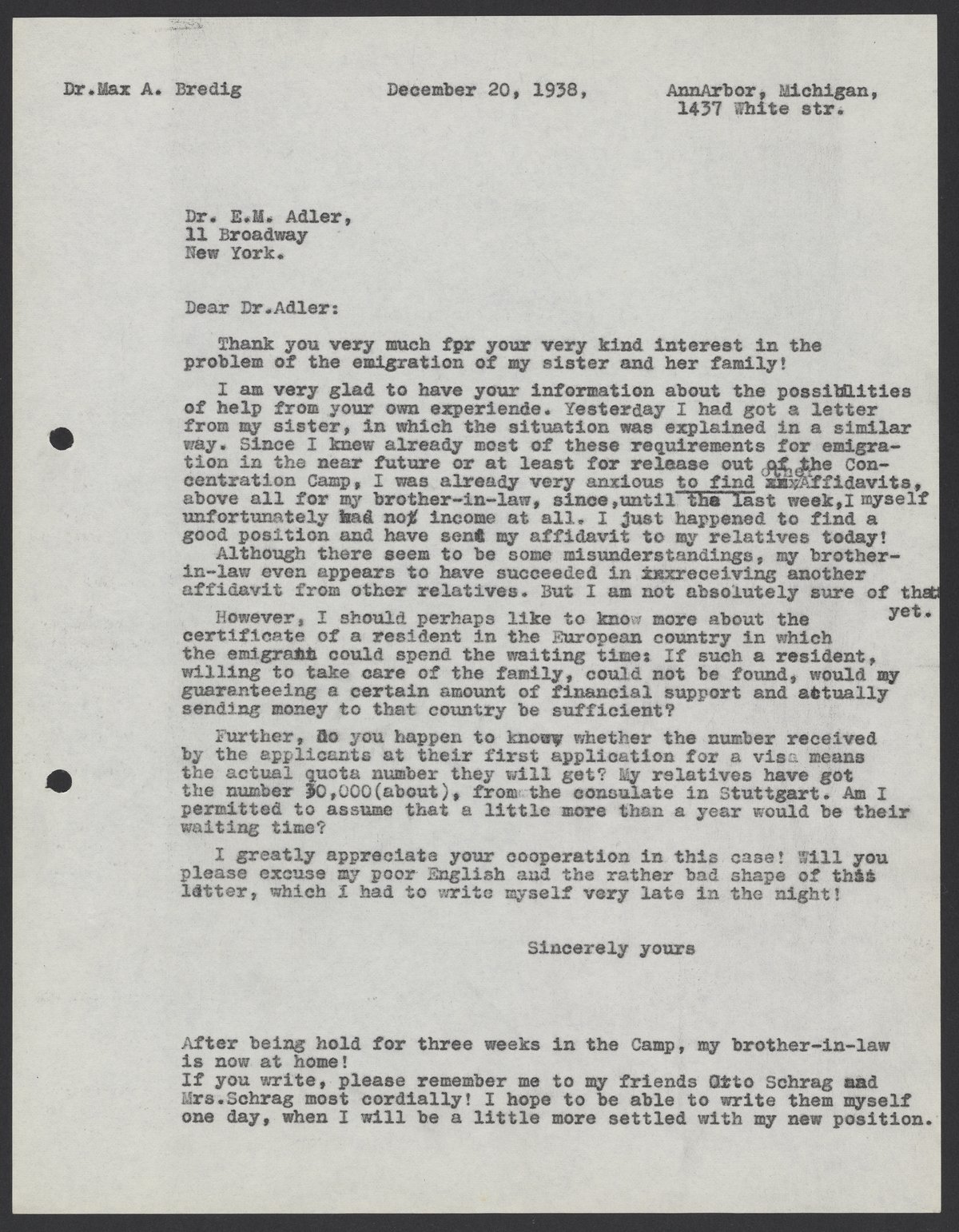Letter from Max Bredig to Ernst Alder