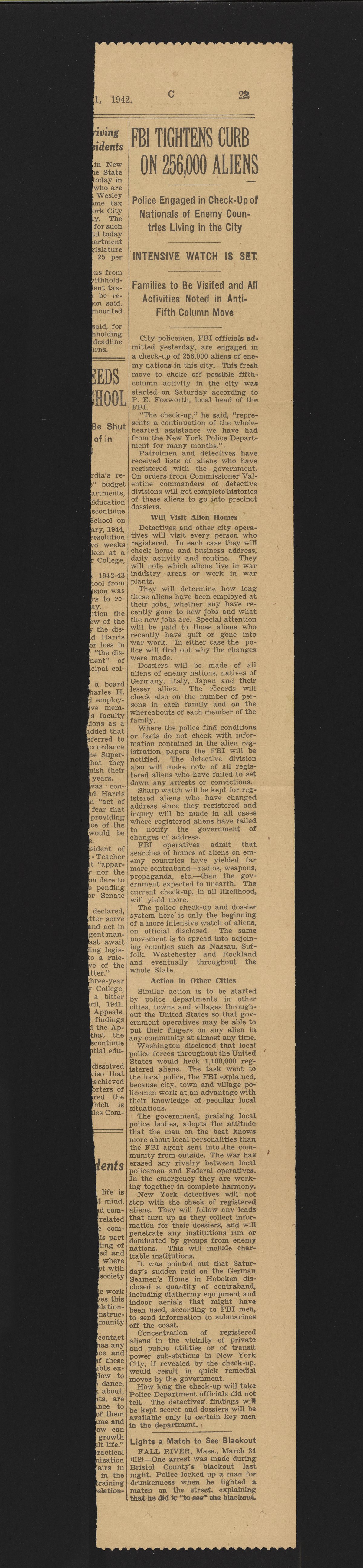 “FBI Tightens Curb on 256,000 Aliens.” New York, New York: New York times, April 1, 1942. Papers of Georg and Max Bredig, Box 10, Folder 26. Science History Institute. Philadelphia. https://digital.sciencehistory.org/works/tshx2fb.