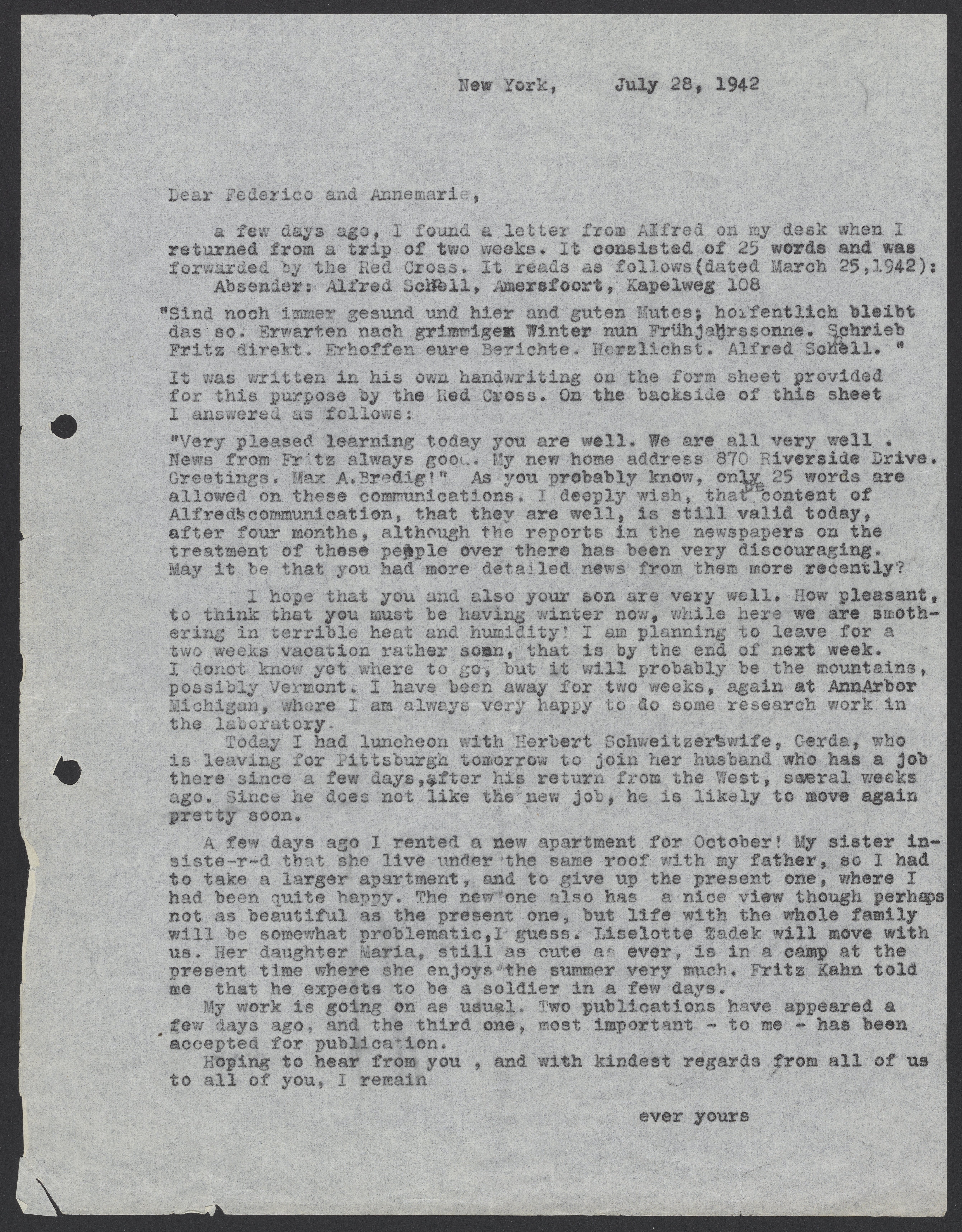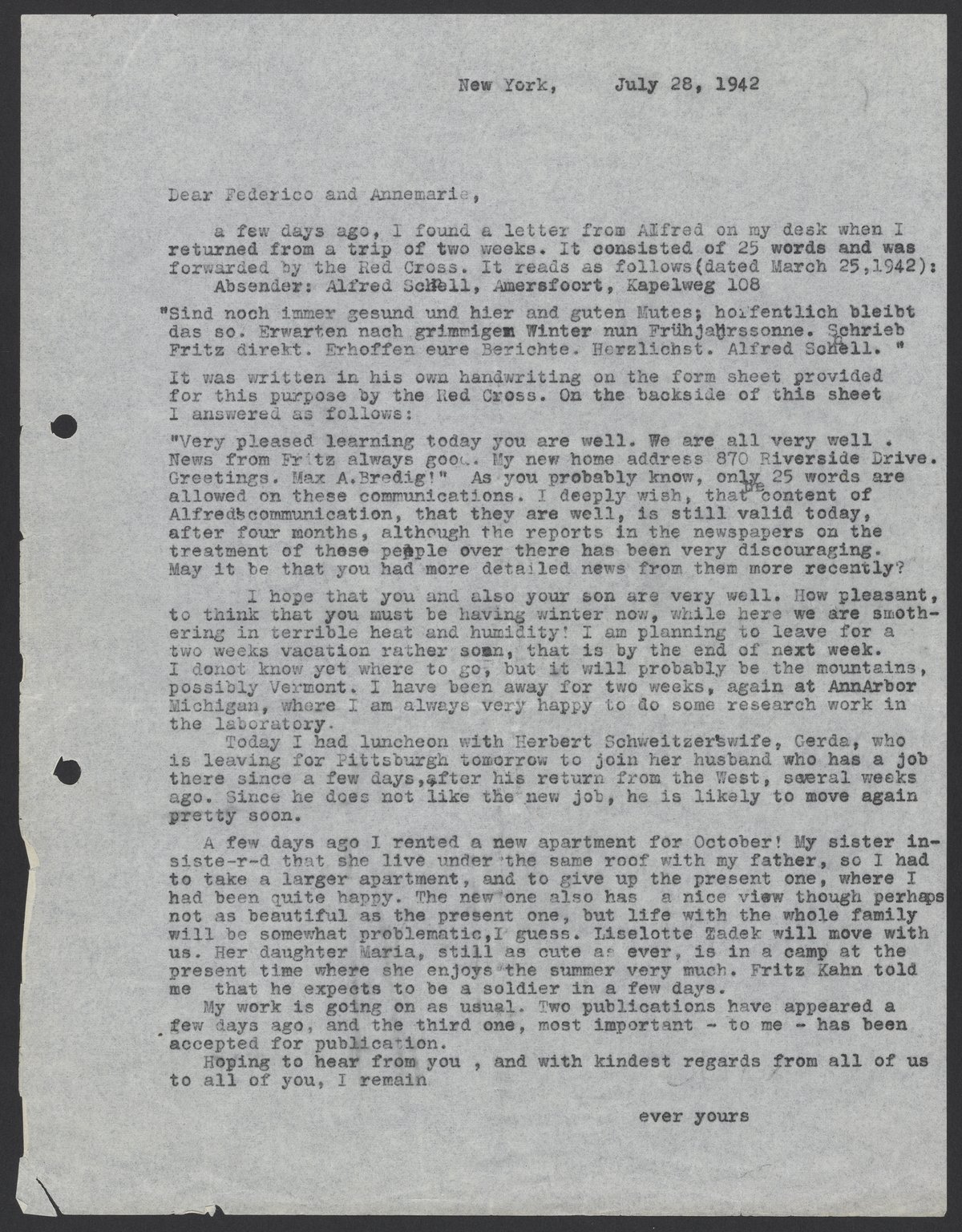 Letter from Max Bredig to Federico and Annemarie Schnell, July 28, 1942