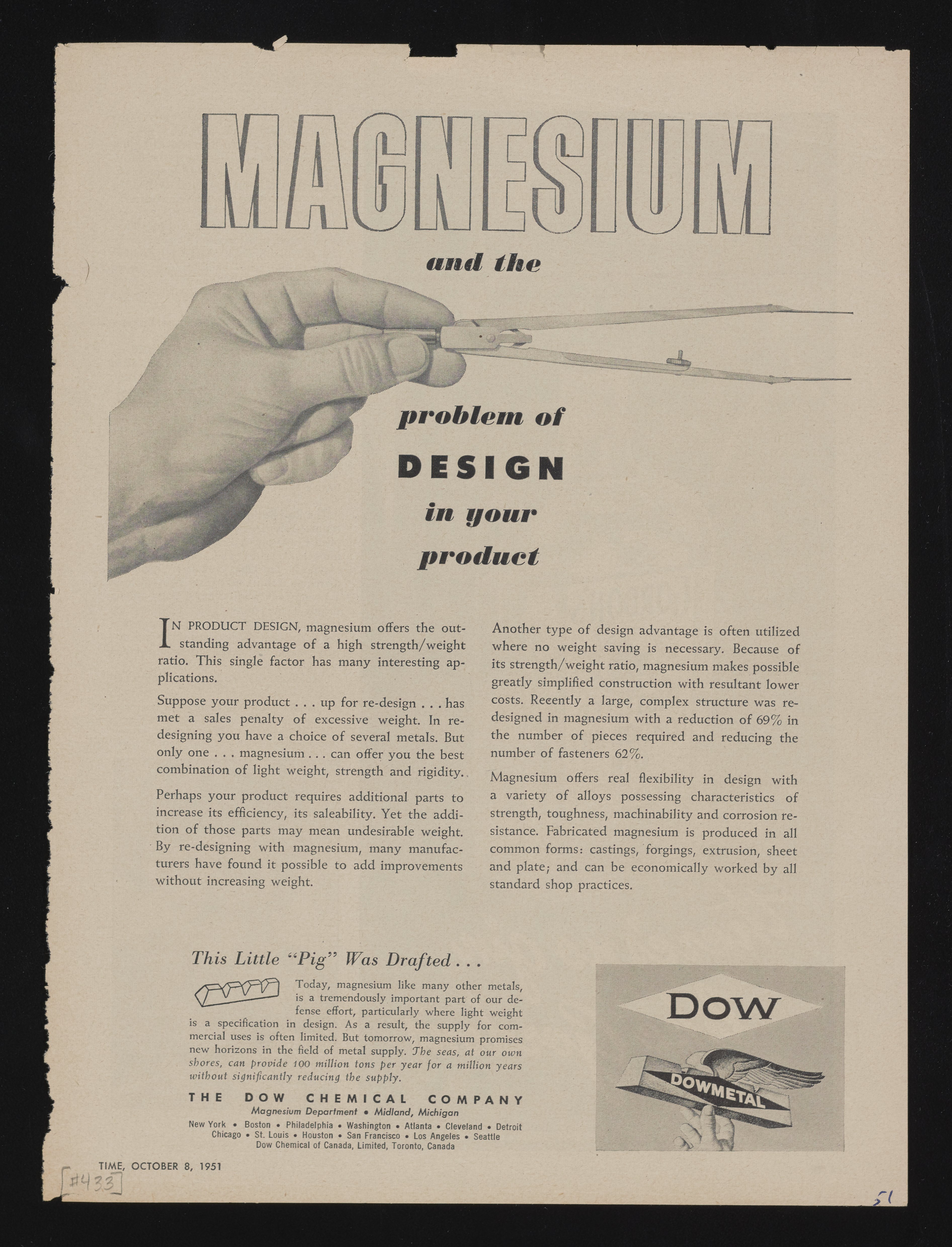 Dow Chemical Company. “Magnesium and the Problem of Design in Your Product,” October 8, 1951. Advertisements from the Dow Chemical Historical Collection, Box 8. Science History Institute. Philadelphia. https://digital.sciencehistory.org/works/ttmwwp0.