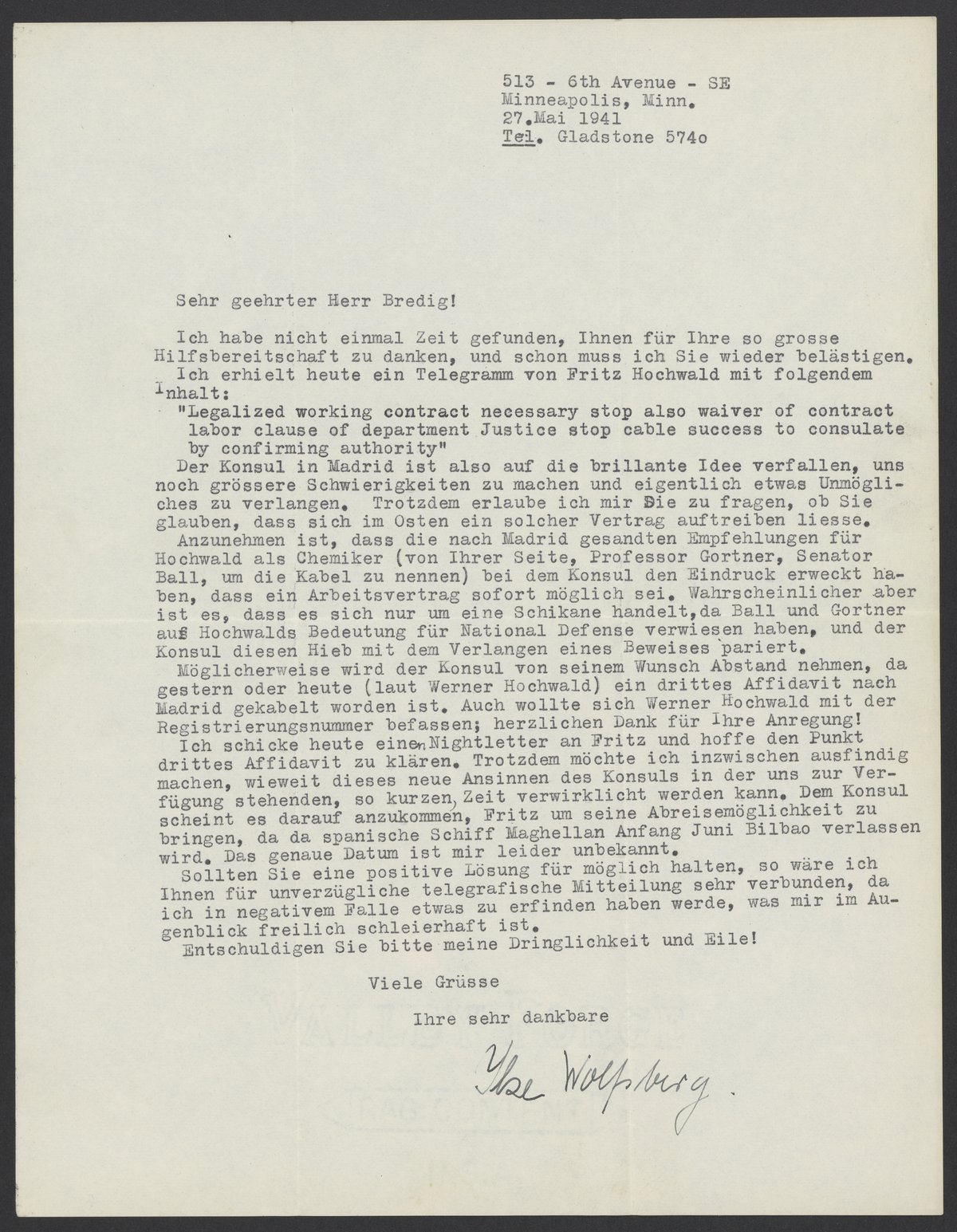 Letter from Ilse Wolfsberg to Max Bredig, May 15, 19411941-May-15 (sent), 1941-May-20 (received)