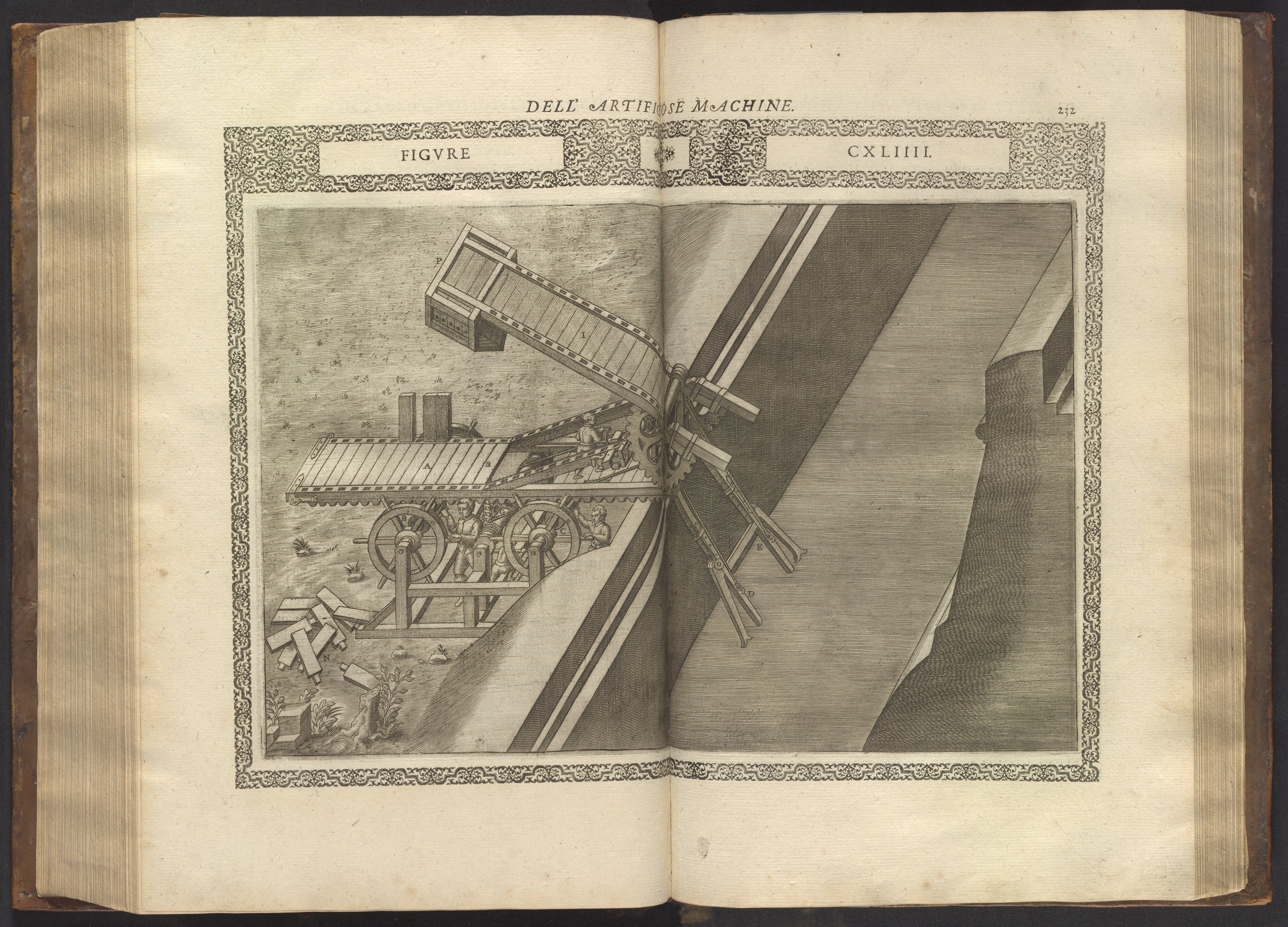 Ramelli, Agostino. “Plate 144: Bridge for Crossing a City or Fortress Moat and Scaling Its Wall.” In Le Diverse Et Artificiose Machine Del Capitano Agostino Ramelli. Paris, France, 1588. https://digital.sciencehistory.org/works/tx31qh855.
