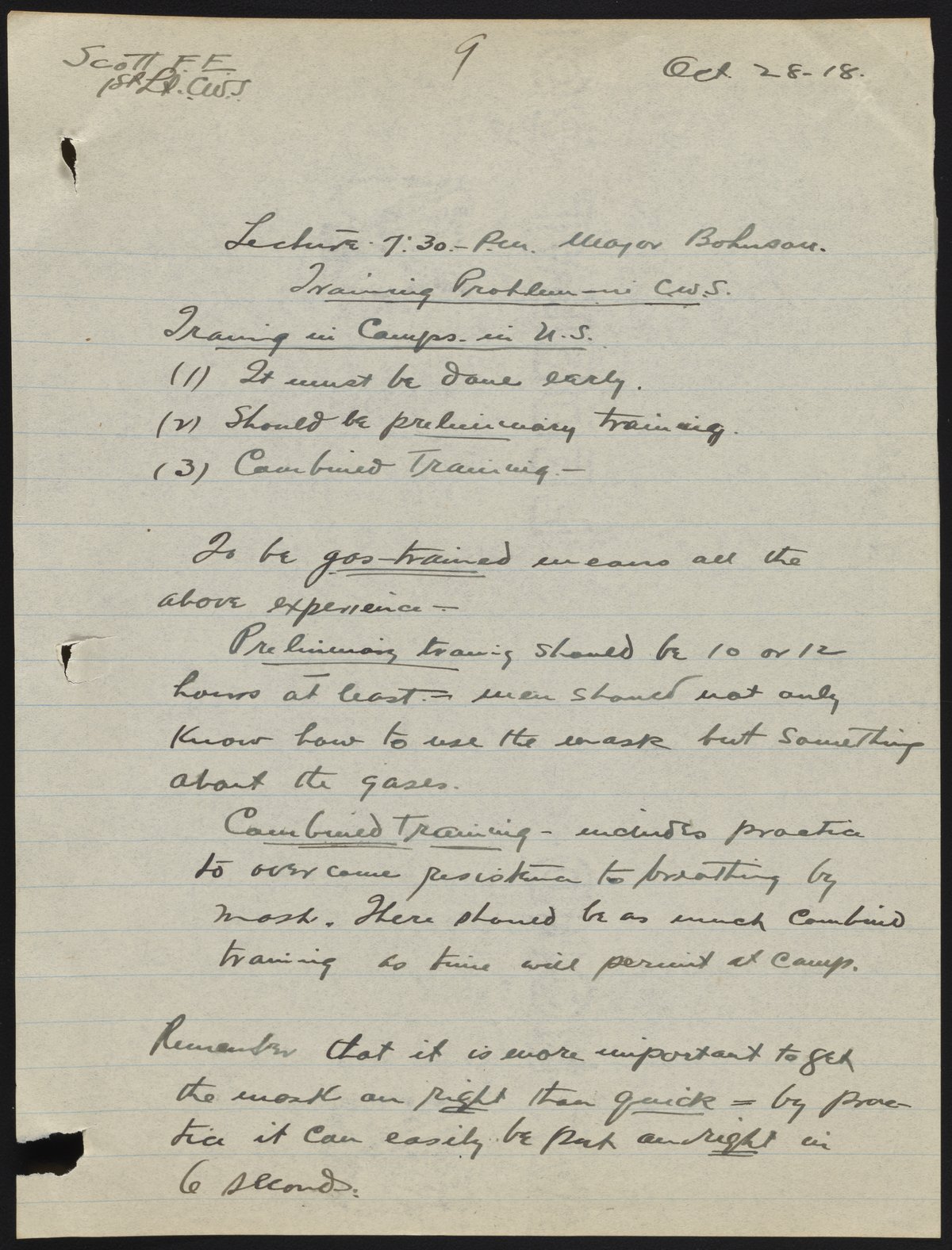Small JPG1200 x 1562px — 345 KBLarge JPG2880 x 3748px — 1.7 MBFull-sized JPG5302 x 6900px — 4.7 MBOriginal fileTIFF — 5302 x 6900px — 105 MBNotebook consists of handwritten notes taken by Francis E. Scott at the U.S. Army Gas School at Camp Kendrick, New Jersey, on the use of gas in warfare. The notes include teaching aids and a circular letter from Brigadier General Amos A. Fries, Chief of the Chemical Warfare Service, in which he discusses use of gas in trench warfare in France. Scott held the rank of 1st Lieutenant in the Army's Chemical Warfare Service during World War I.