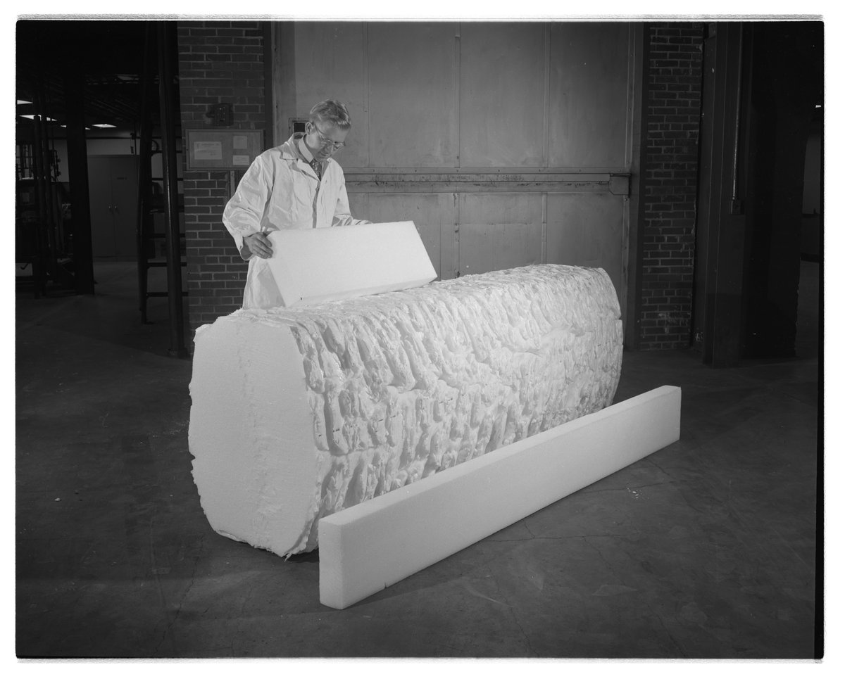 Dow Chemical Company. “Examining Pieces of Styrofoam at Dow Chemical Company,” 1951. Dow Chemical Company Historical Image Collection, Box 4, Folder Products--Styrofoam. Science History Institute. Philadelphia. https://digital.sciencehistory.org/works/tx31qj223.