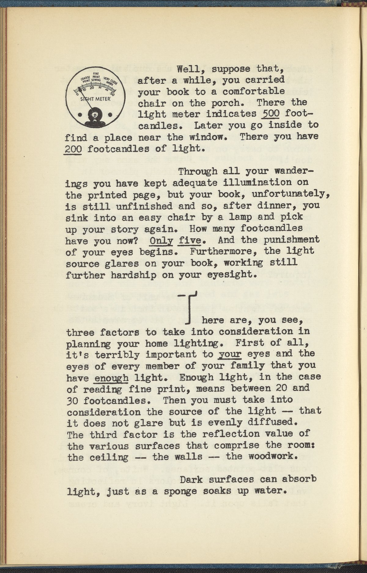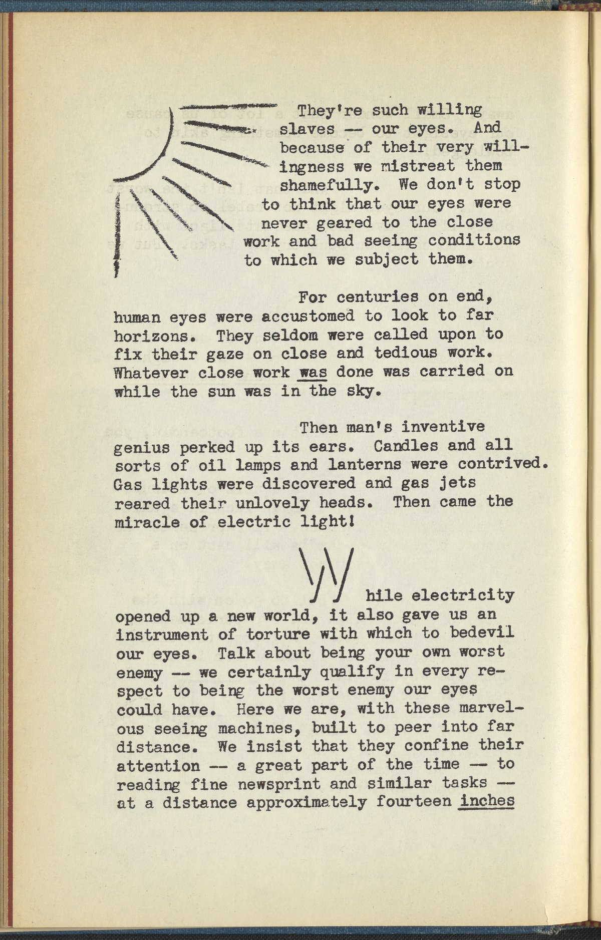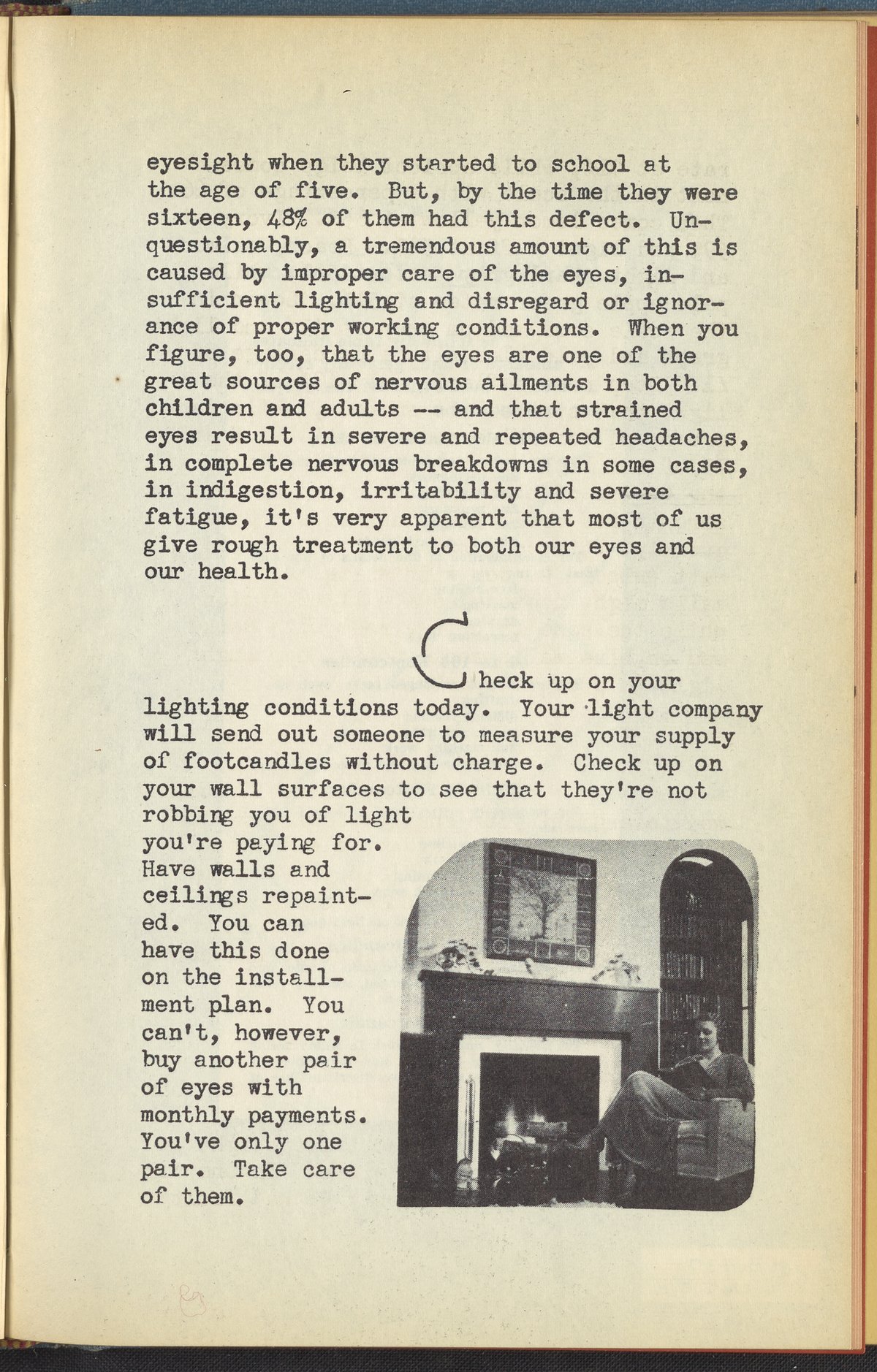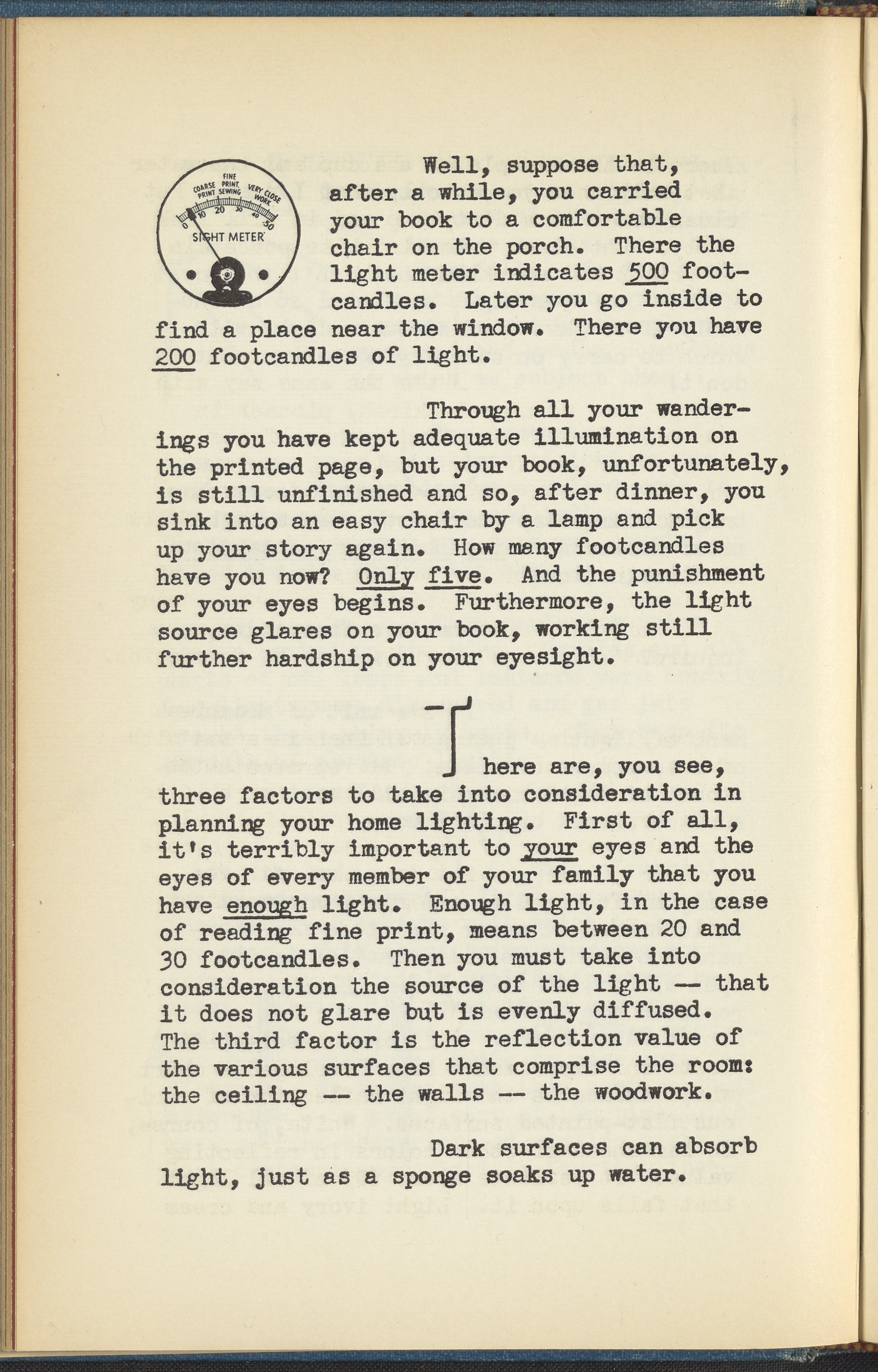 Booklet corresponding to a radio broadcast program created by the National Paint, Varnish, and Lacquer Association. The booklet describes how too much or too little light can be harmful to the eyes. Describes solutions for home lighting intended to soothe one's eyes. Encourages determining a gentle color scheme for one's home and using paint products that provide a balanced amount of light reflection. Includes small illustrations throughout and decorated covers.