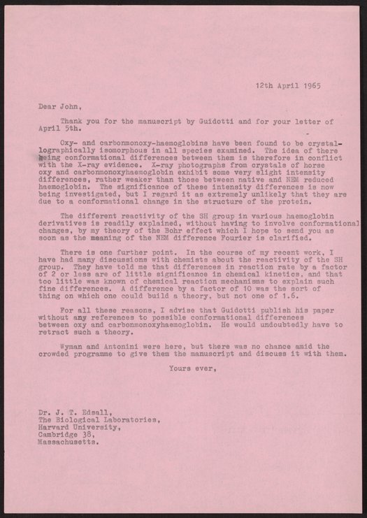 Perutz, Max F. “Letter from Max Perutz to John T. Edsall, April 12, 1965,” April 12, 1965. History of Molecular Biology Collection, Box 74, Folder 12. Science History Institute. Philadelphia. https://digital.sciencehistory.org/works/u1jq2zd.