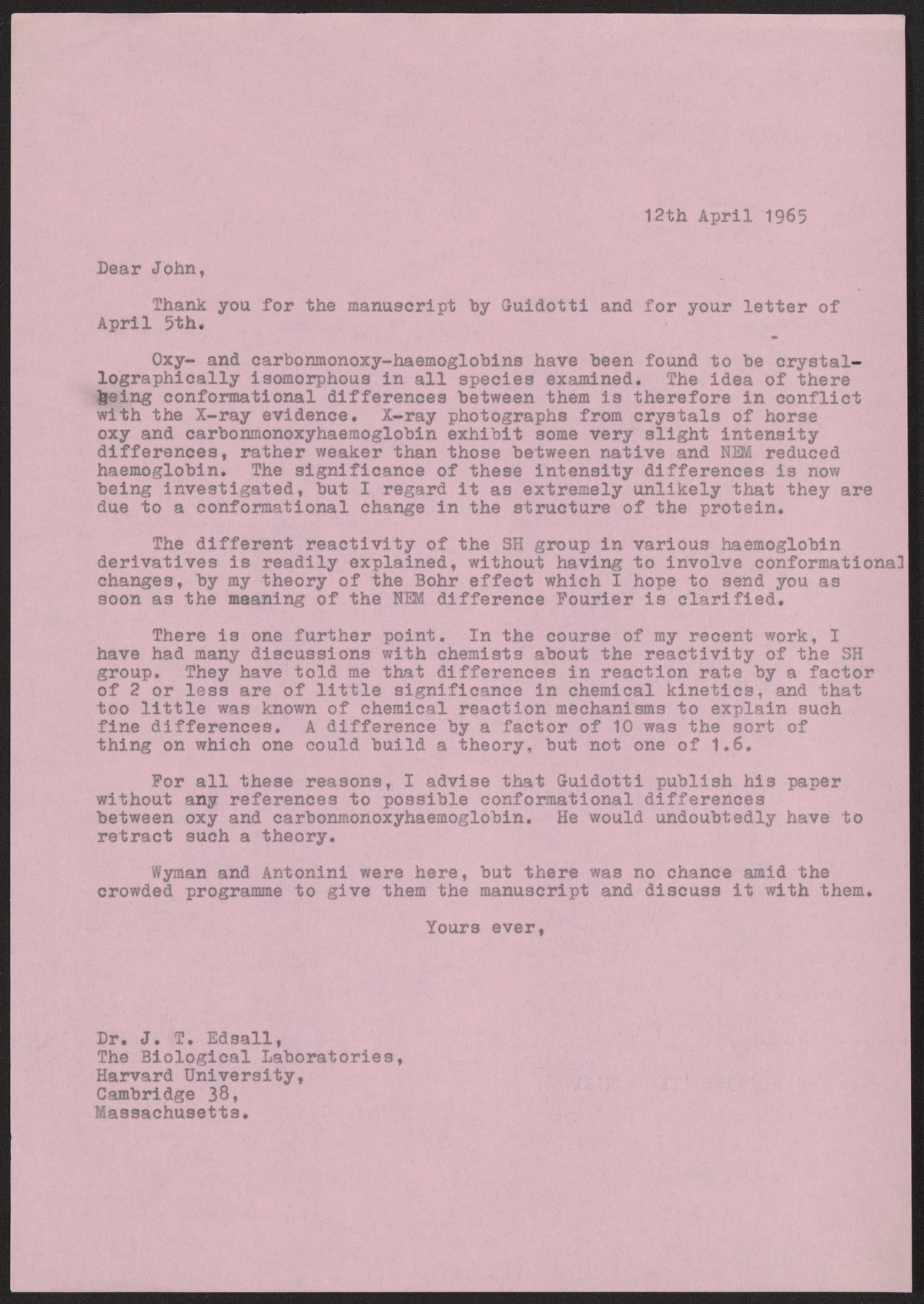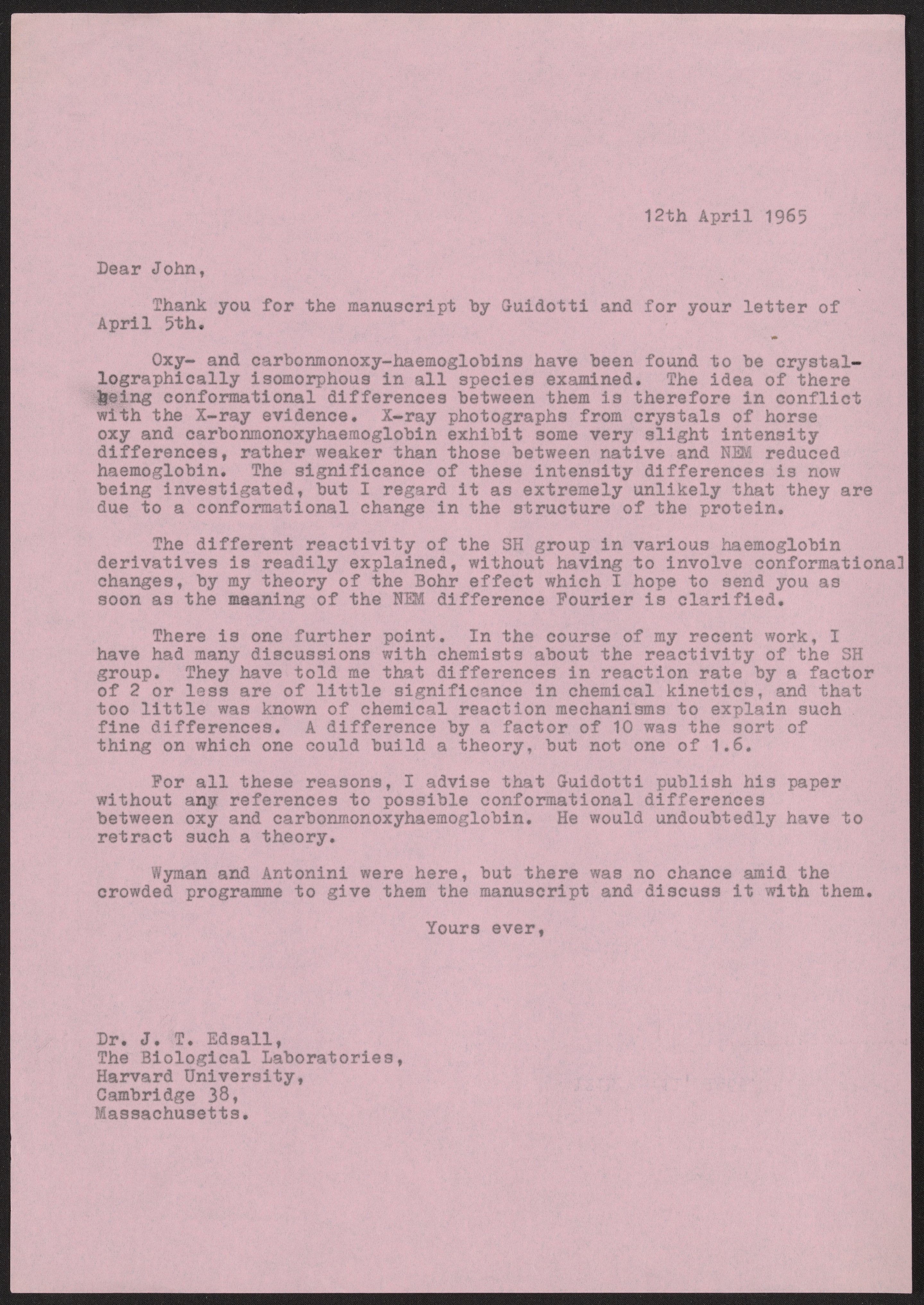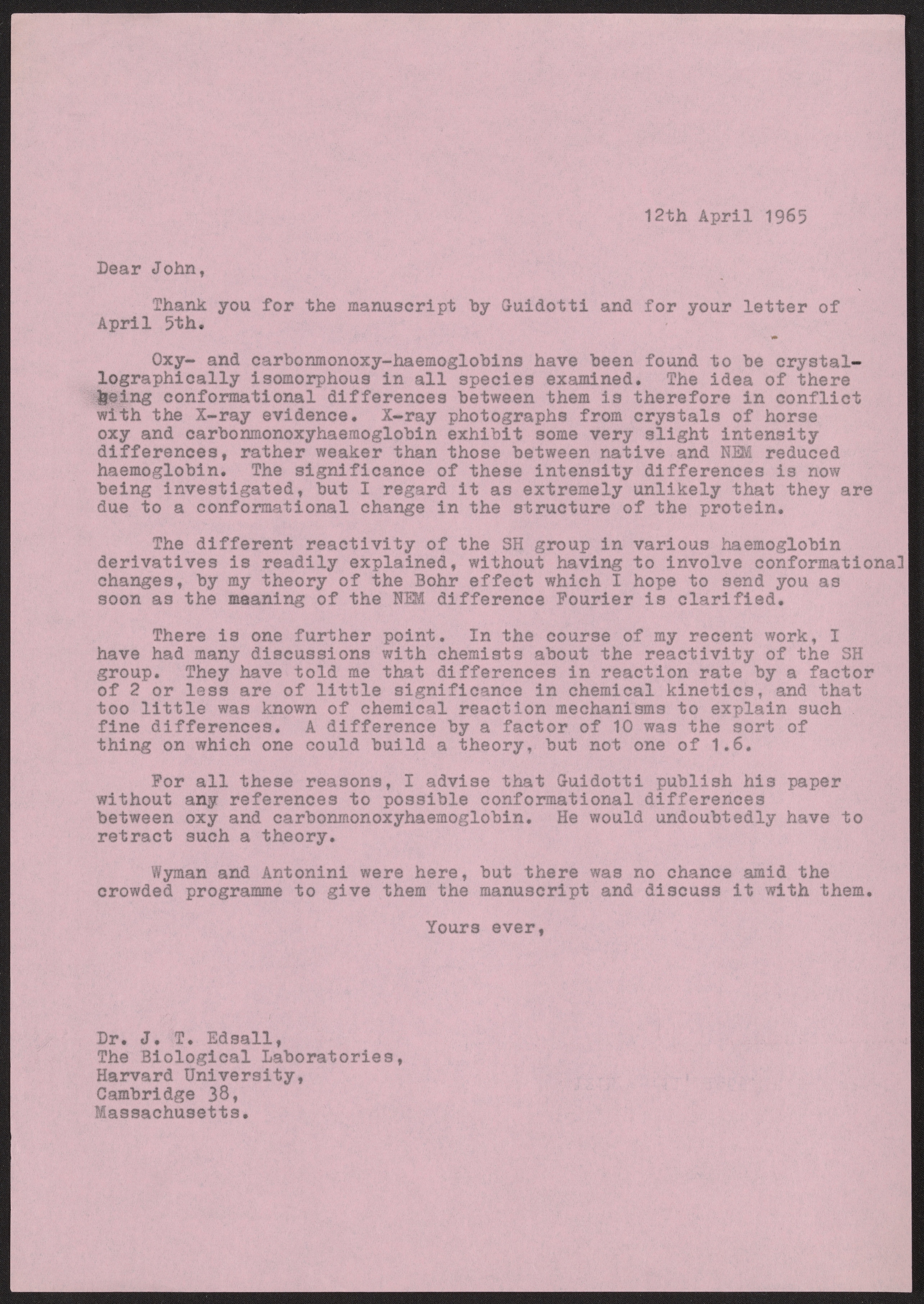 Letter from Max Perutz to John T. Edsall, April 12, 1965