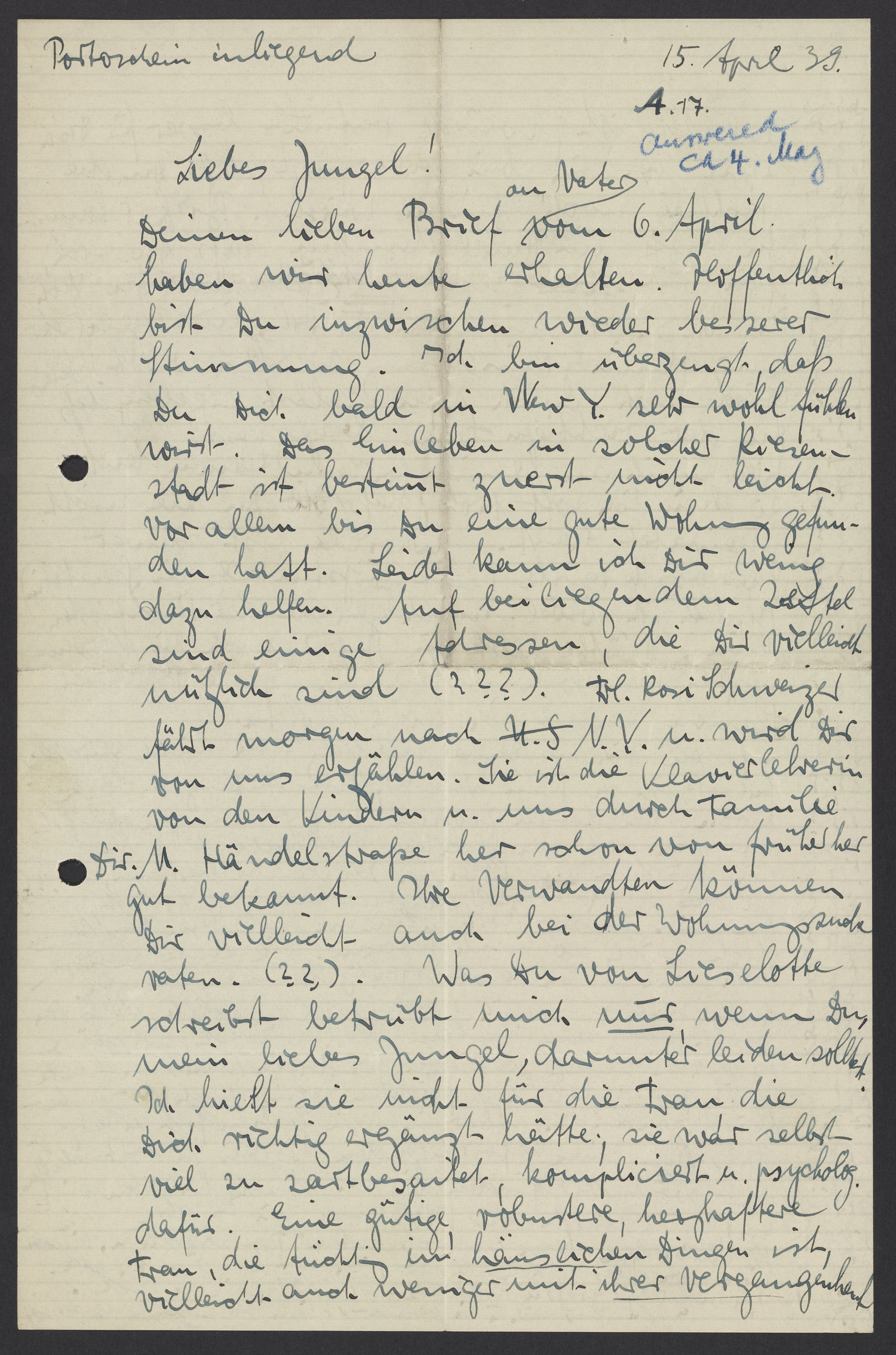 Deinen lieben Brief an Vater vom 6. April haben wir heute erhalten. Hoffentlich bist Du inzwischen wieder besserer Stimmung. Ich bin überzeugt, dass Du Dich bald in New Y. sehr wohl fühlen wirst. Das Einleben in solcher Riesenstadt ist bestimmt zuerst nicht leicht, vor allem bis Du eine gute Wohnung gefunden hast. Leider kann ich Dir wenig dazu helfen. Auf beiliegendem Zettel sind einige Adressen, die Die vielleicht nützlich sind (???). Frl. Rosi Schweizer fährt morgen nach N.Y. u. wird Dir von uns erzählen. Sie ist die Klavierlehrerin von den Kindern u. uns durch Familie u. Händelstraße her schon von früher sehr gut bekannt. Ihre Verwandten können Dir vielleicht bei der Wohnungssuche raten. (??). Was Du von Lieselotte schreibst betrübt mich nur, wenn Du mein liebes Jungel, darunter leiden sollst.