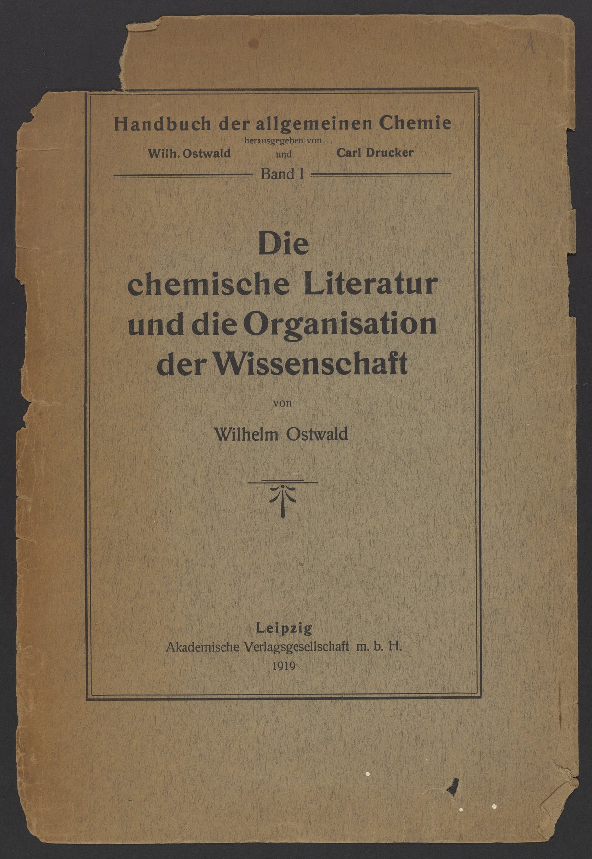 Ostwald, Wilhelm. “Cover of Die Chemische Literatur Und Die Organisation Der Wissenschaft,” 1919. Papers of Georg and Max Bredig, Box 4, Folder 30. Science History Institute. Philadelphia. https://digital.sciencehistory.org/works/u3hysy7.