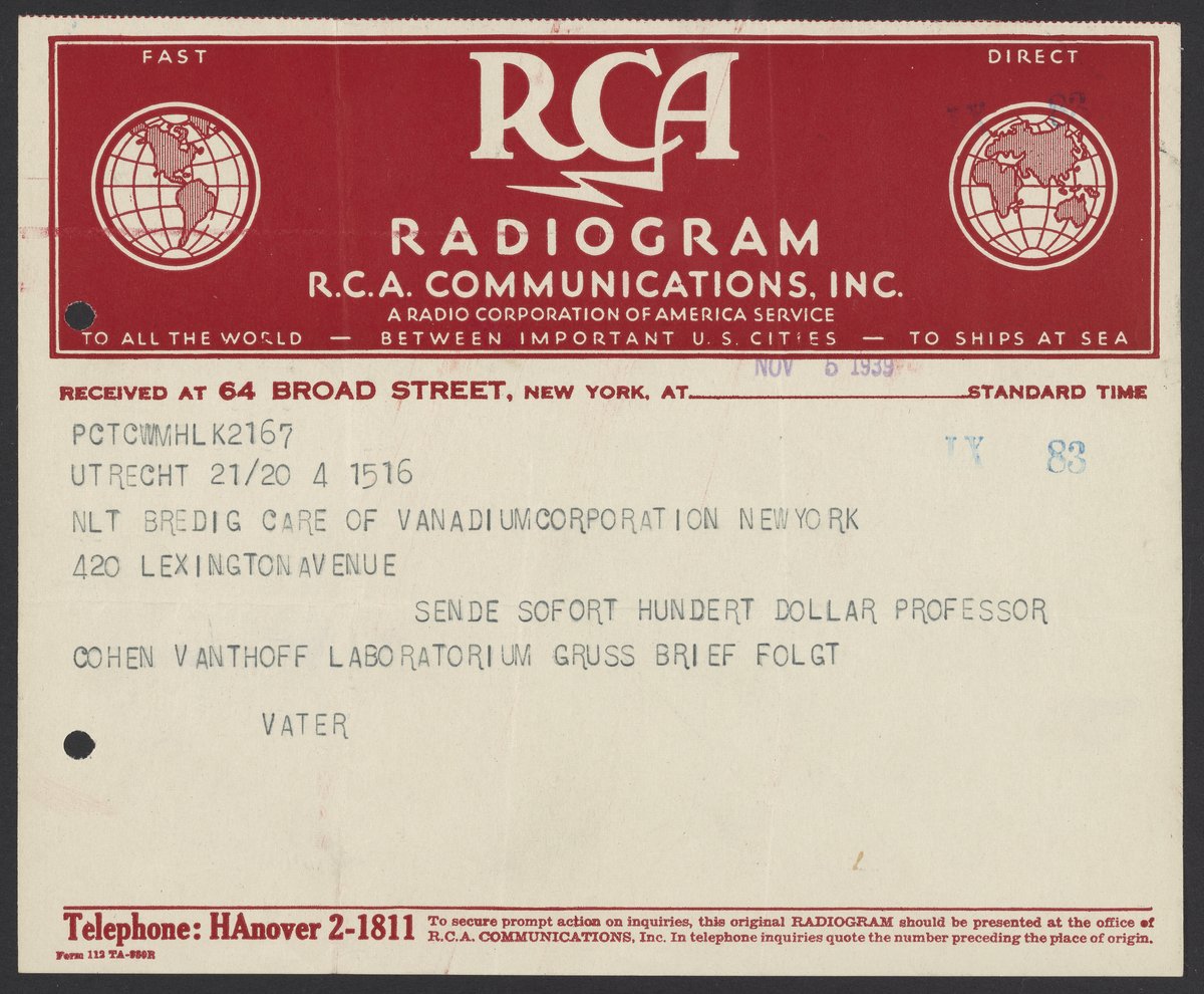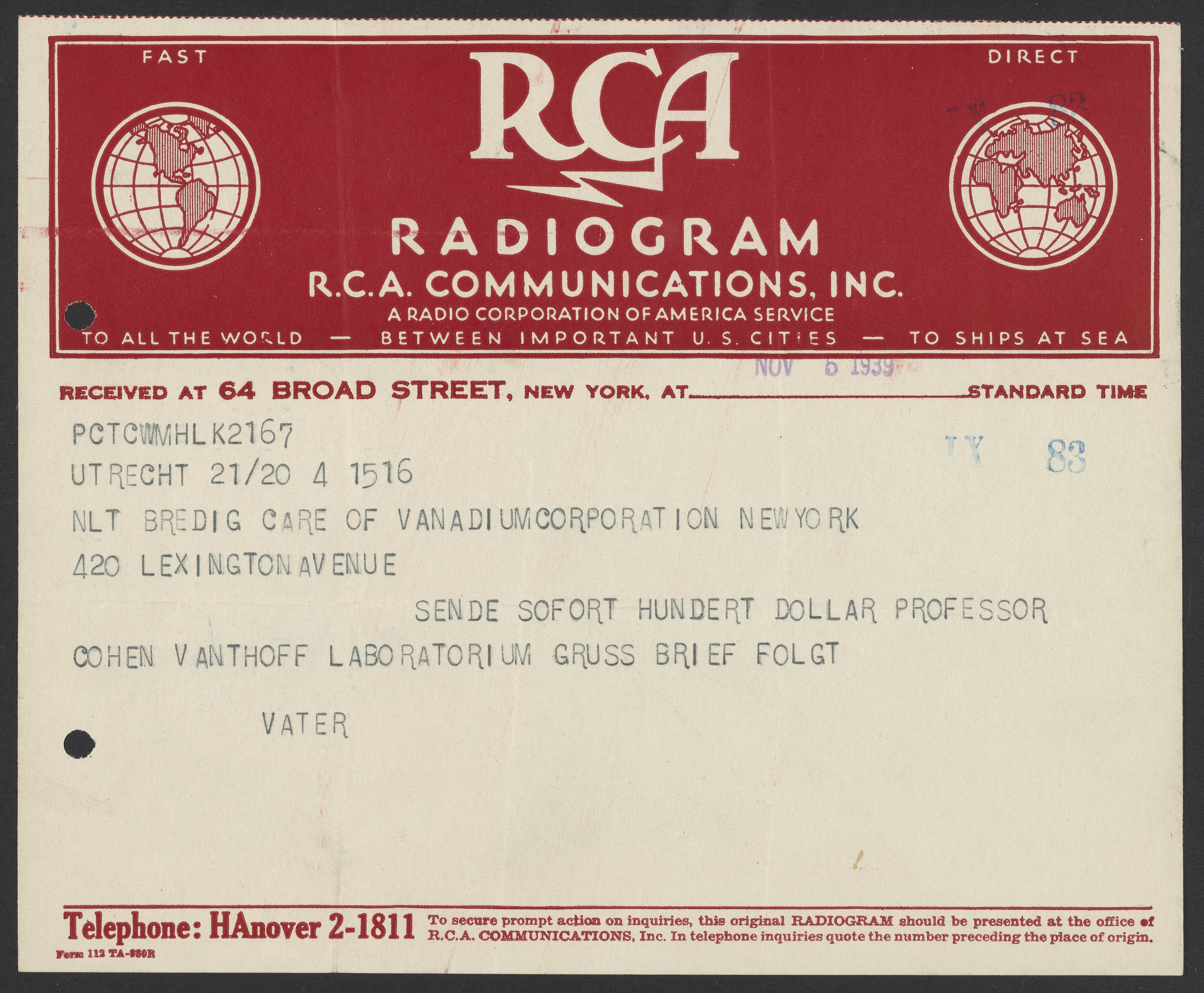 SENDE SOFORT HUNDERT DOLLAR PROFESSOR COHEN VANTHOFF LABORATORIUM GRUSS BRIEF FOLGT