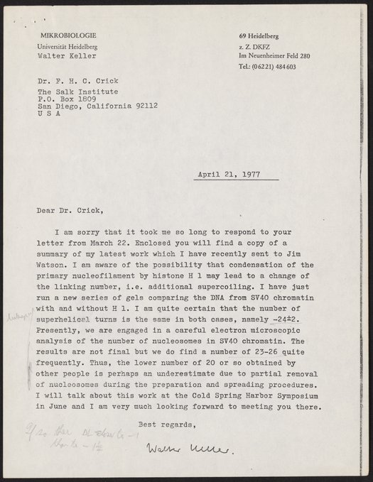 Keller, Walter. “Letter from Walter Keller to Francis Crick, April 21, 1977,” April 21, 1977. History of Molecular Biology Collection, Box 20, Folder 8. Science History Institute. Philadelphia. https://digital.sciencehistory.org/works/u8dhjts.