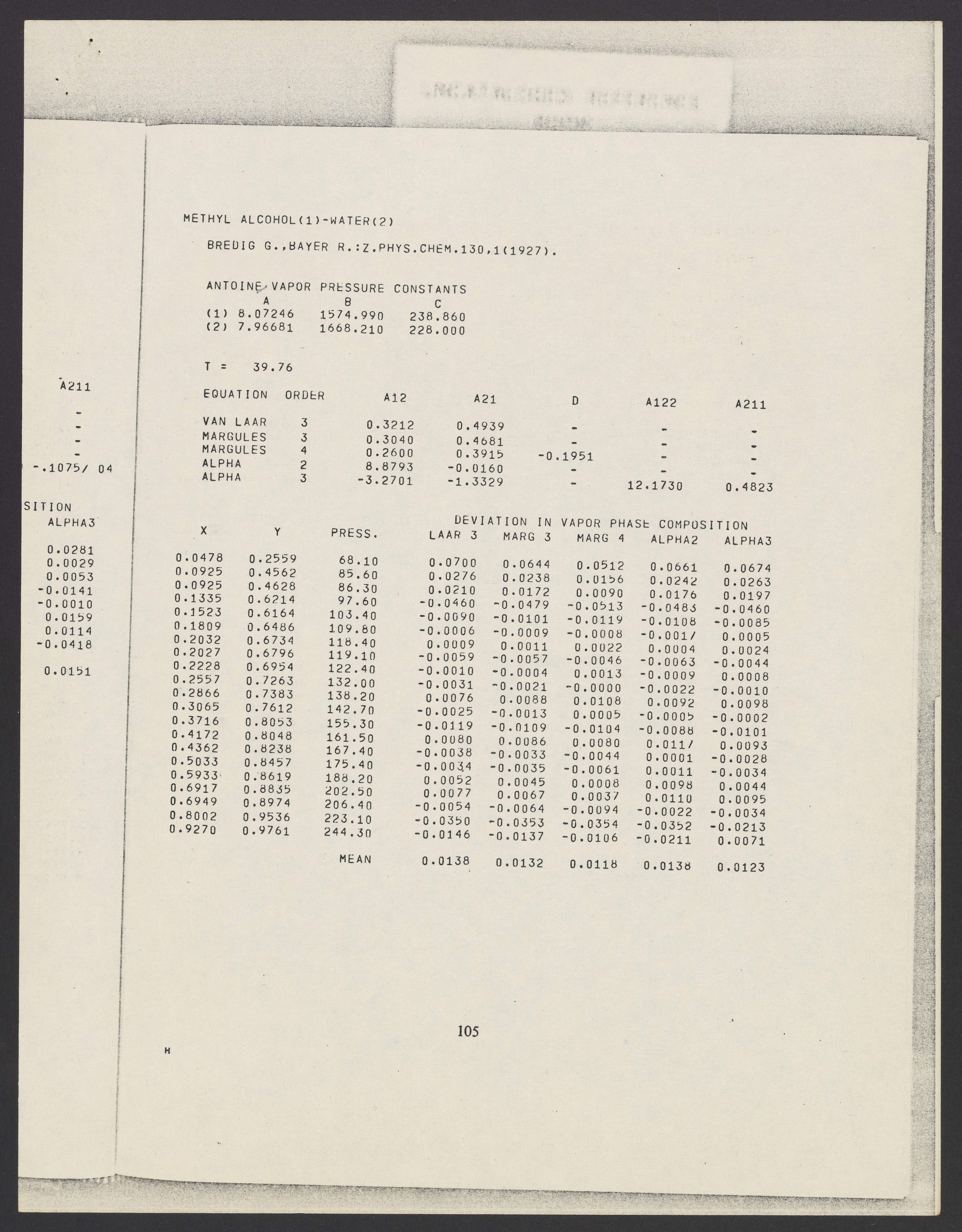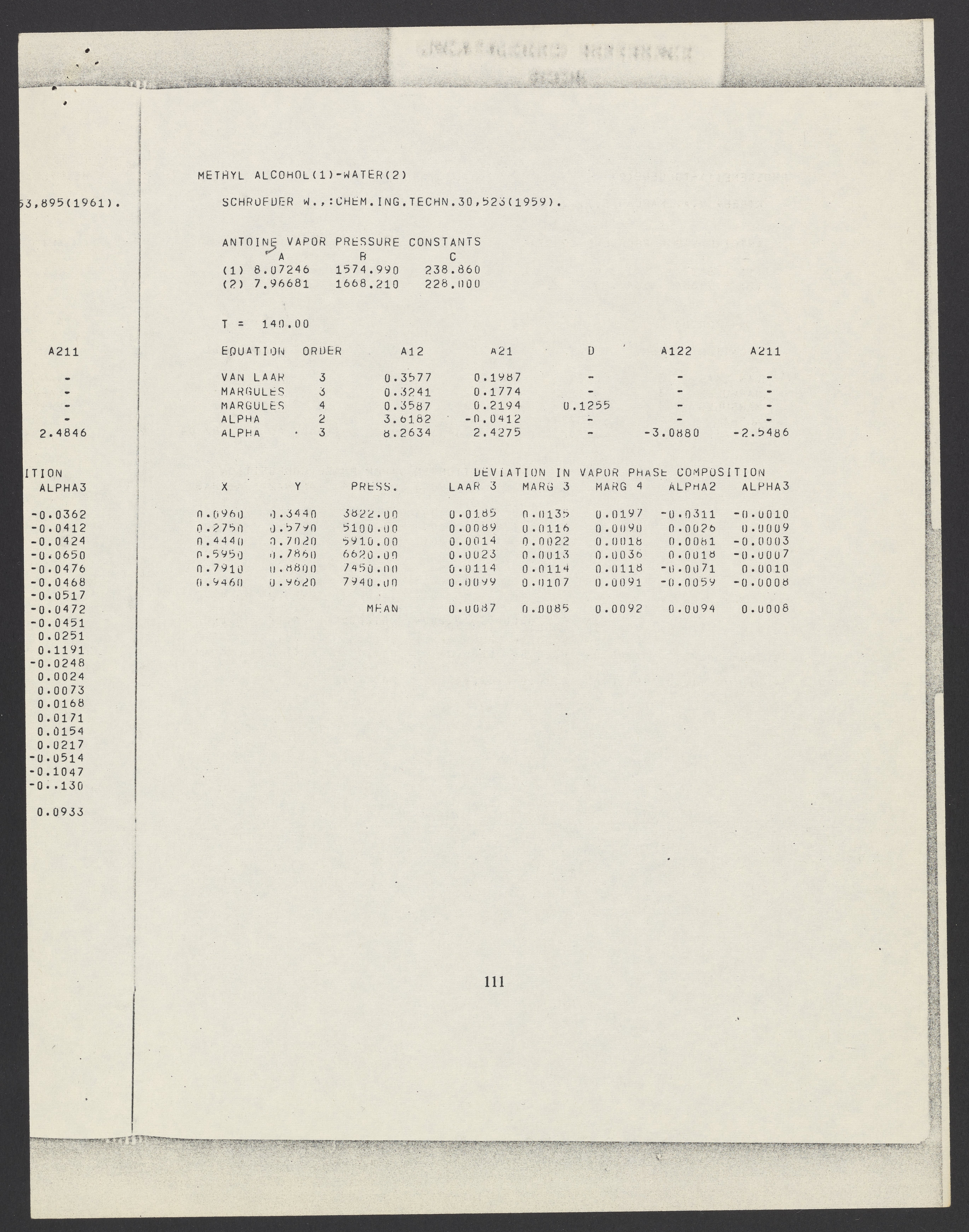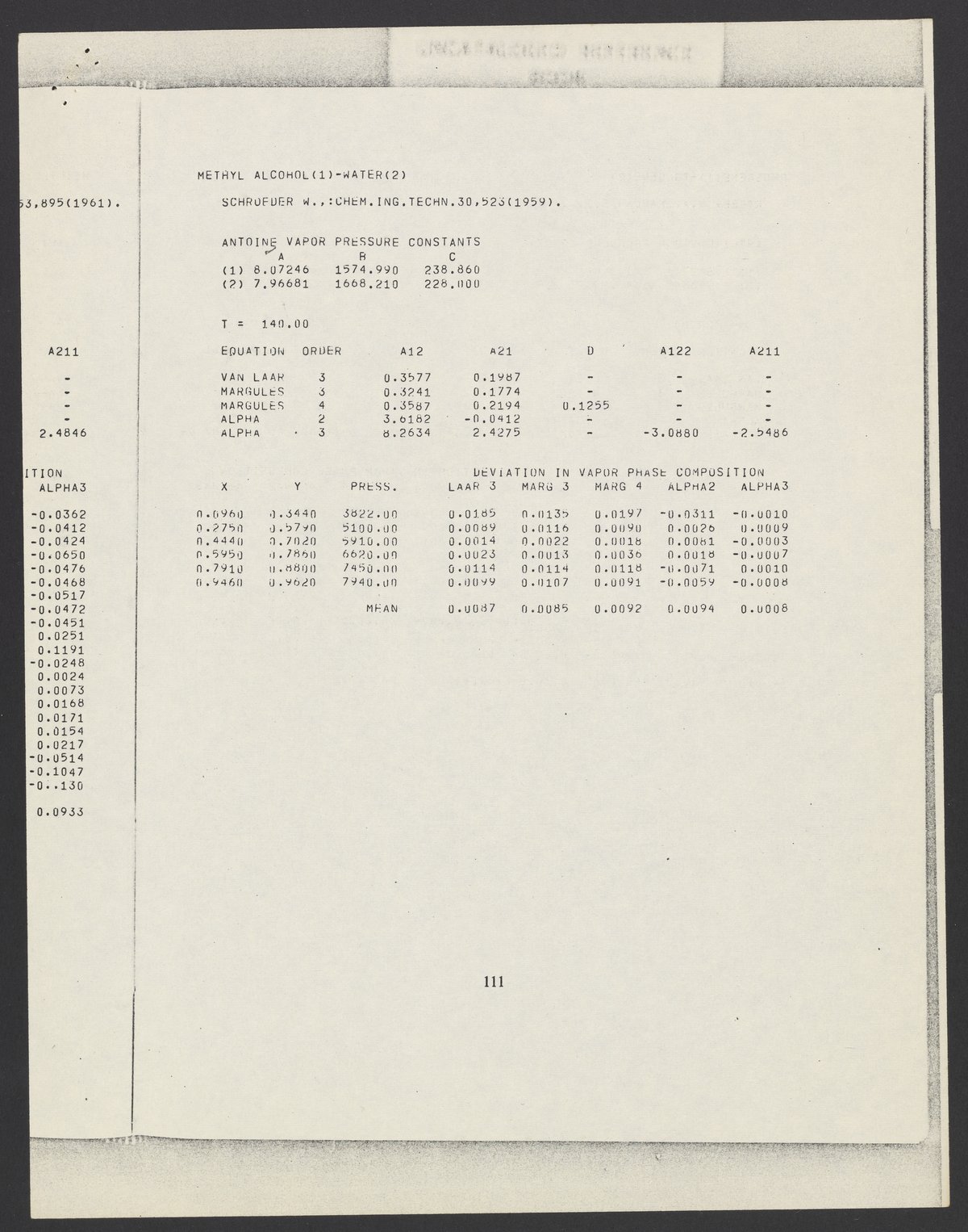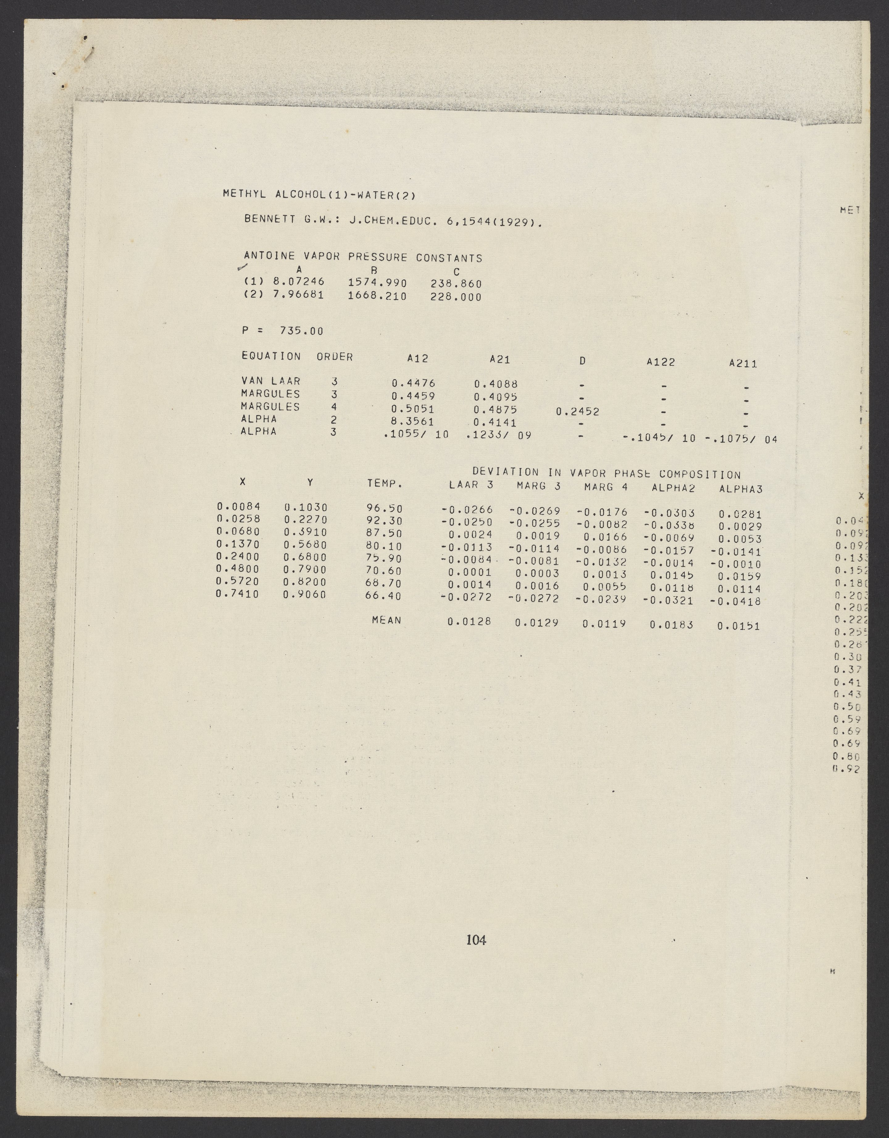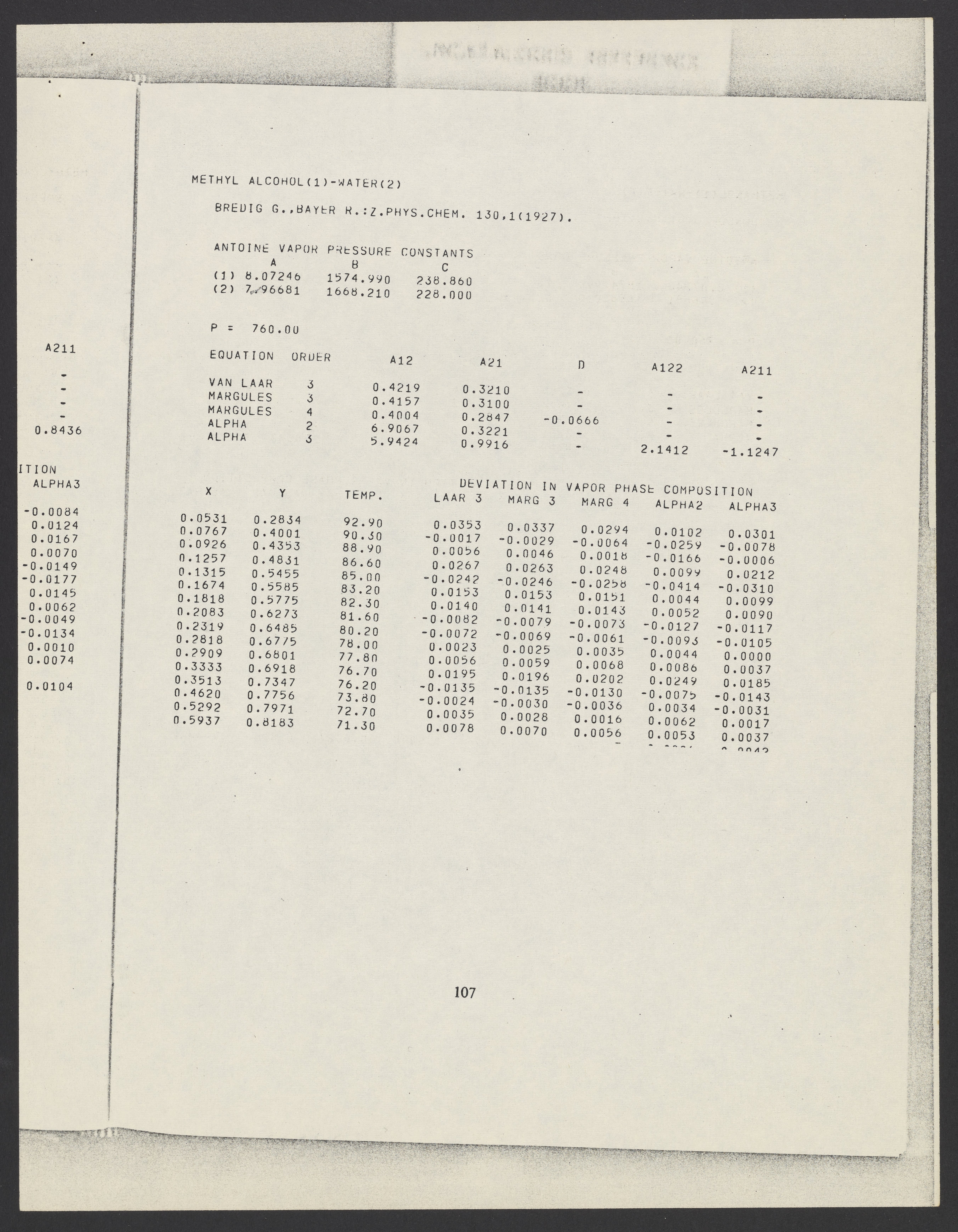 Small JPG1200 x 1530px — 185 KBLarge JPG2880 x 3672px — 1.3 MBFull-sized JPG5408 x 6896px — 4.9 MBOriginal fileTIFF — 5408 x 6896px — 107 MBPhotocopies of a selection of pages from a 1966 publication containing direct experimental data on vapor-liquid equilibrium in separation systems. The copies include datasets published in 1927 by Georg Bredig (1868-1944) and Richard Bayer (1883-1972) in their scientific paper Die Dampfdrücke des binären Systems Methylalkohol -Wasser in Zeitschrift für Physikalische Chemie, volume 130U, issue 1.
