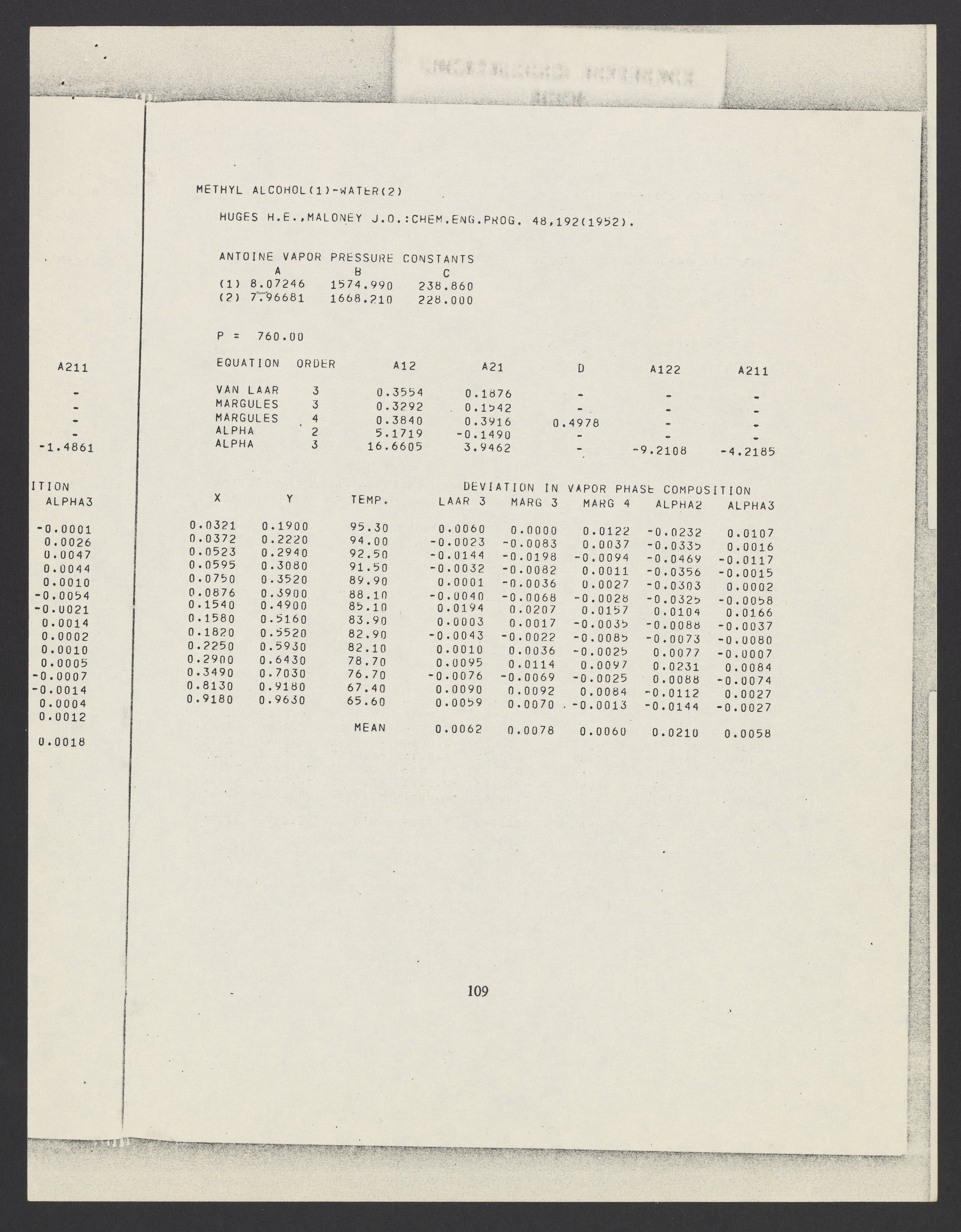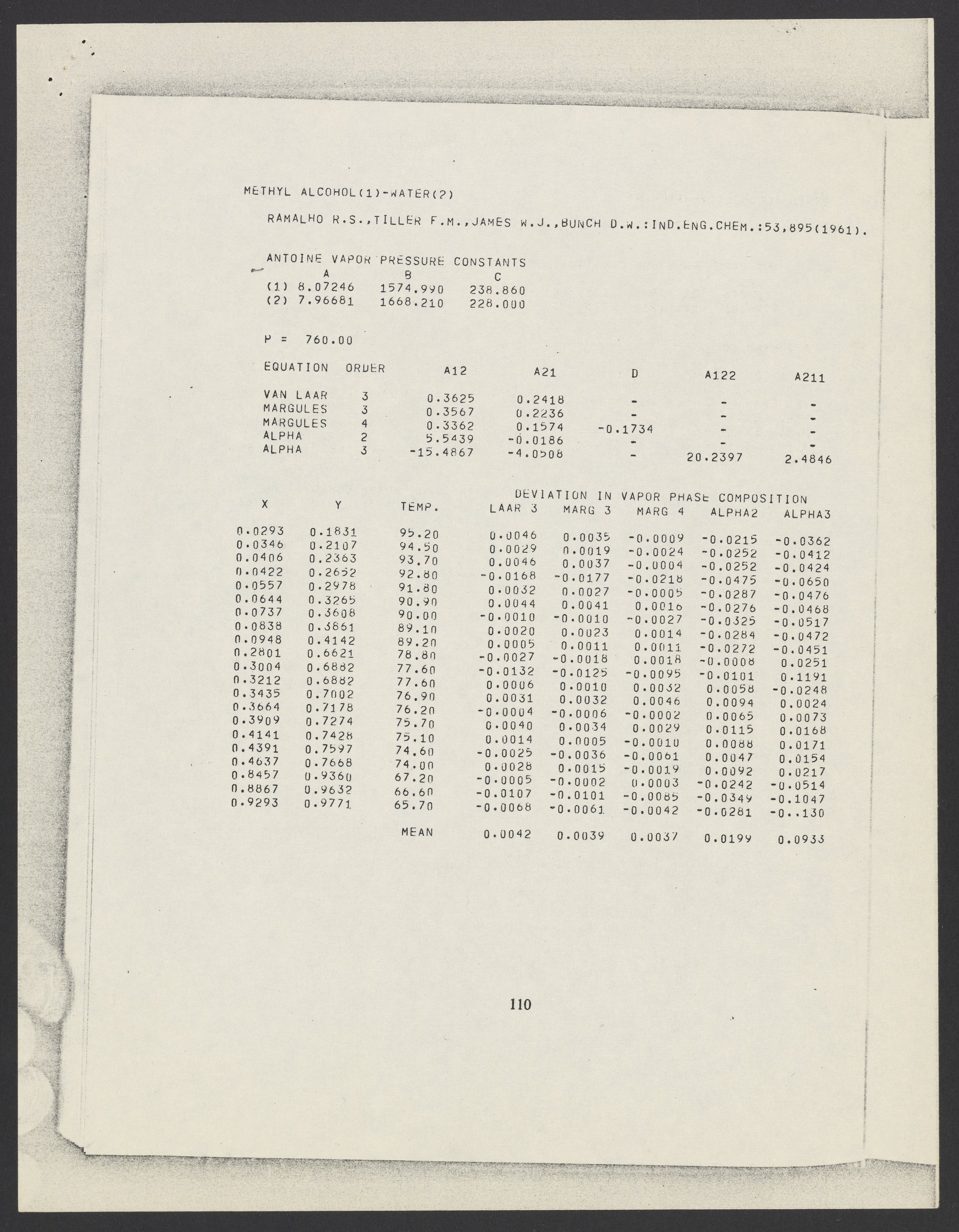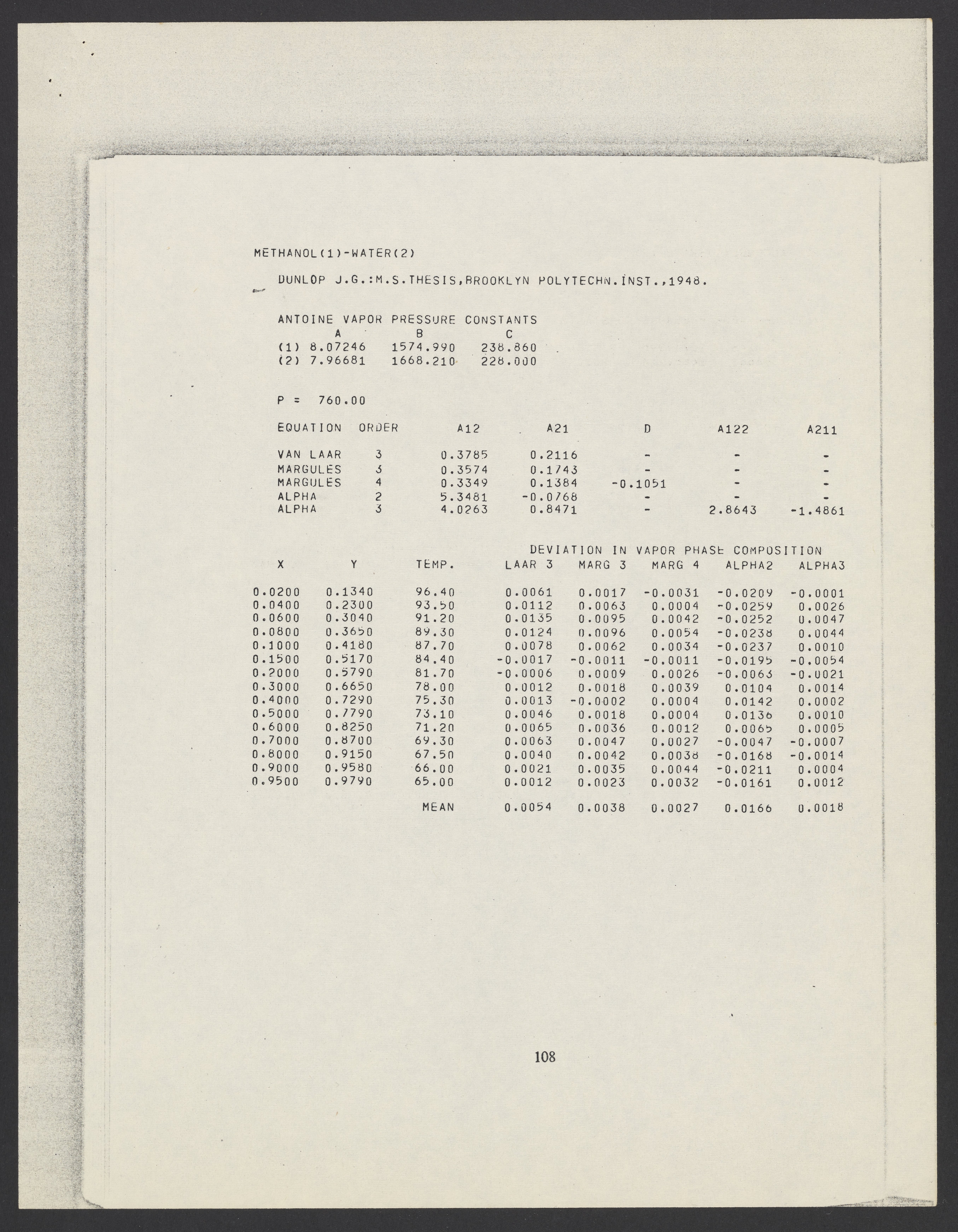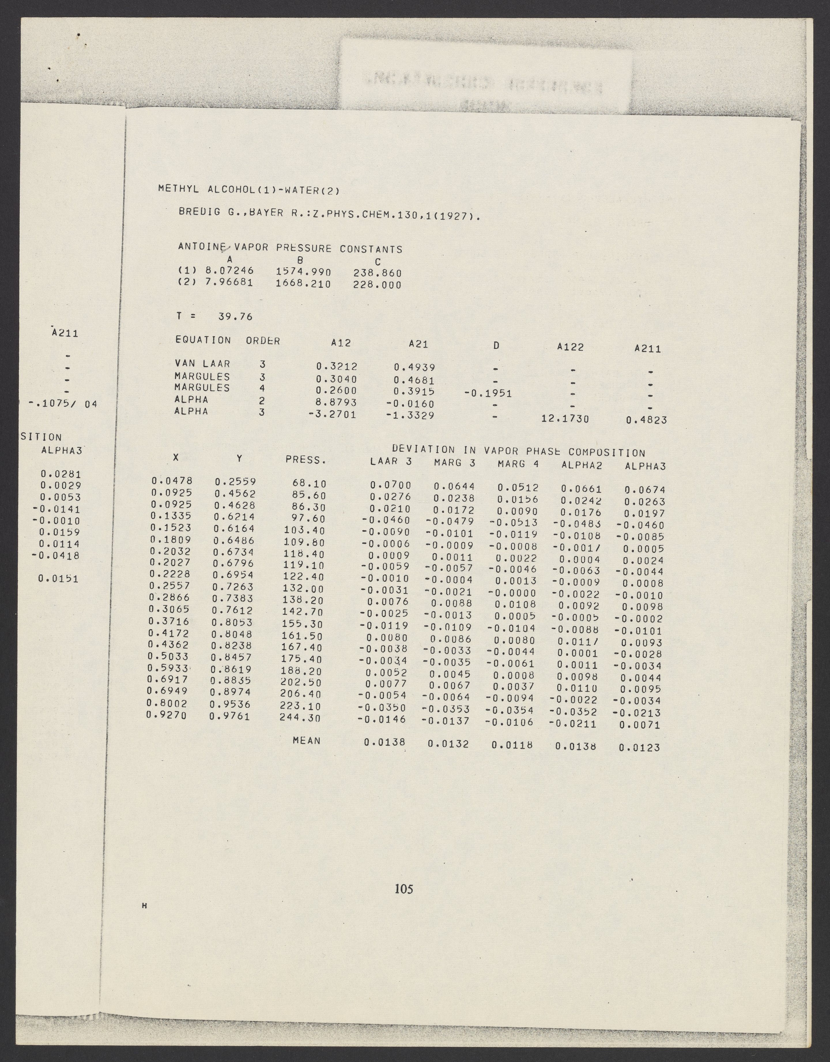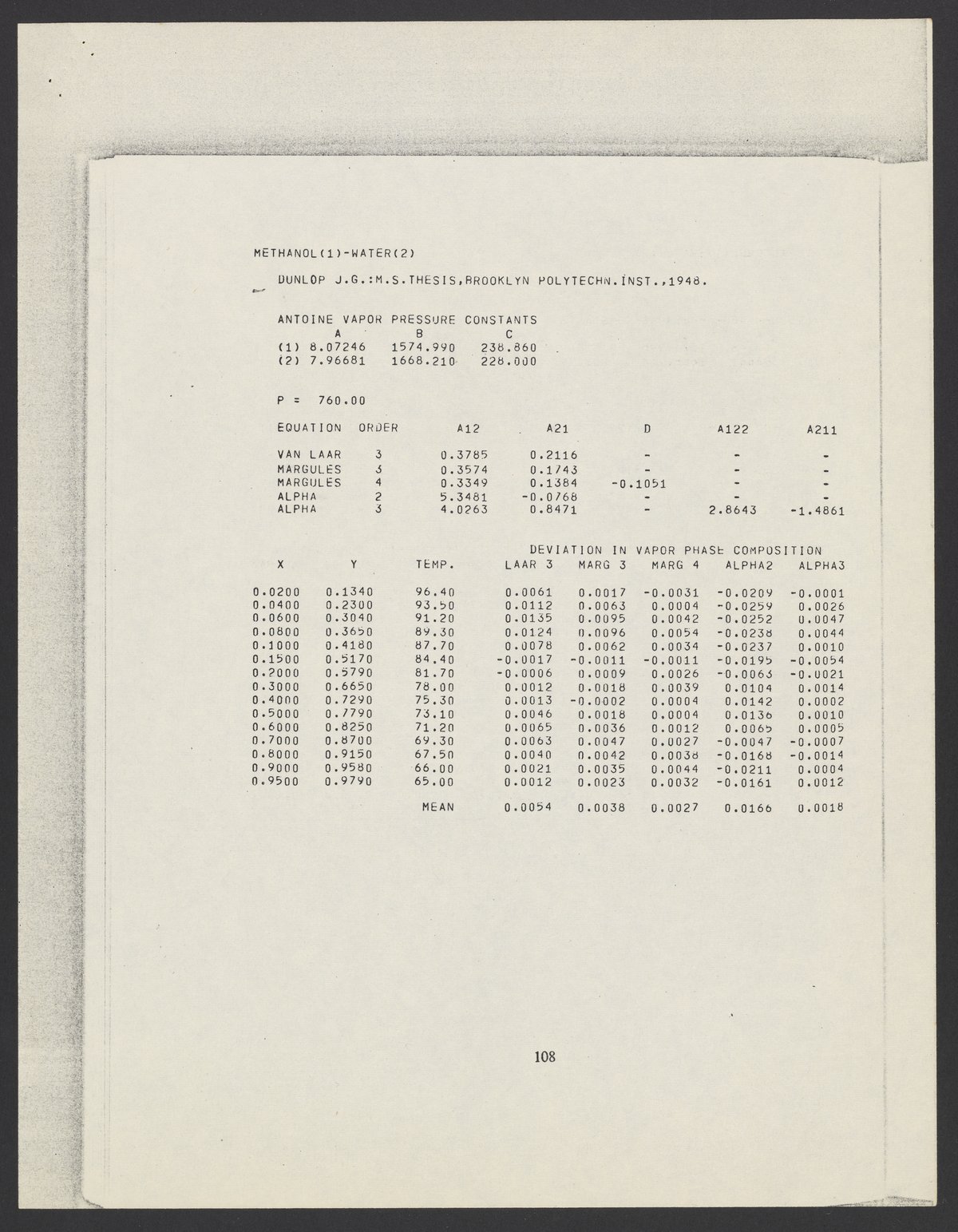 Small JPG1200 x 1530px — 185 KBLarge JPG2880 x 3672px — 1.3 MBFull-sized JPG5408 x 6896px — 4.9 MBOriginal fileTIFF — 5408 x 6896px — 107 MBPhotocopies of a selection of pages from a 1966 publication containing direct experimental data on vapor-liquid equilibrium in separation systems. The copies include datasets published in 1927 by Georg Bredig (1868-1944) and Richard Bayer (1883-1972) in their scientific paper Die Dampfdrücke des binären Systems Methylalkohol -Wasser in Zeitschrift für Physikalische Chemie, volume 130U, issue 1.