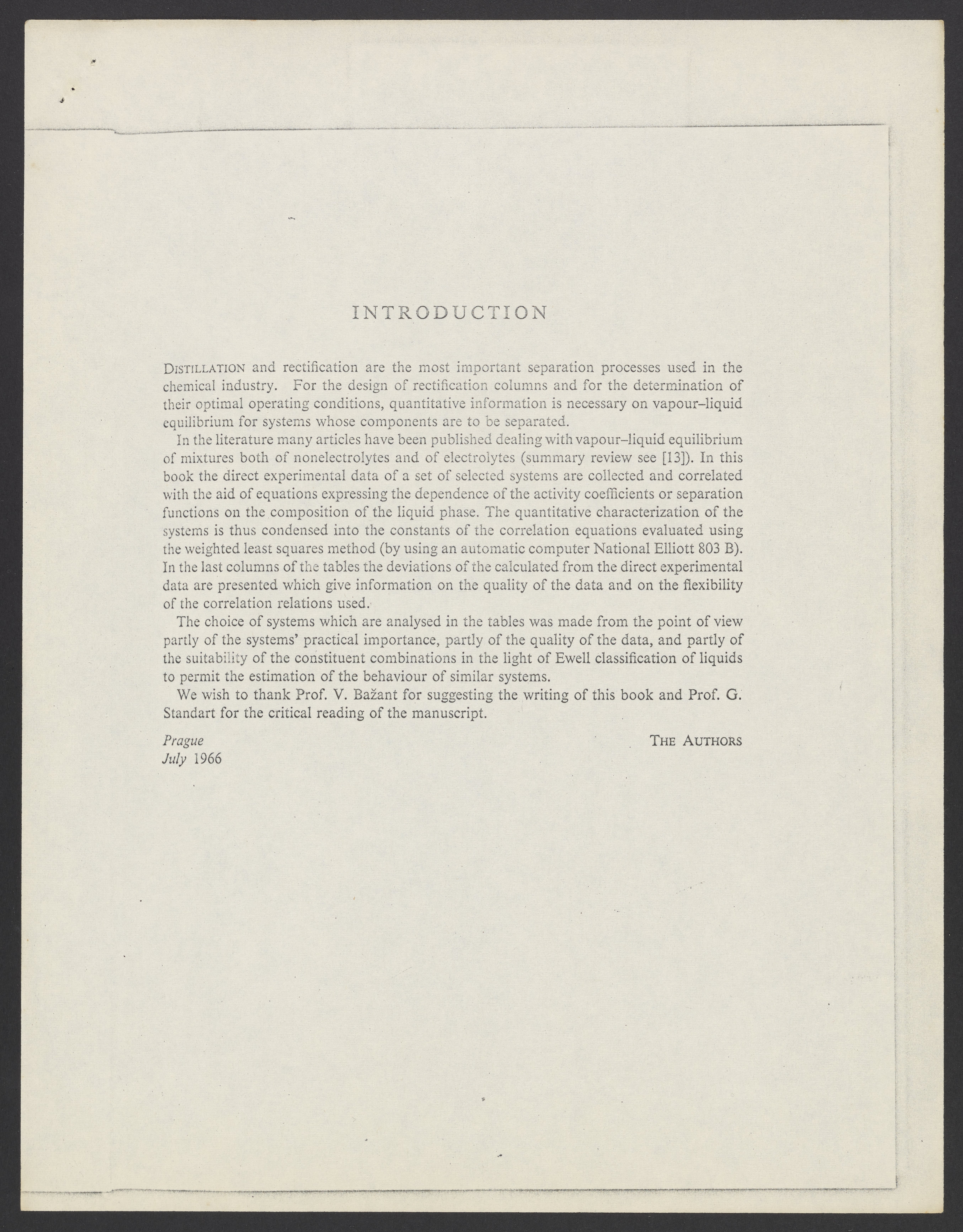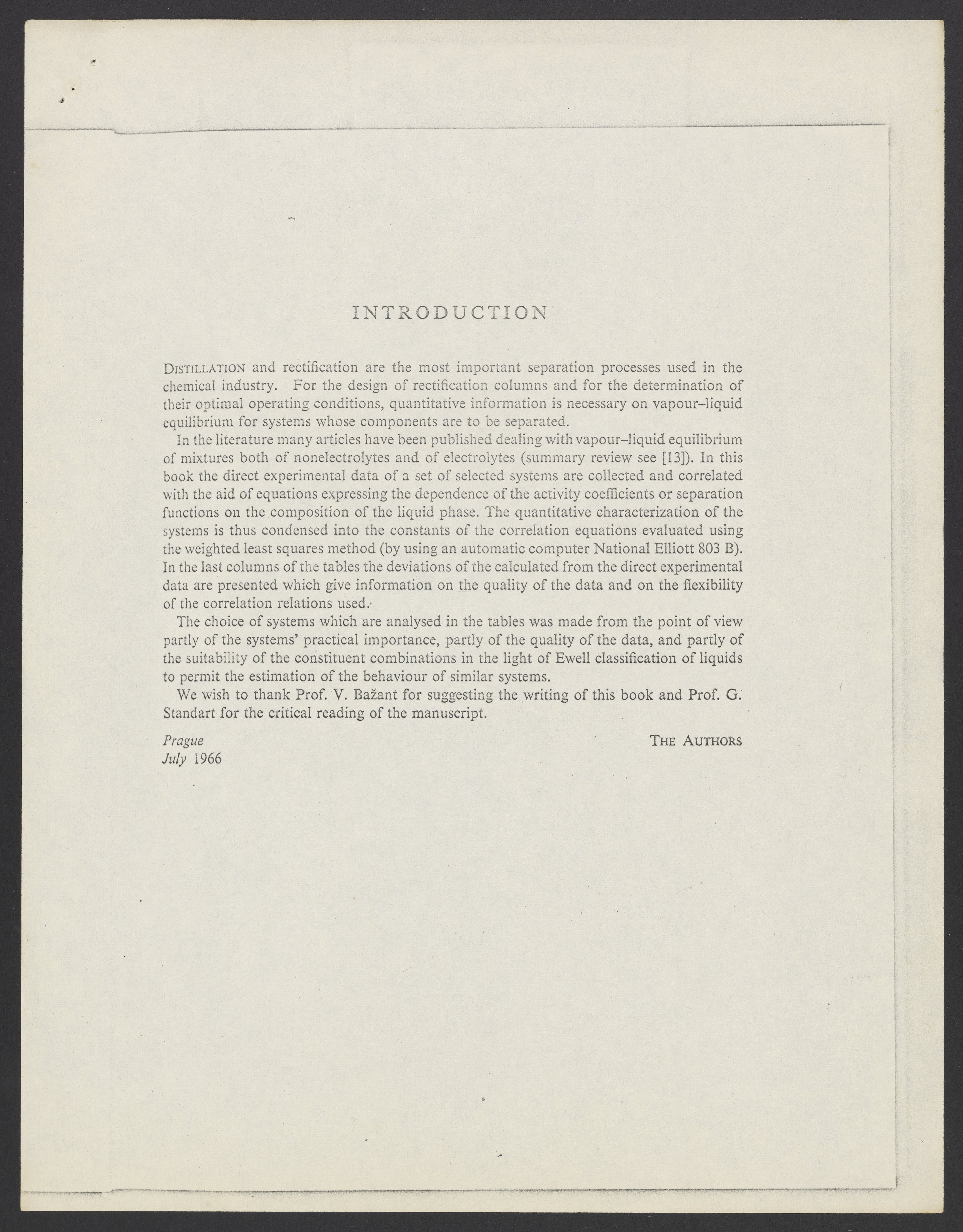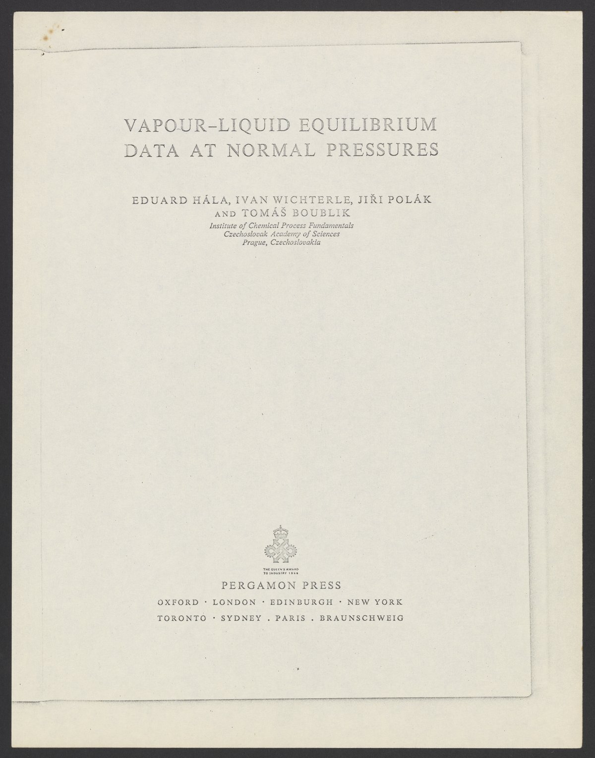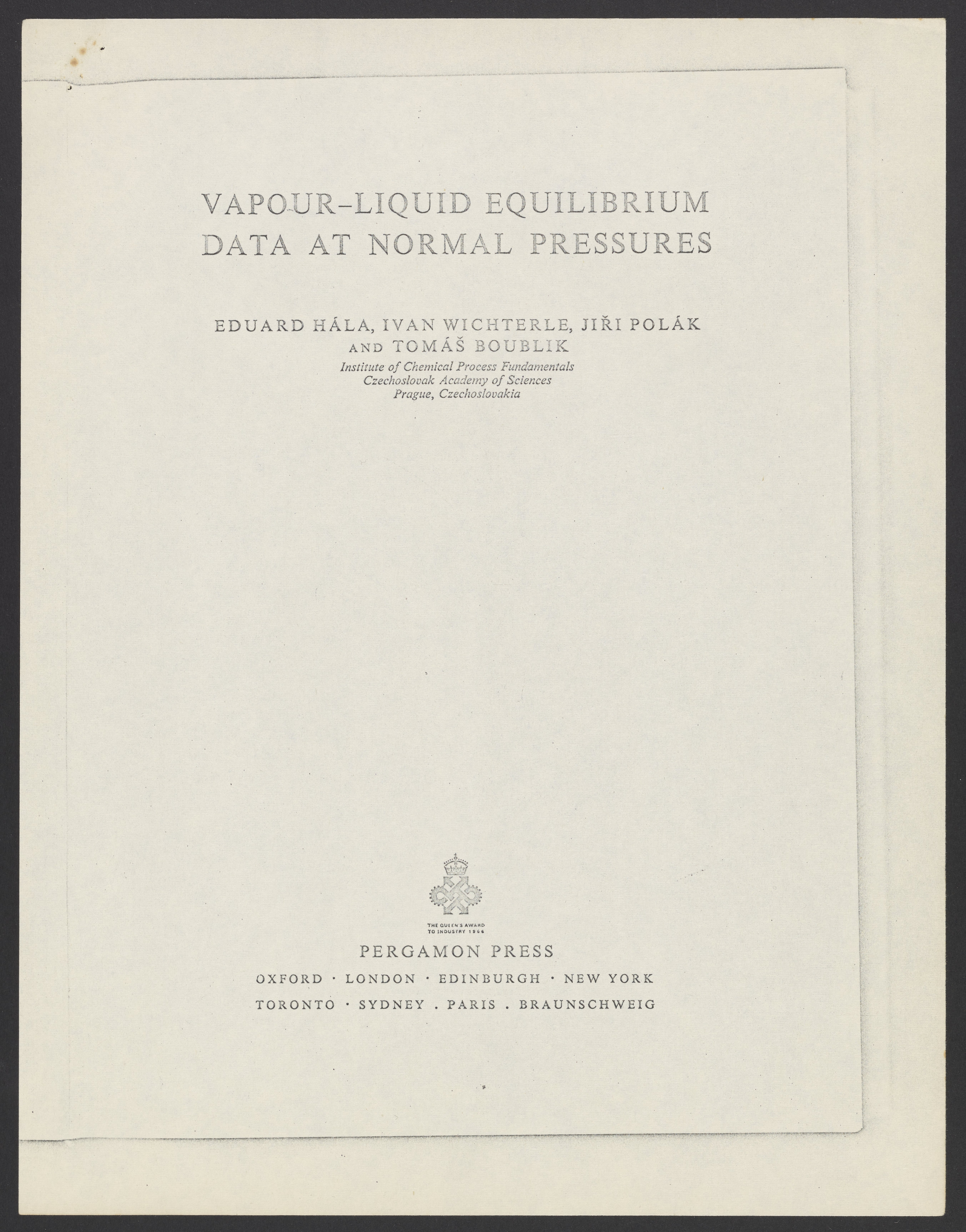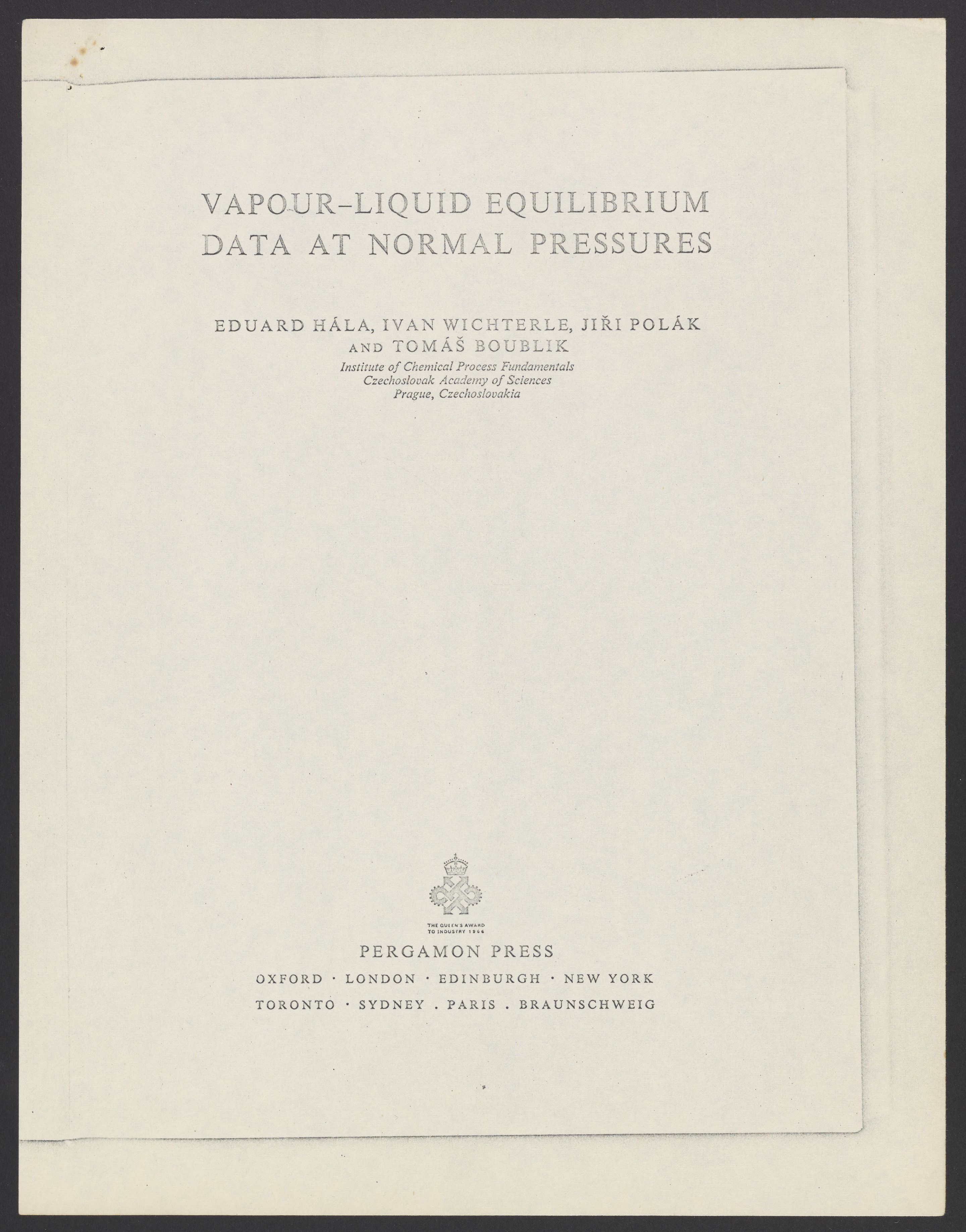“Vapour-Liquid Equilibrium Data at Normal Pressures.” Prague, Czech Republic, 1966. Papers of Georg and Max Bredig, Box 10, Folder 33. Science History Institute. Philadelphia. https://digital.sciencehistory.org/works/uawgd9o.