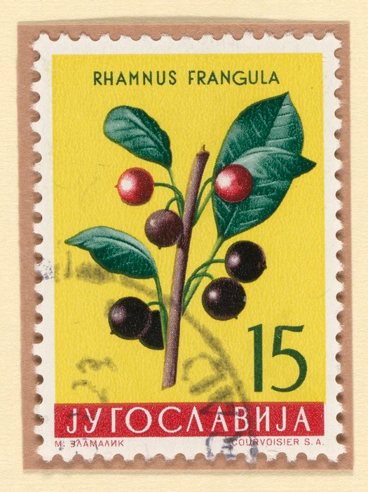 1959 postage stamp from Yugoslavia featuring an illustration of alder buckthorn (Rhamnus frangula). Its bark has a variety of uses. As early as the 2nd century AD, buckthorn was believed to protect against witchcraft, demons, and other forms of folk magic. The bark has also been used as a strong herbal laxative.