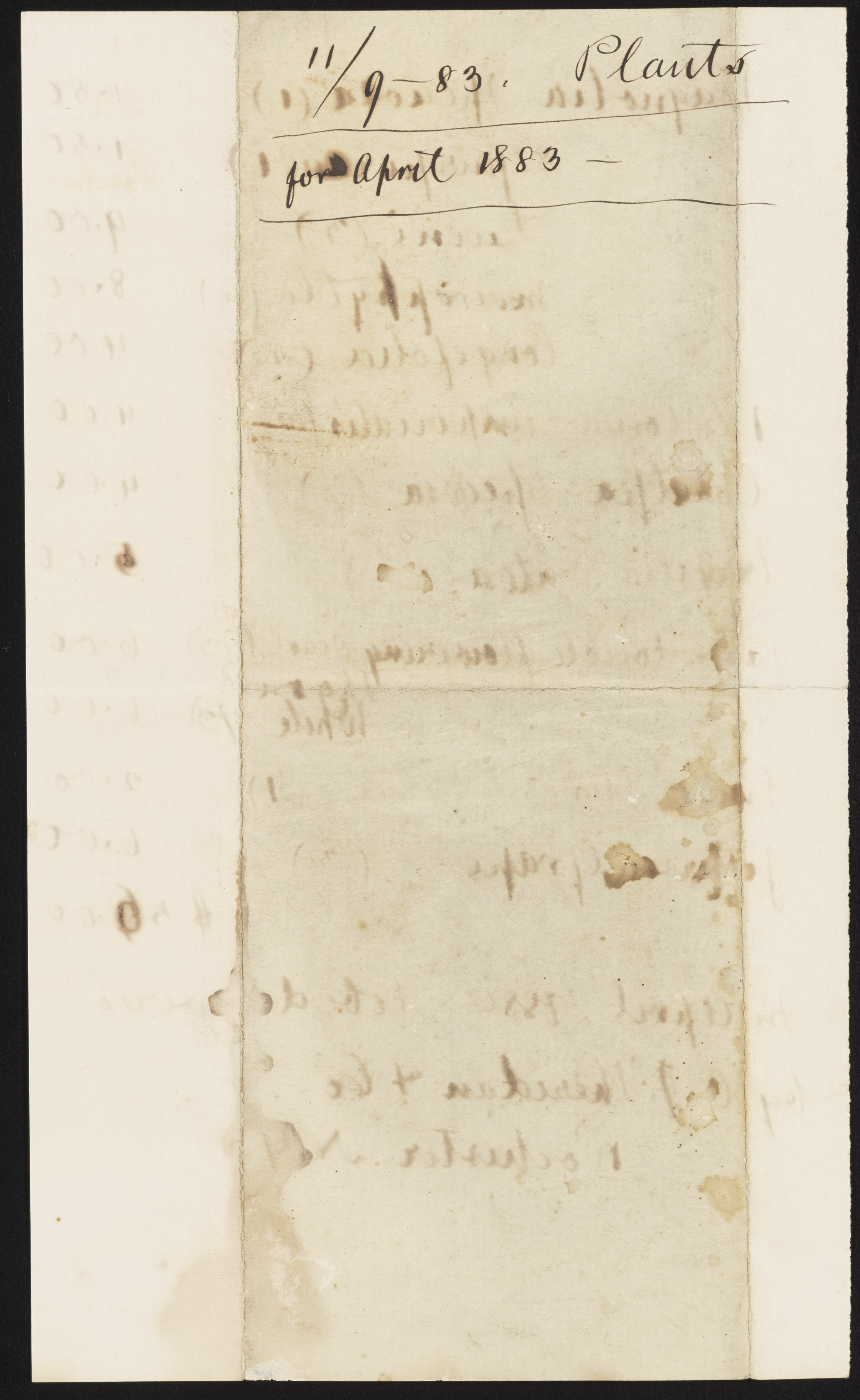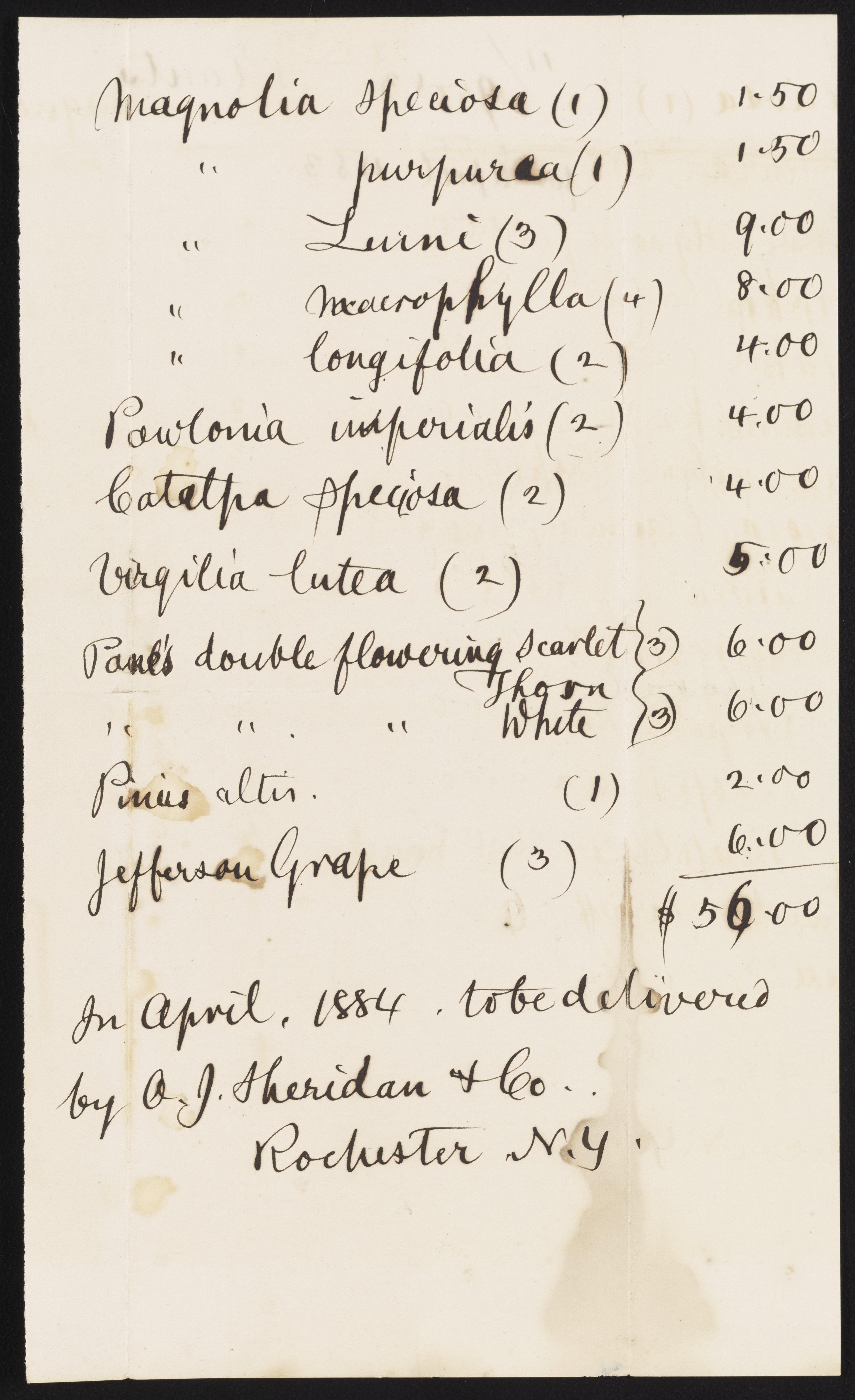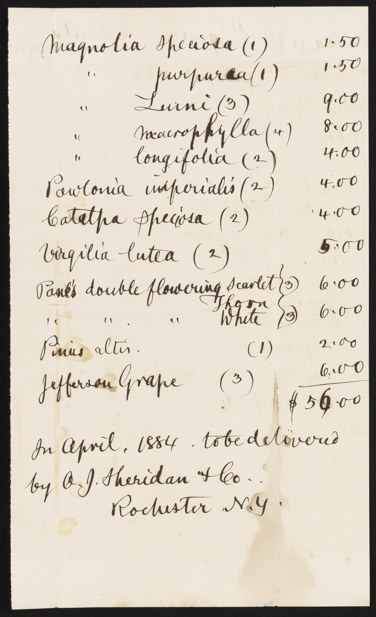 Booth, James Curtis. “List of Plants to Be Delivered by O.J. Sheridan & Co. in April 1884,” November 9, 1883. Papers of James Curtis Booth, Box 2, Folder 10. Science History Institute. Philadelphia. https://digital.sciencehistory.org/works/ucsst5f.